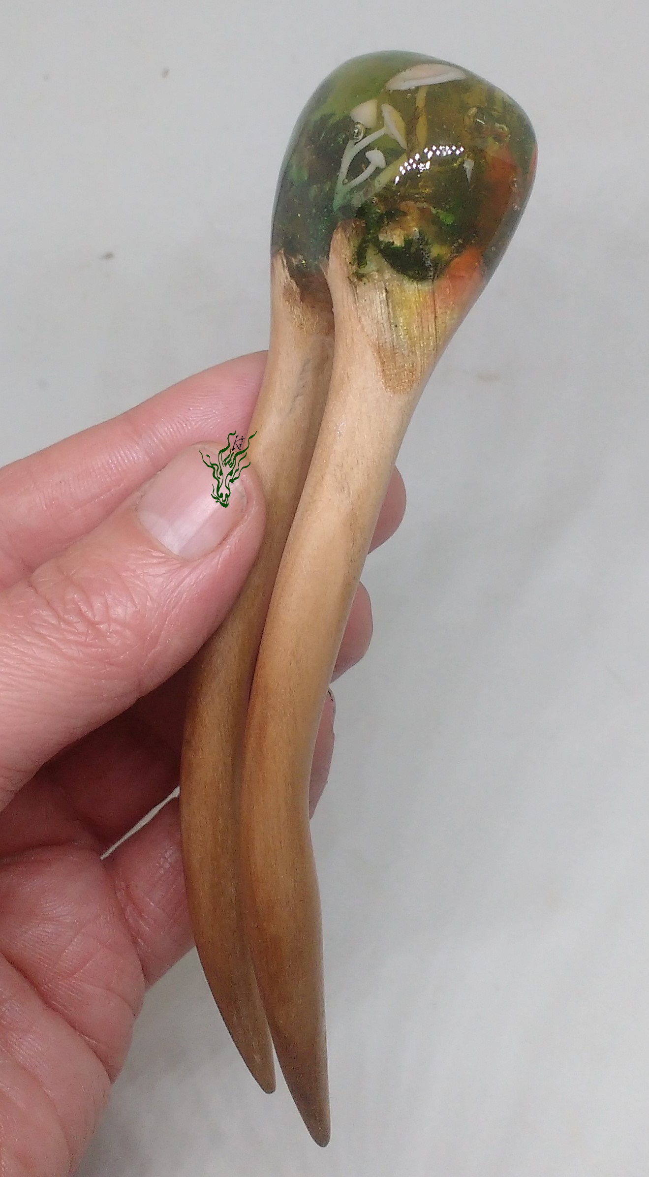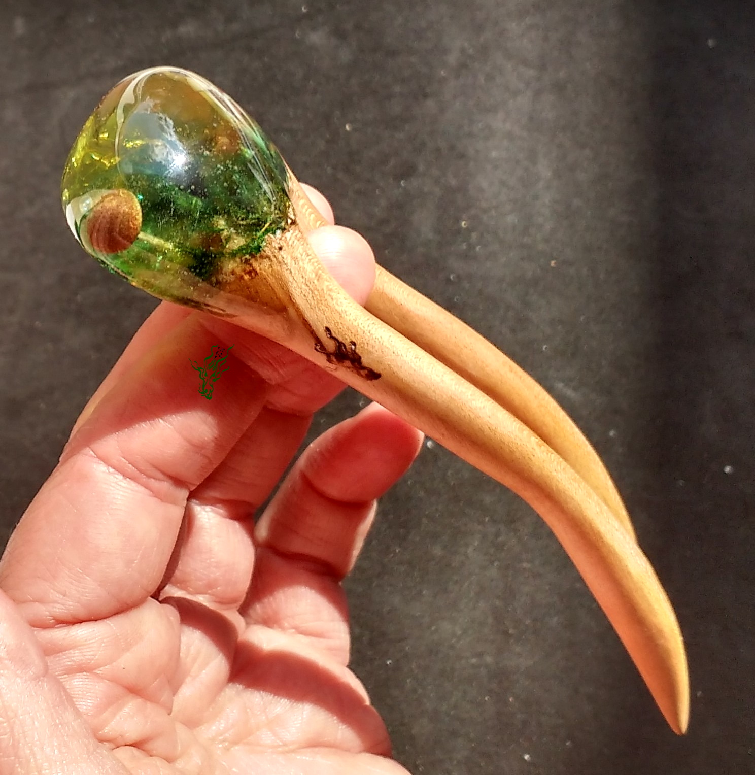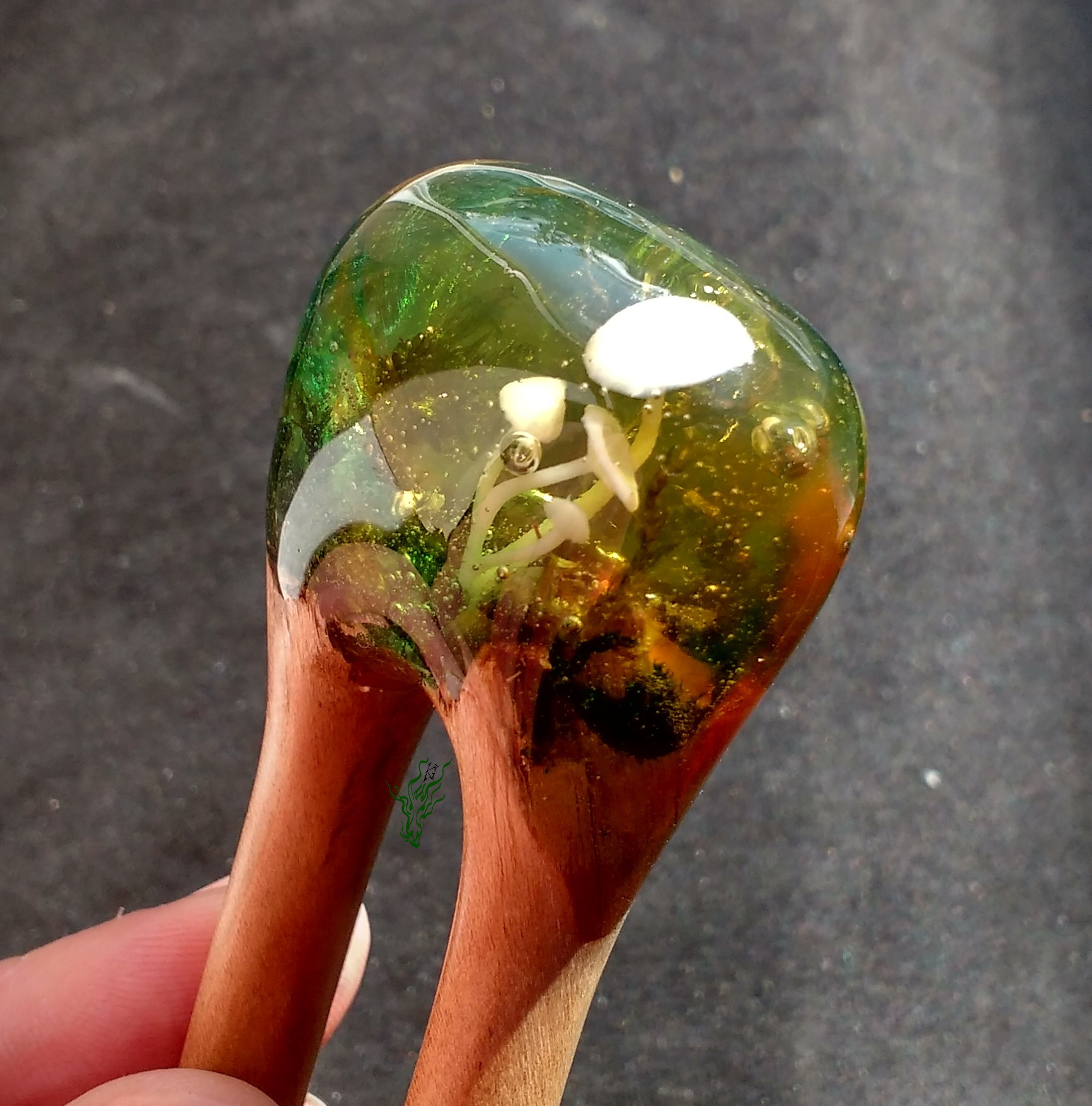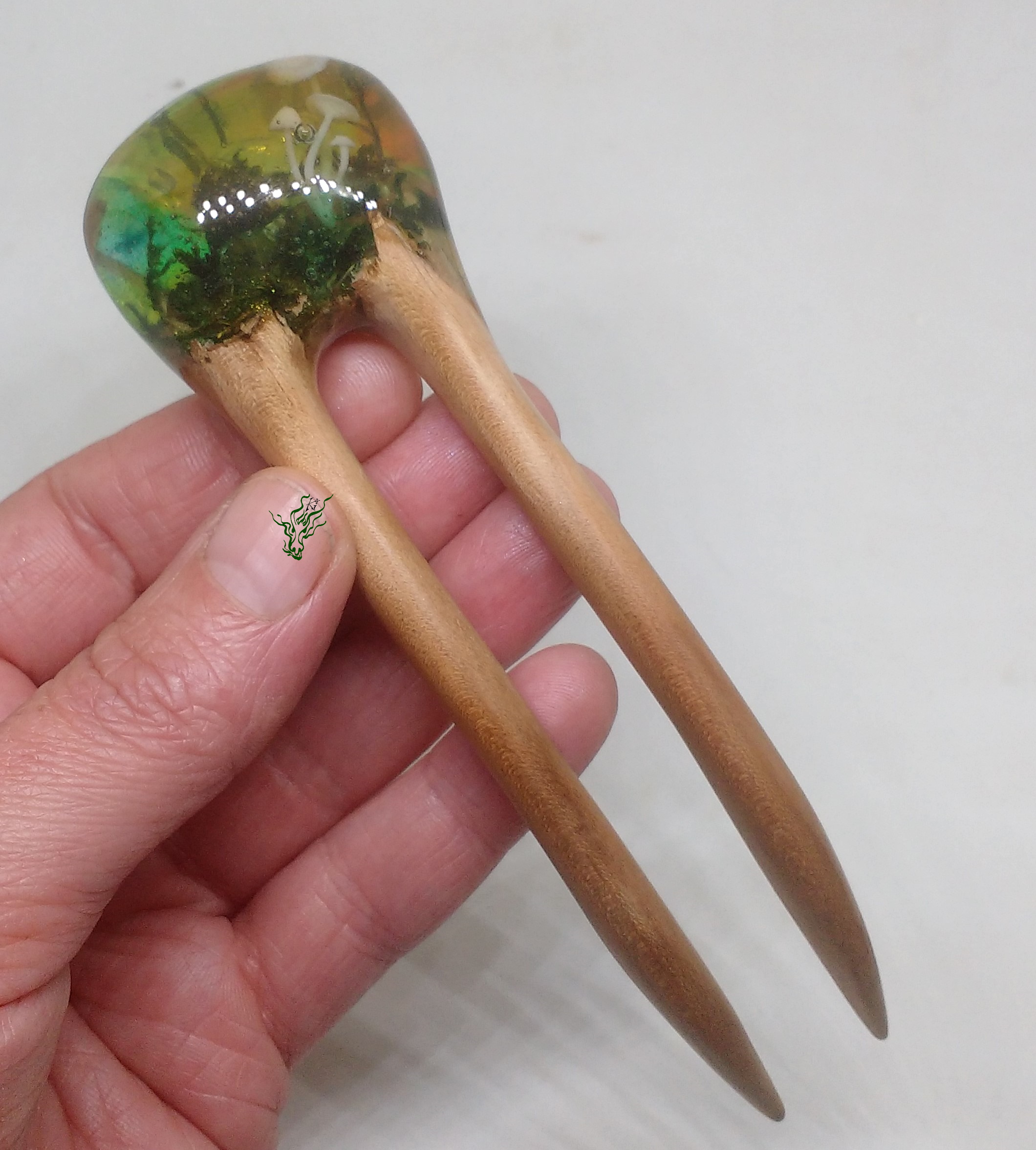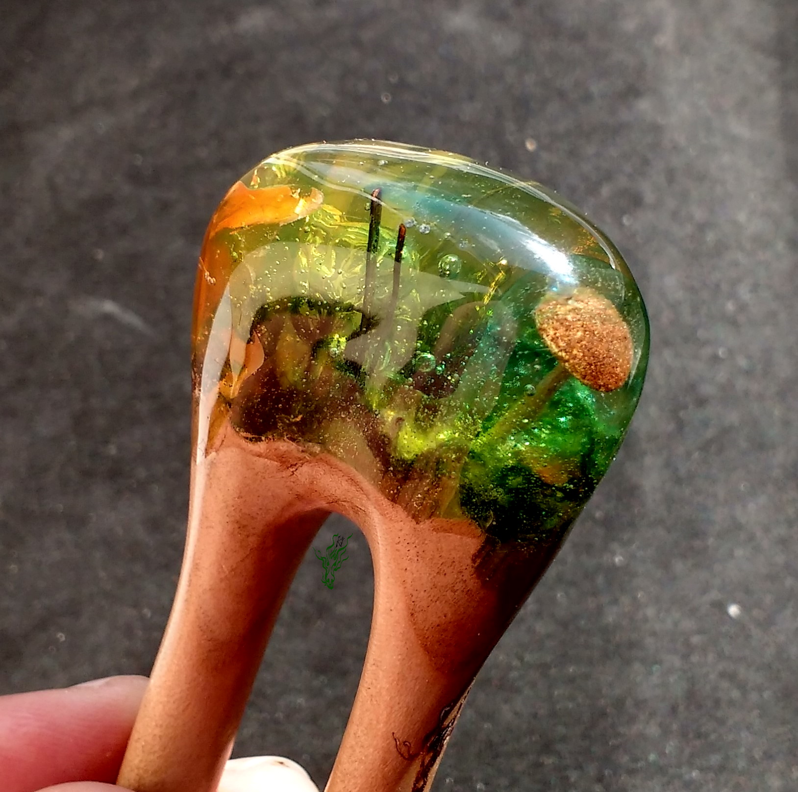 Aufregende Herbstlandschaft mit Pilzen & Wald & Blässchen in einer Kuppel in grün-rot-gelb. Und das auf seidenglattem KirschHolz. Die Form schmiegt sich an deinen Kopf – durch die Kopfform- Rundung für optimale Bequemlichkeit. Die kleinen Nöpsies am Zinkenende geben sicheren Halt.