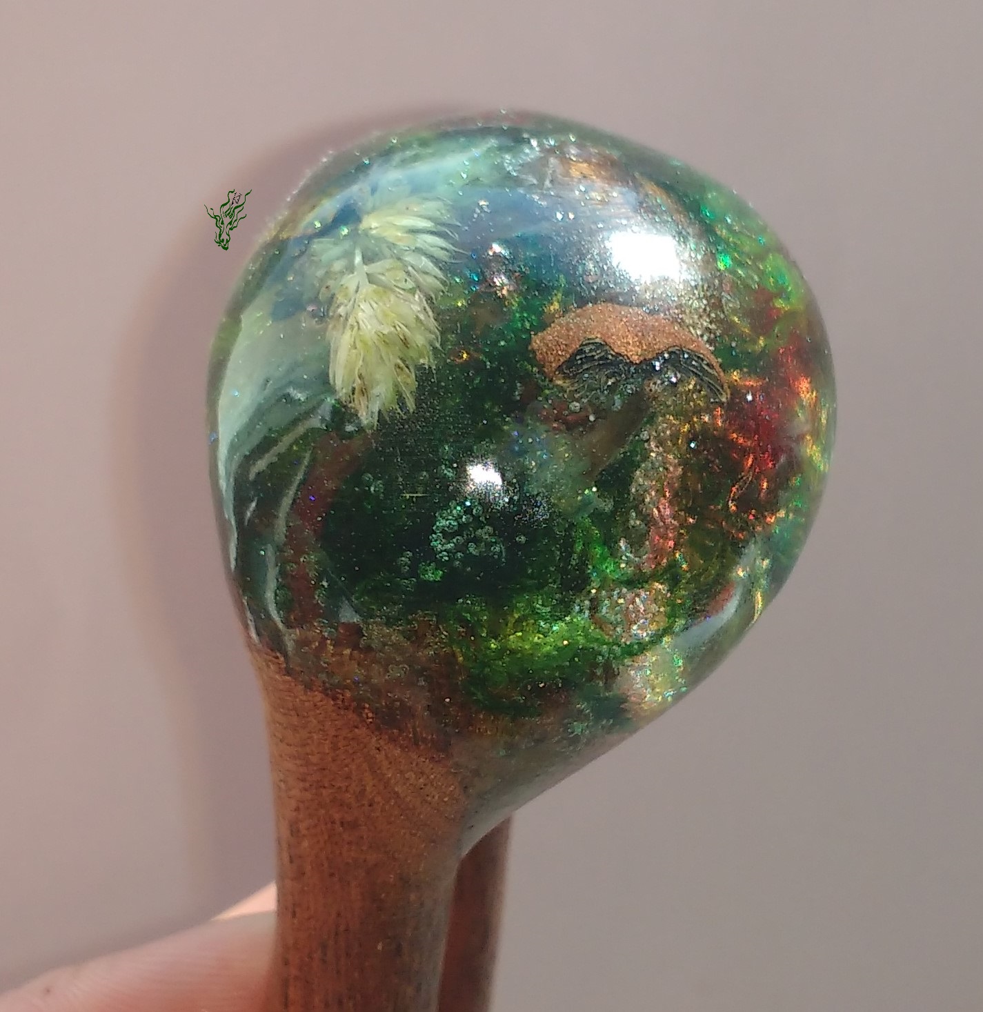 Aufregende Herbstlandschaft. Und das auf herrlich abwechslungreichem MerantiHolz. Die Form schmiegt sich an deinen Kopf – durch die Kopfform- Rundung für optimale Bequemlichkeit. Die kleinen Nöpsies am Zinkenende geben sicheren Halt.