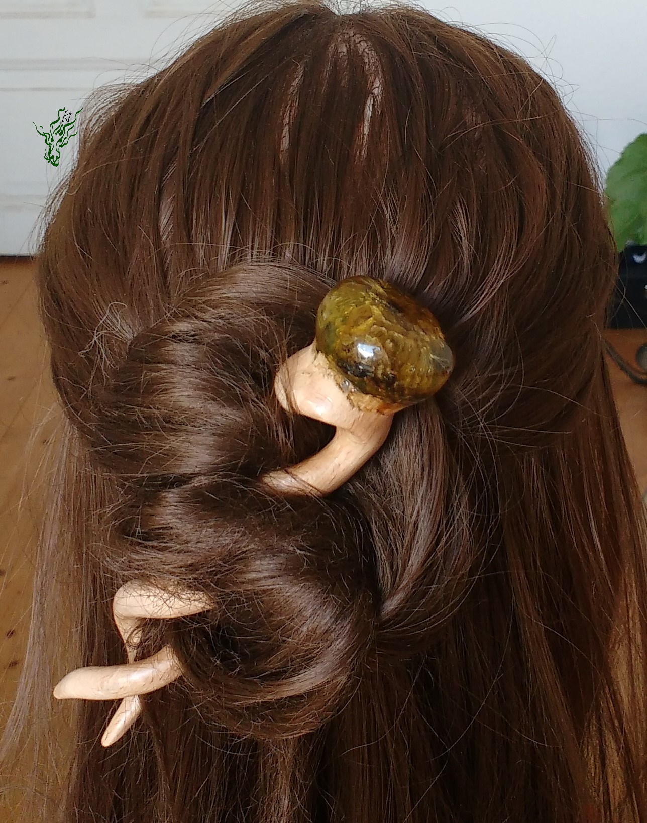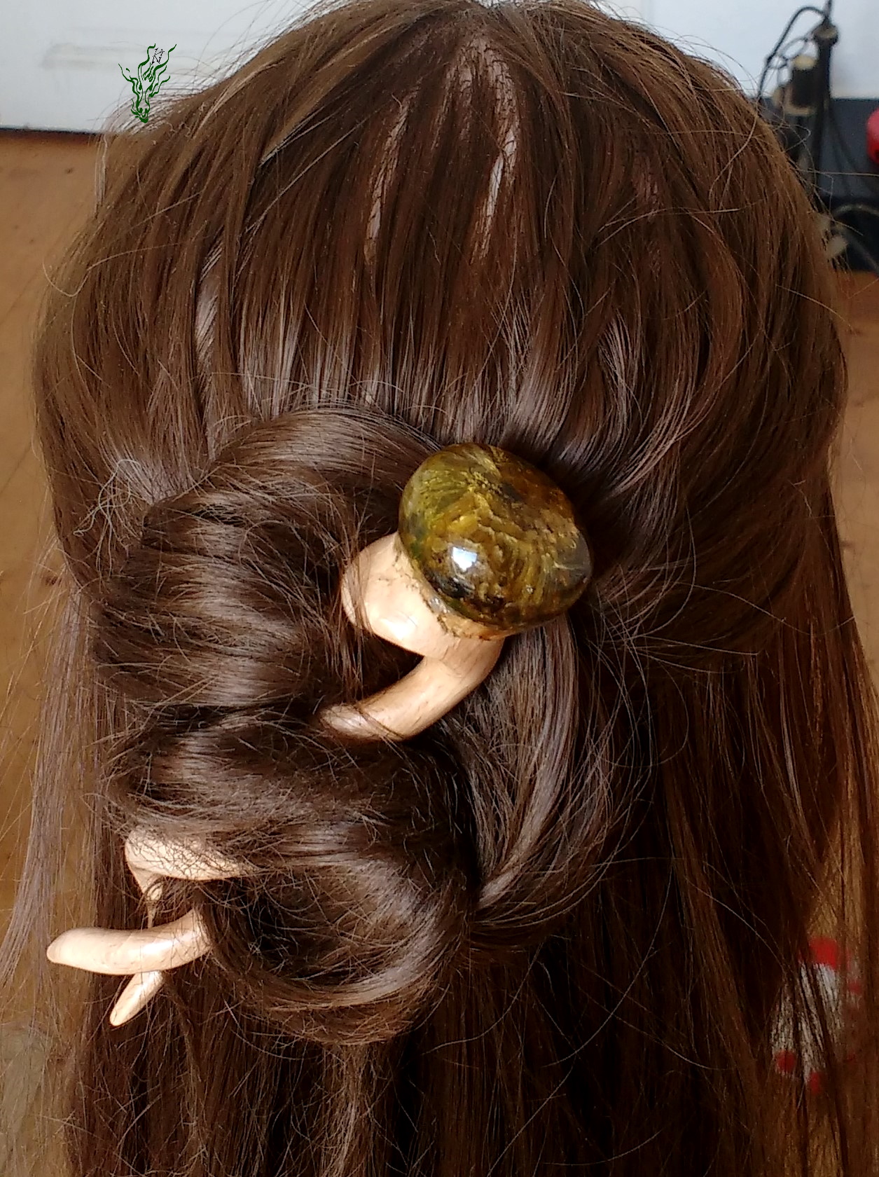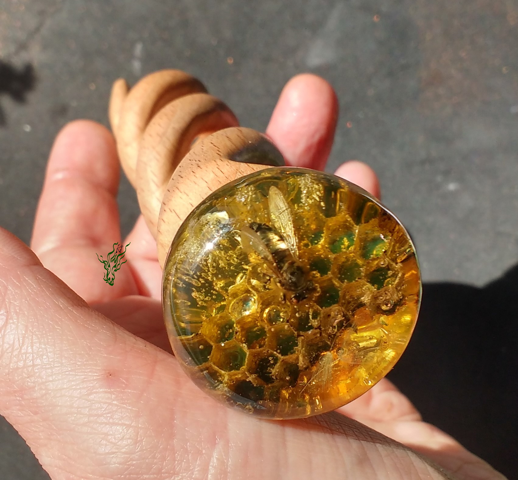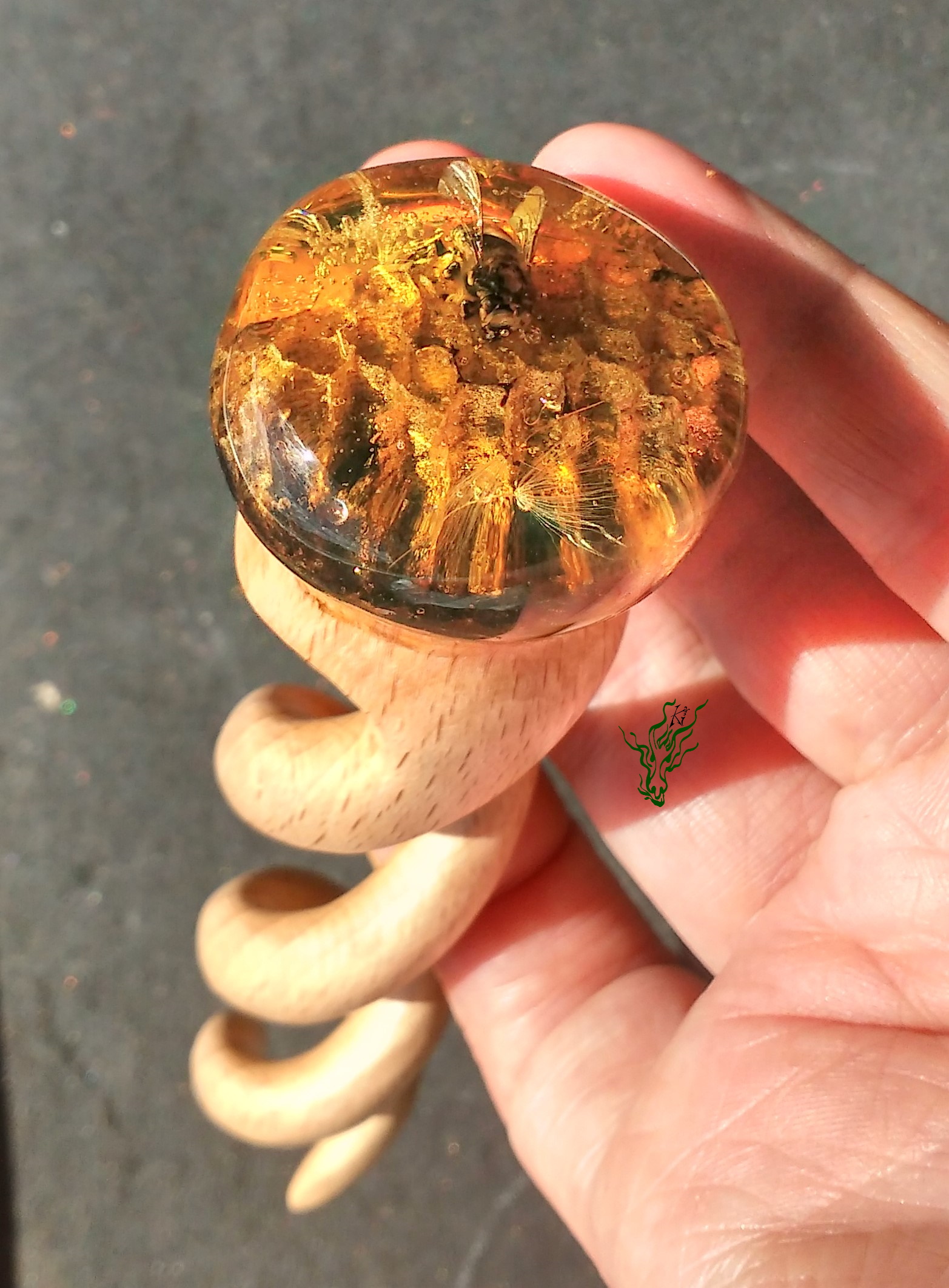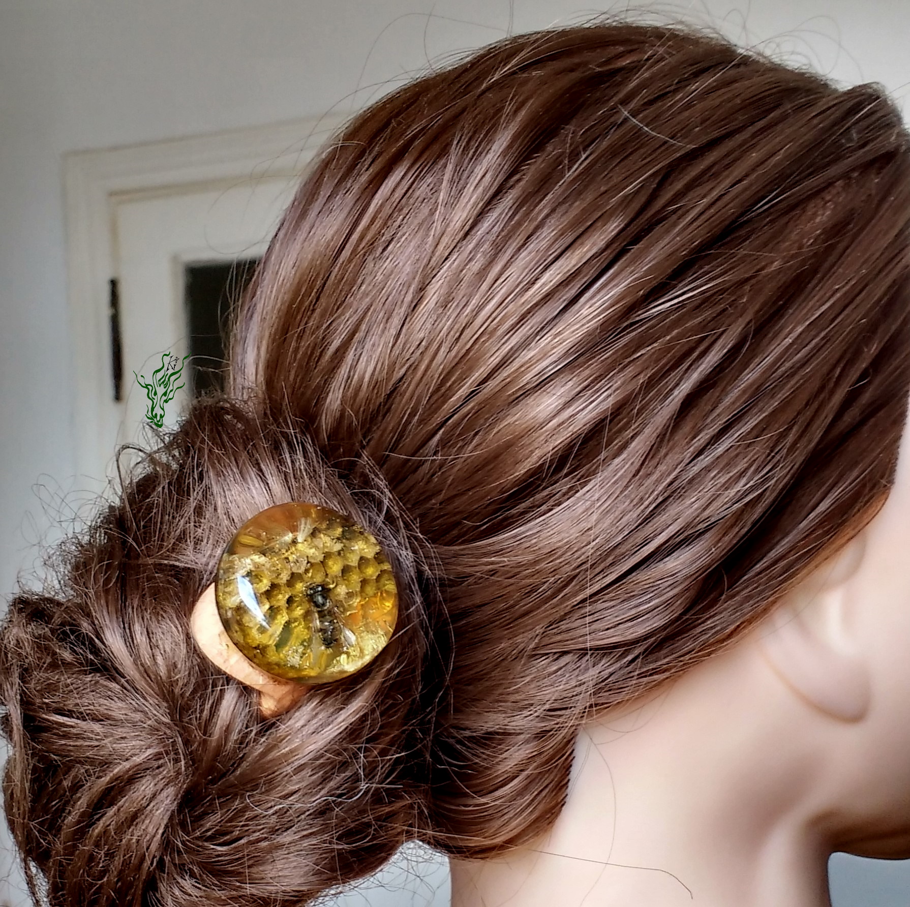 Ein totes Bienchen aus unserem Bienenvolk respektvoll gebettet auf Waben in honigfarbenem Resin und so konserviert, schmückt den Topper dieser dreidimensionalen Haarforke. Die Vorteile meiner Helix- Haarforken habe ich dir hier schon genauer erzählt. Die Helix von *Honig* ist rechtsdrehend, also besonders gut für RechtshänderInnen geeignet. Aber auch LinkshänderInnen sollten keine Probleme haben, sie von links reinzudrehen. Die Spirale ist gerade und spannt so nicht auf mein Dutten. Ich finde das bequemer als konische, schmal zulaufende Formen.