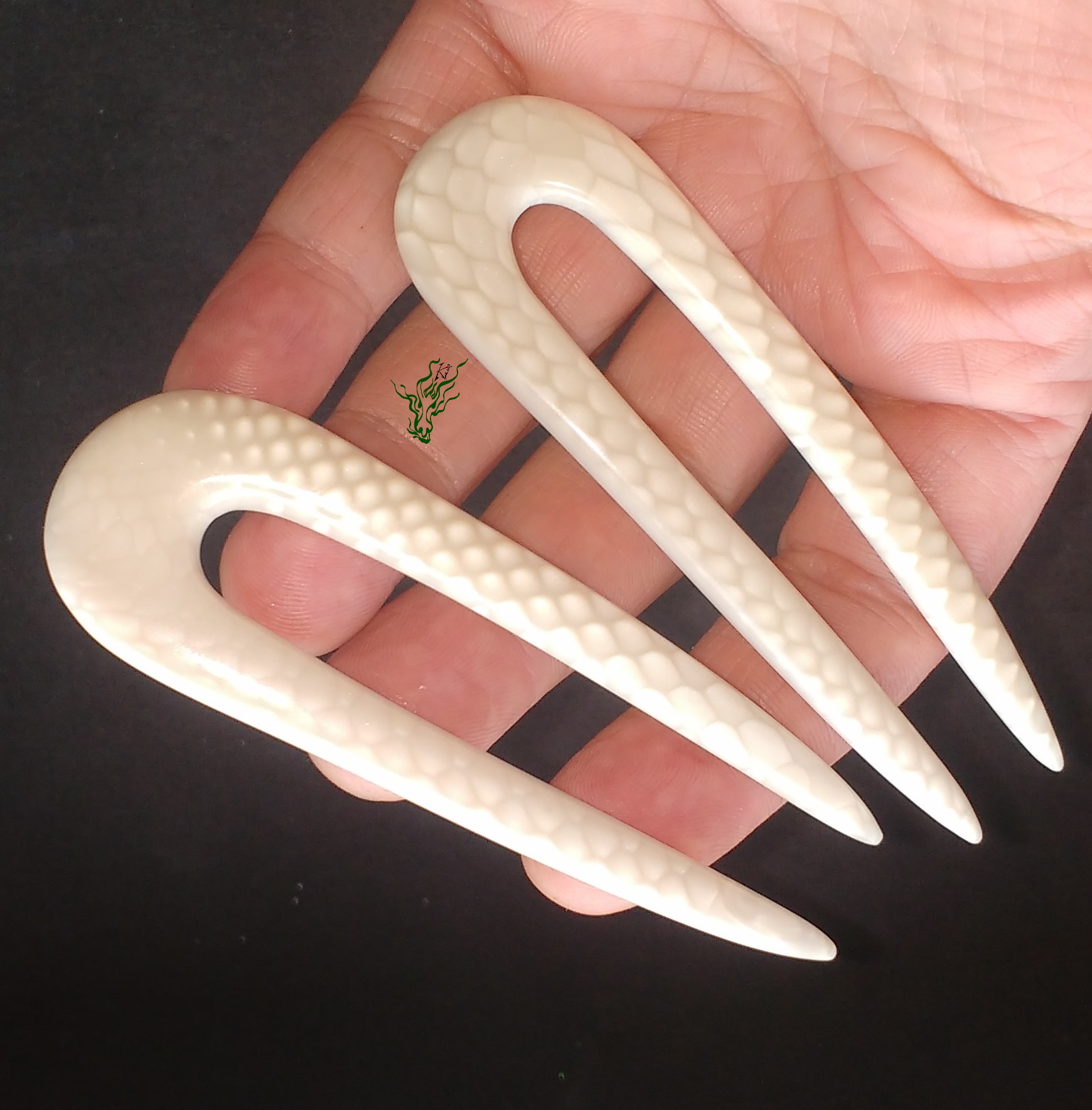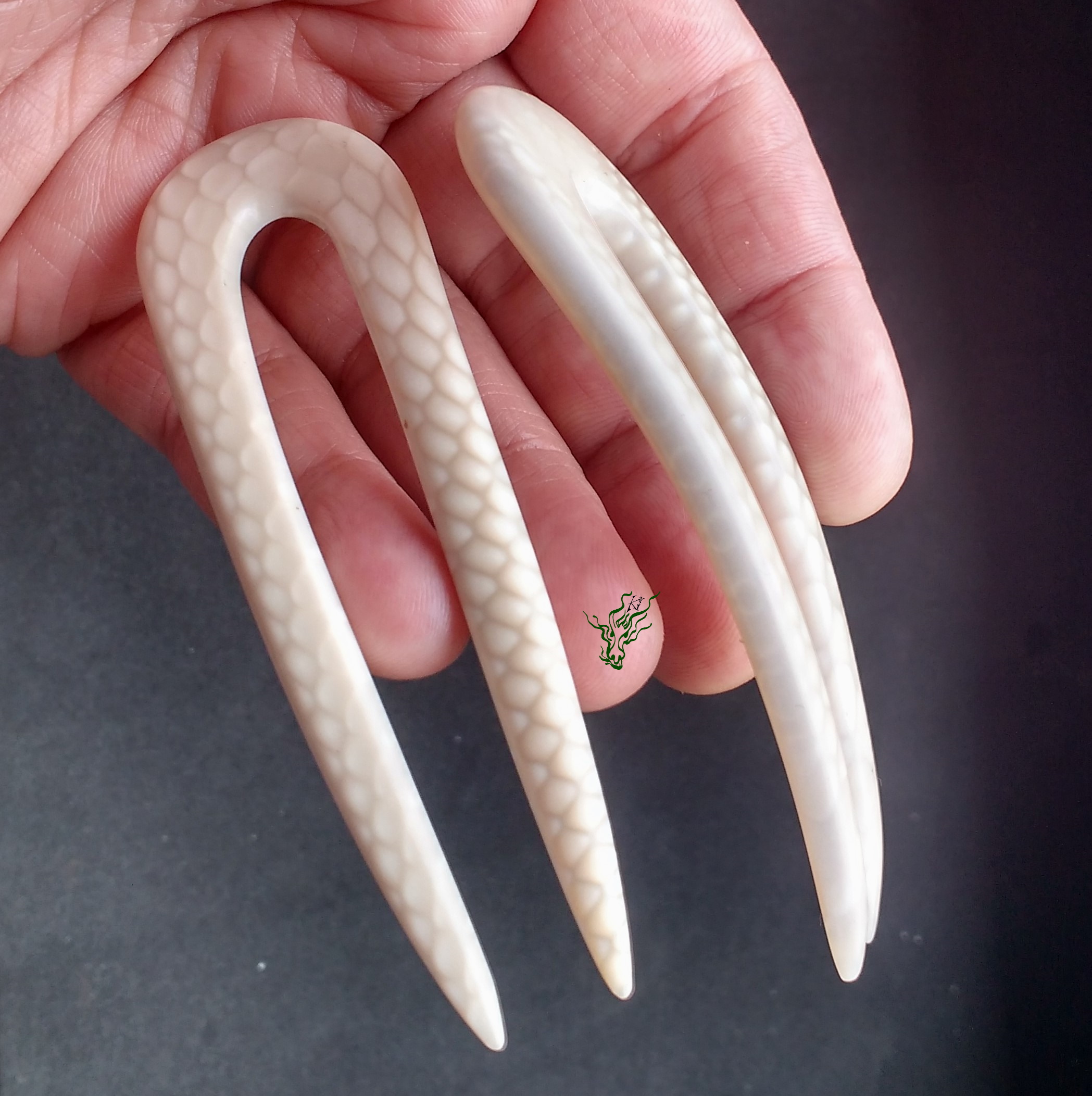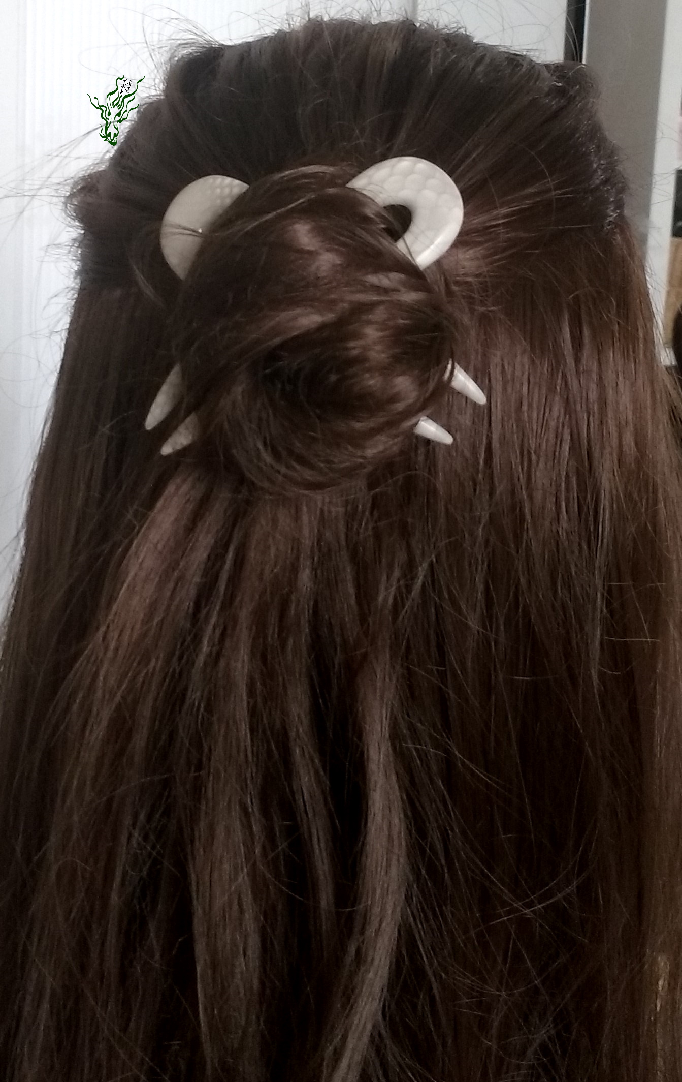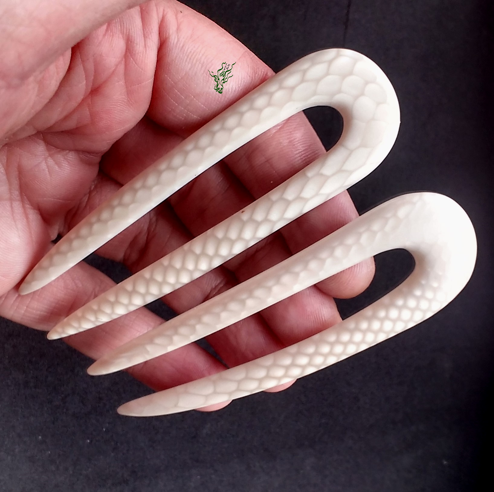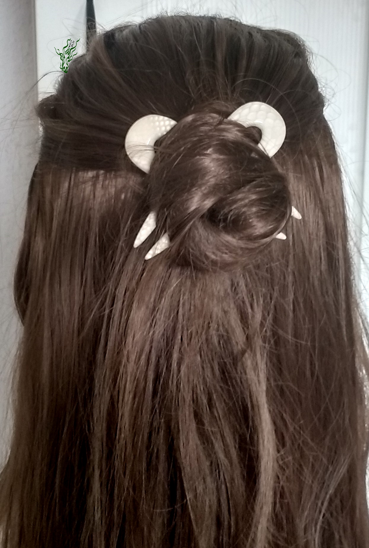 Gelegentlich macht es mir Spaß mit Acryl zu spielen und habe in meinem Fundus  dieses elfenbeinfarbene Schlangen/Drachen  Acryl mit perligem Schimmer  gefunden.   Die  Schuppen  kommen mega raus auf den beiden  kleinen Haarforken.  In  Kopfform  gebogen  und  abgerundet.