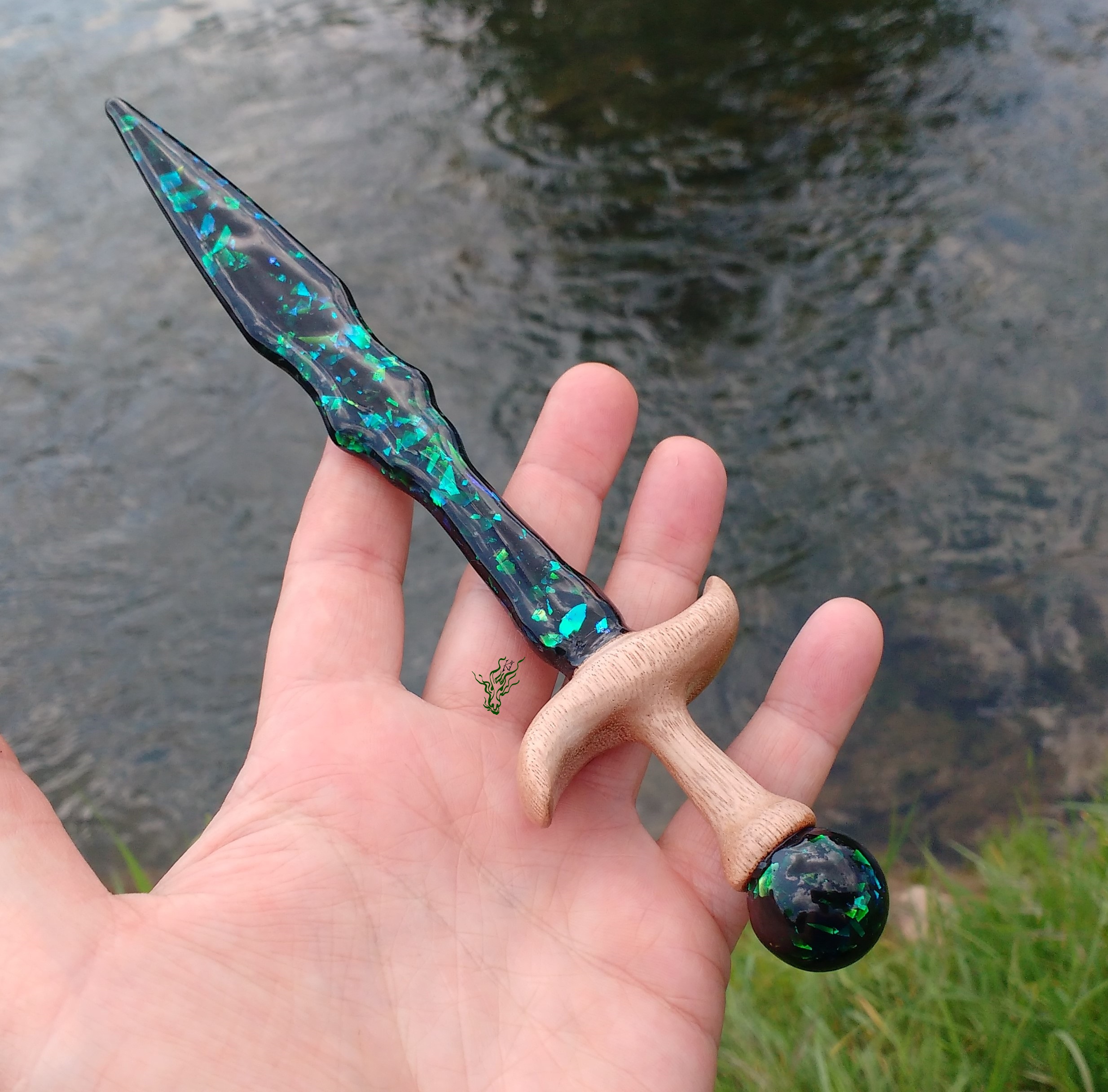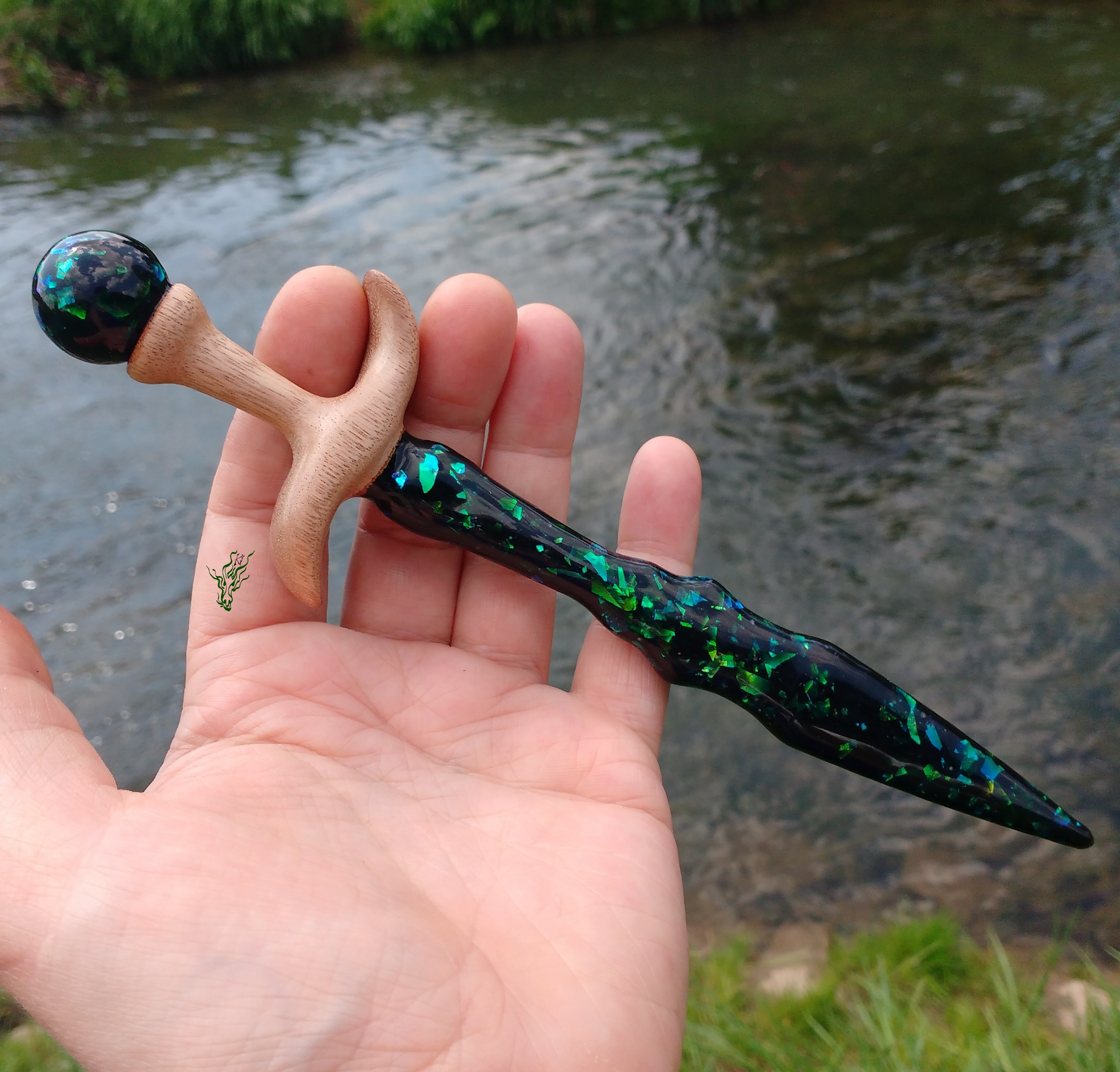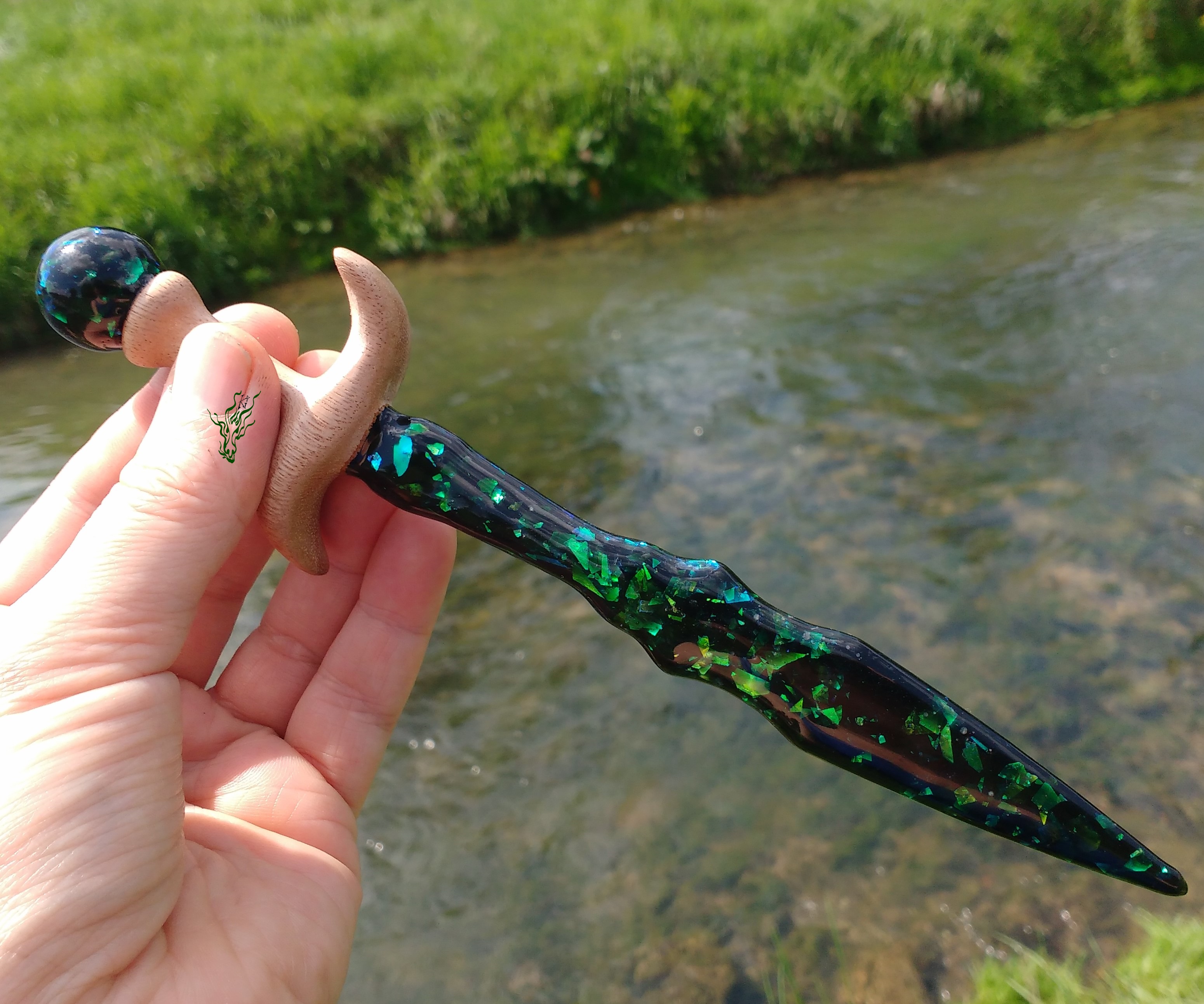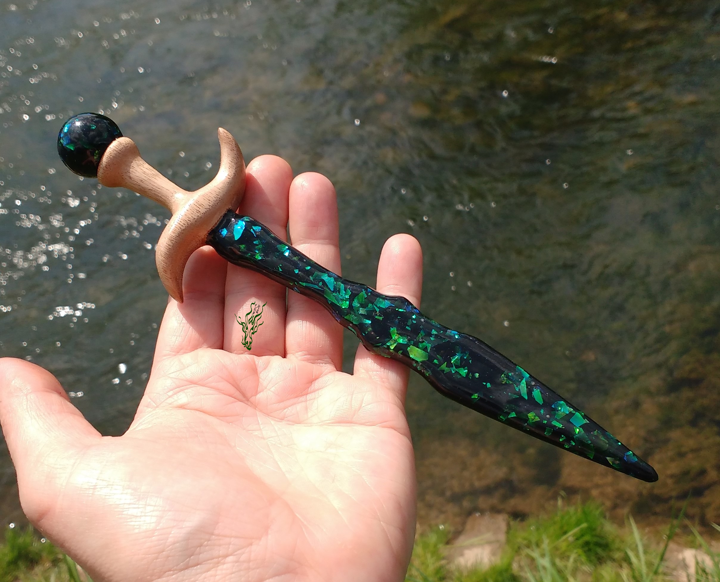 Haarschwert mit Abalone- artiger  Klinge &  geschwungener Griff aus  einem upcycelten Gartenstuhl,  vielleicht MerantiHolz.  Die Farben im schwarzen  Resin  changieren  je nach Lichteinfall von  blau zu grün. Und natürlich ist  hier  alles  angerundet &  nicht scharfkantig.