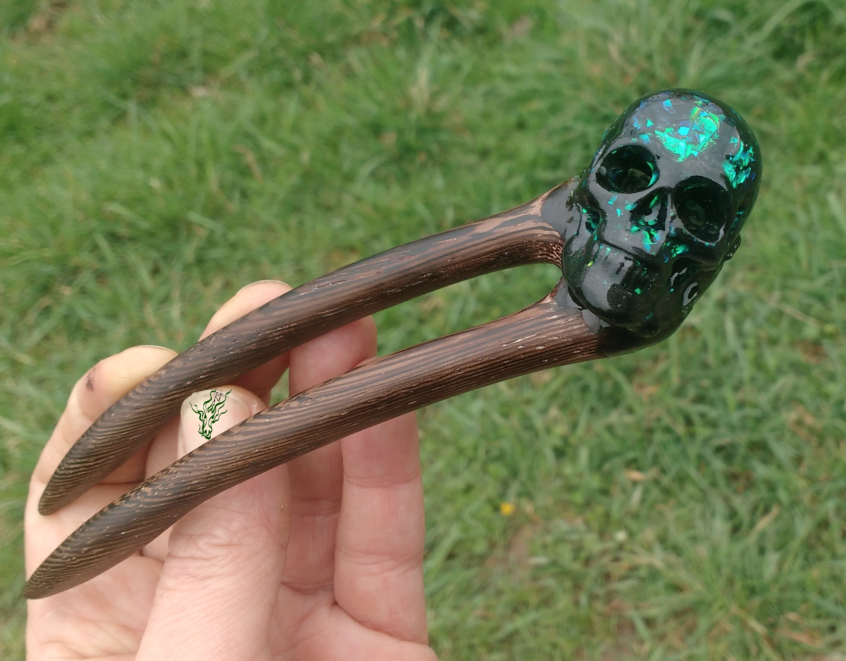 Herrlich dunkles Wengeholz mit Musterung.   Ich habe die Forke so geschnitzt, dass sie sich optimal in die Frisur einfügt.  Für  Tragesicherheit sorgen die Kopfformbiegung und Nöpsies. Zusätzlich  geschützt vor  Feuchtigkeit durch meine Wachs- Öl- Mischung für Wahnsinnsglanz.