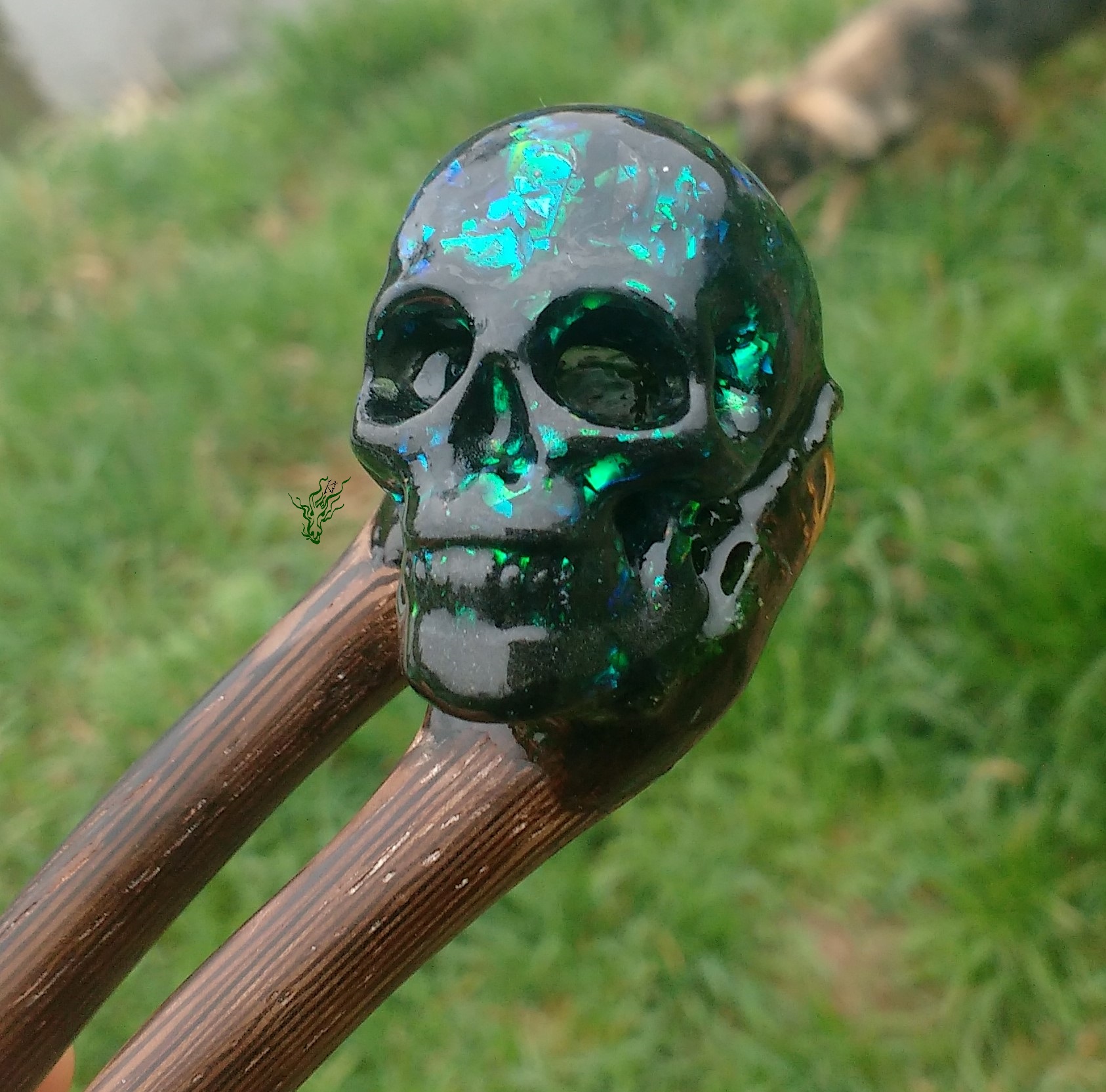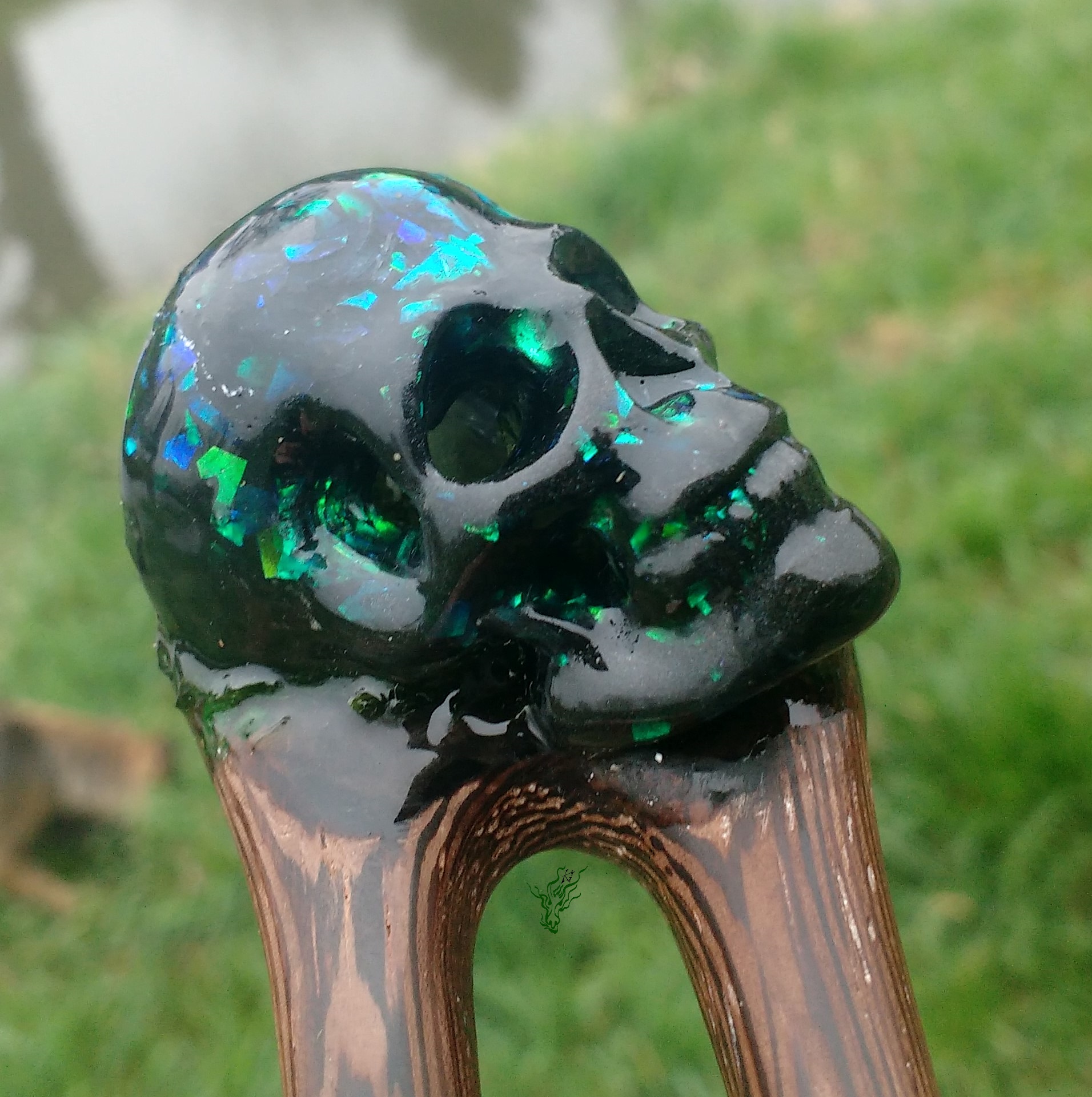 Der Schädel ist von Hand geschnitzt aus mit Metallpartikeln durchzogenen schwarzen Resin mit Flitter in Abalone- Optik. Er ist nicht massiv und daher in Relation zur Größe echt leicht.  So kannst du dein düsteres Statement leben, ohne auf Bequemlichkeit verzichten zu müssen.