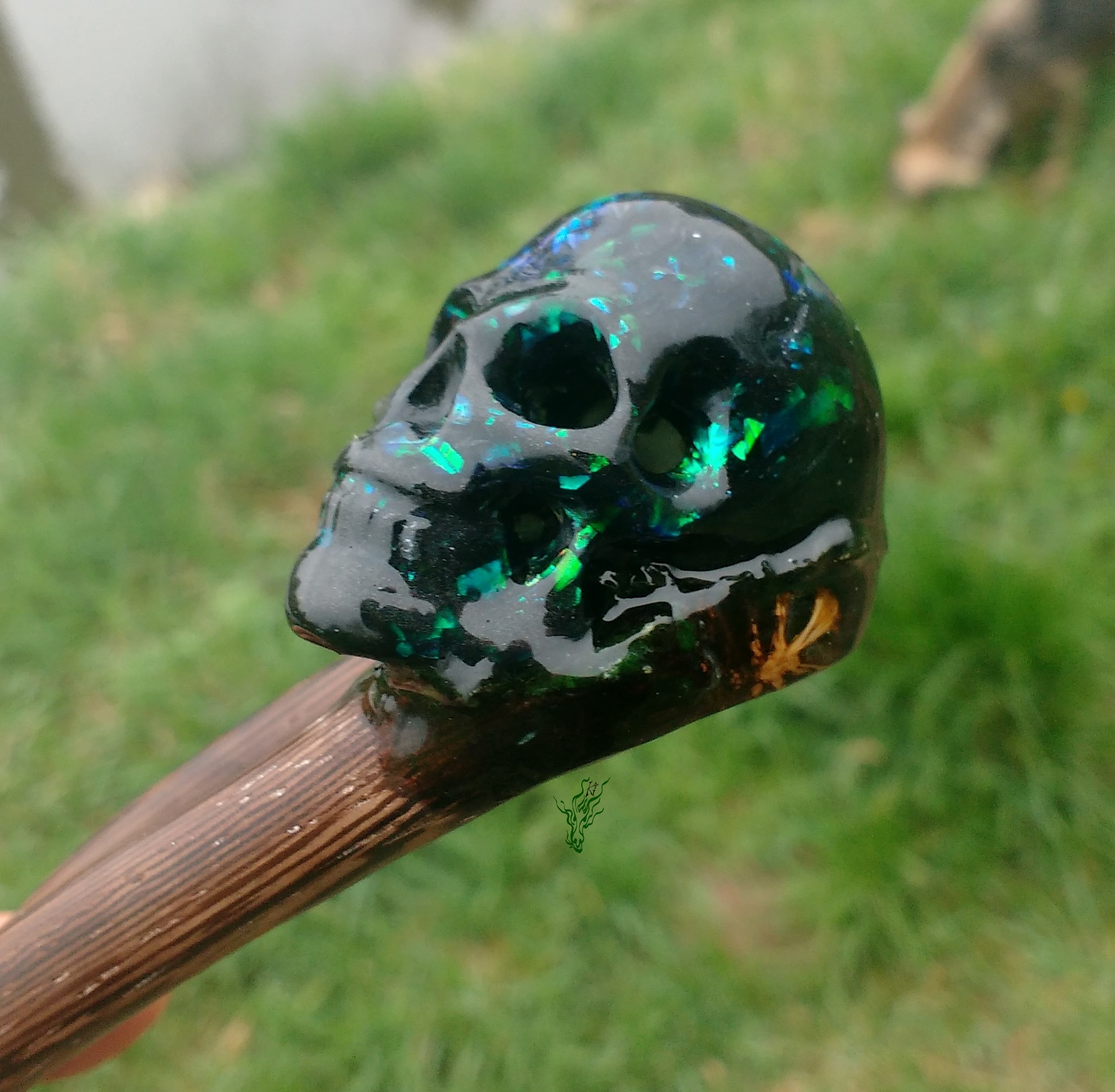 Der Schädel ist von Hand geschnitzt aus mit Metallpartikeln durchzogenen schwarzen Resin mit Flitter in Abalone- Optik. Er ist nicht massiv und daher in Relation zur Größe echt leicht. So kannst du dein düsteres Statement leben, ohne auf Bequemlichkeit verzichten zu müssen.