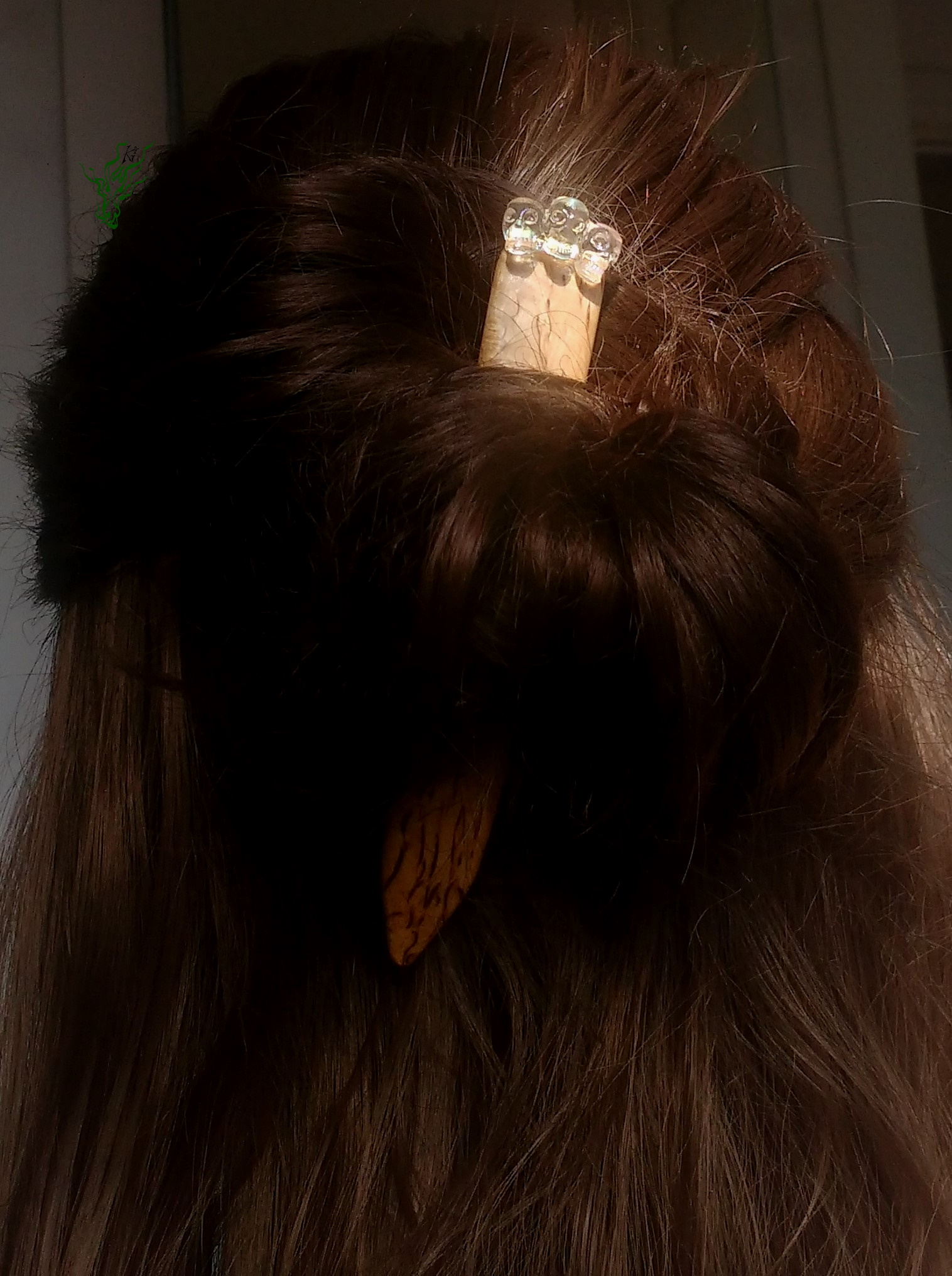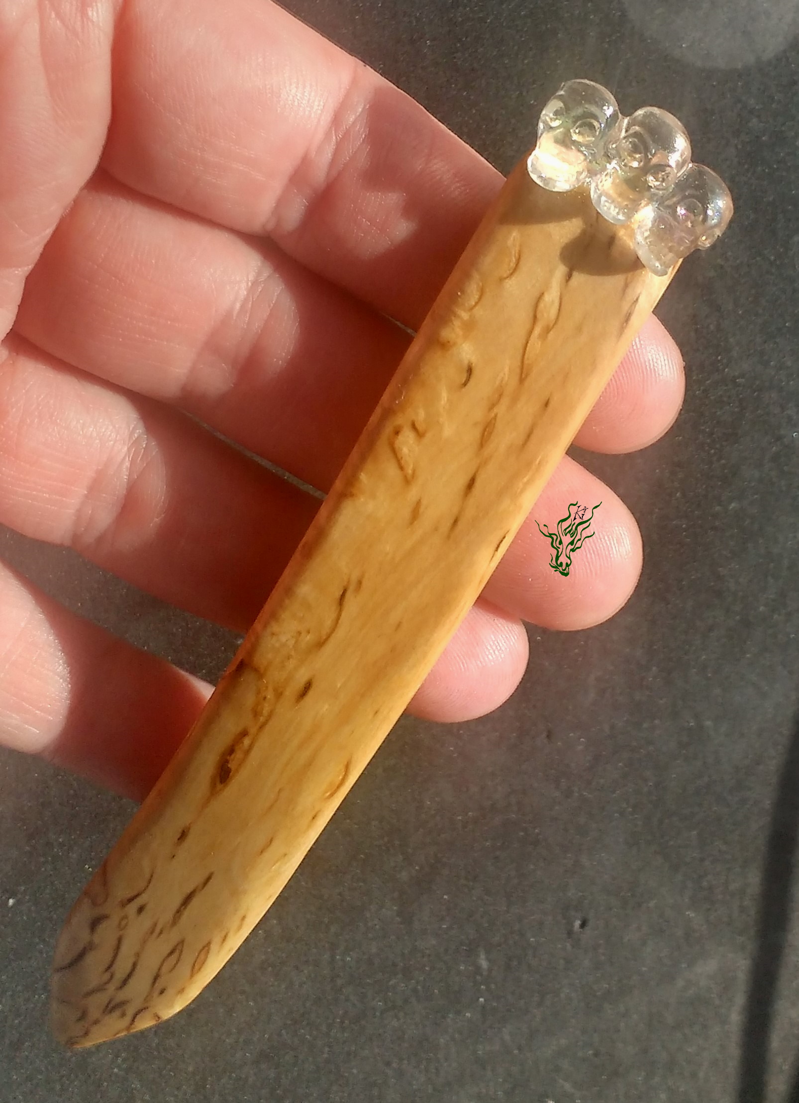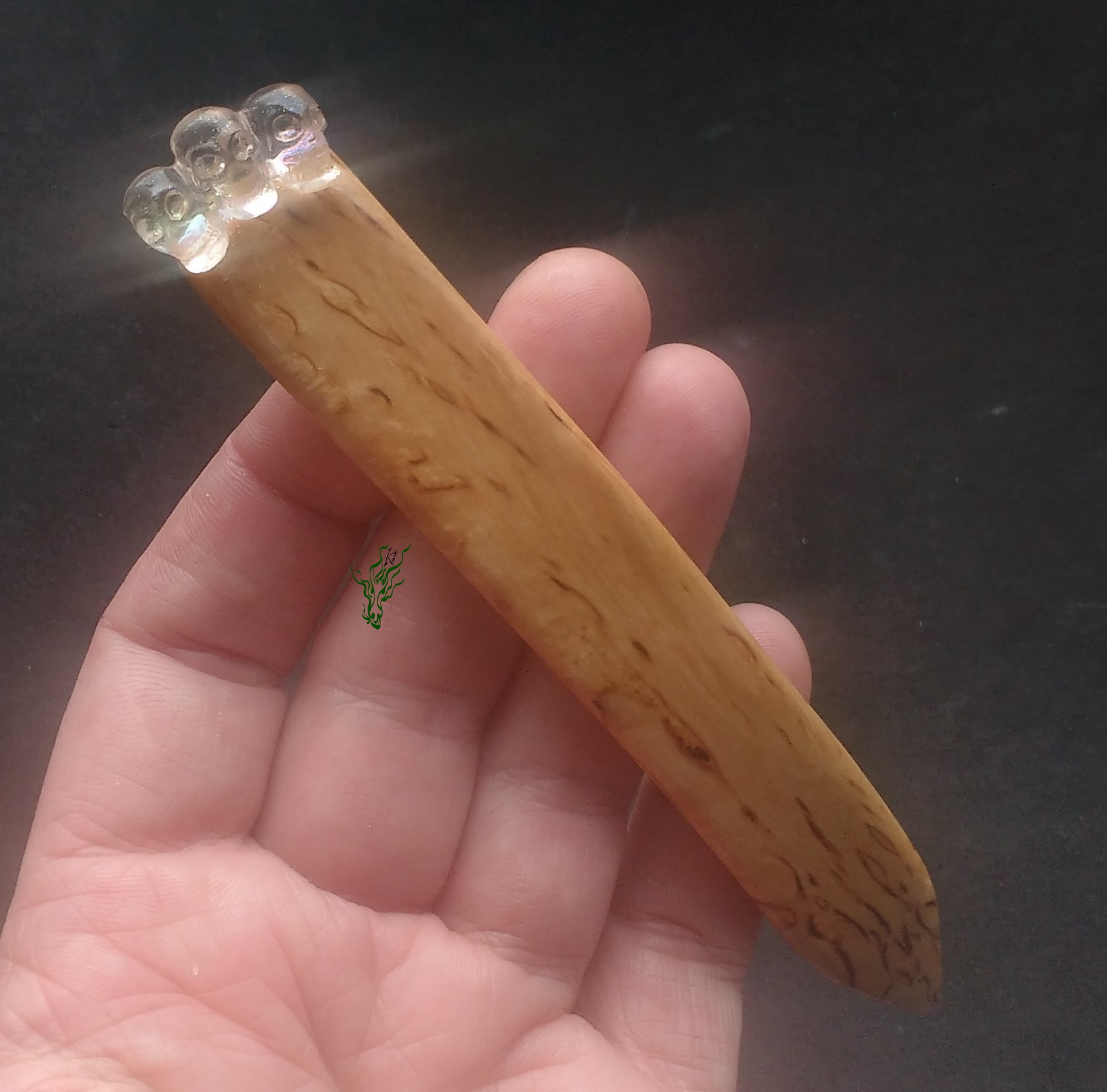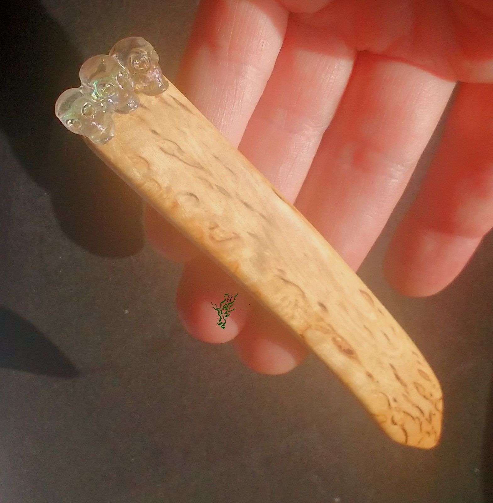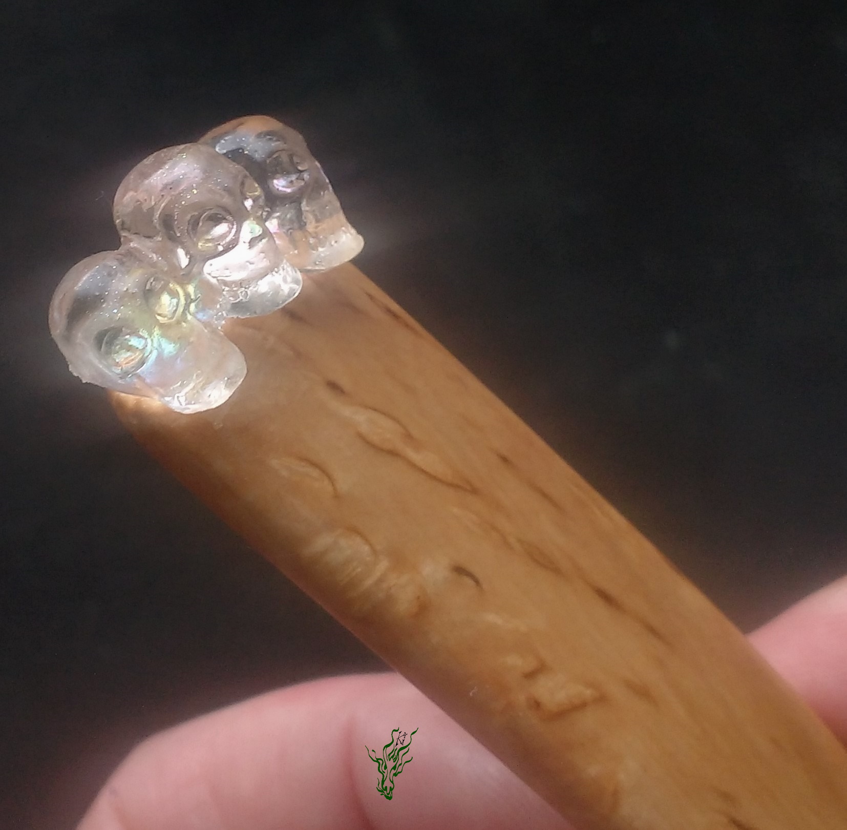 Die Muster und Farben der karelischen Maserbirke erinnern an flüssiges Gold, ein unglaubliches Edelholz! Ich habe sie mit filigranen Totenköpfen geschmückt – zart geschnitzt, durchsichtig & mit ganz dezentem Regenbogenhauch, wenn du sie im Licht funkeln lässt.