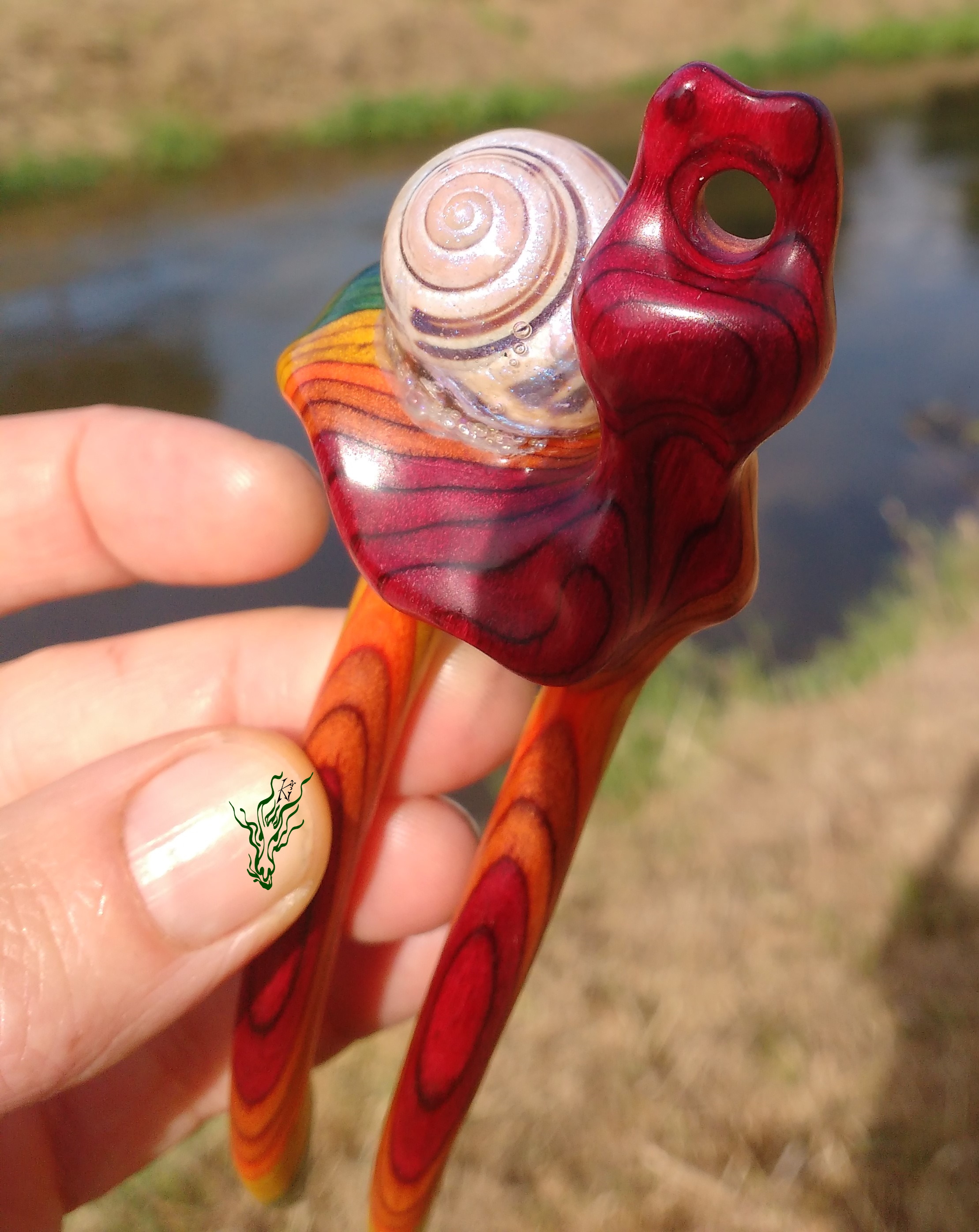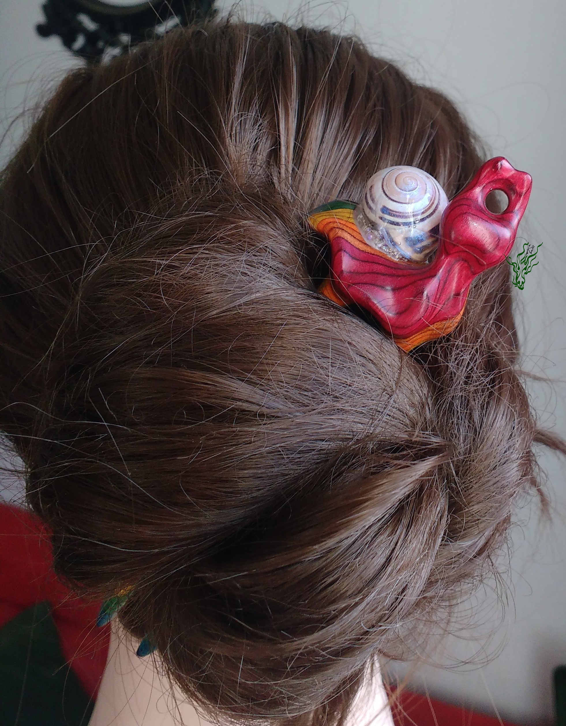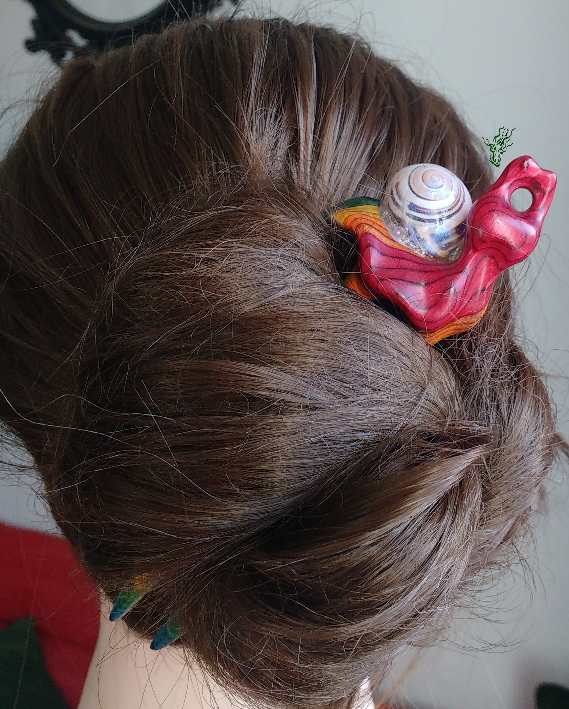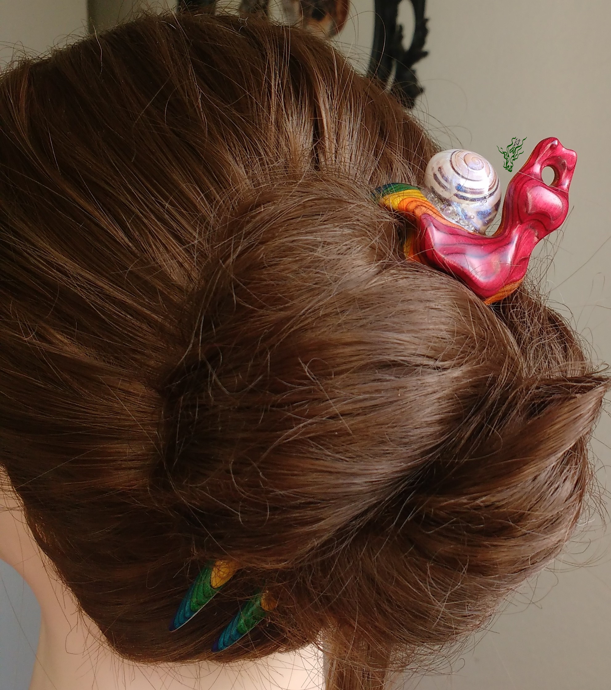 Die Regenbogen- Schnecke liebt es, sich in dein Haar zu schmiegen. Ziemlich  frech lugt sie aus deinem Dutt. Ihr  Schneckenhaus ist  echt & gesäumt  von in  allen  Regenbogenfarben schimmernden Spuckebläschen –  Verzeihung, aber das ist  nunmal Natur  😉 Es hat einen leichten Schimmer in  edlem  Lila – der anderen  Seite des Regenbogen Spektrums, passend zu Schneckis geschwungenem Schwänzchen.