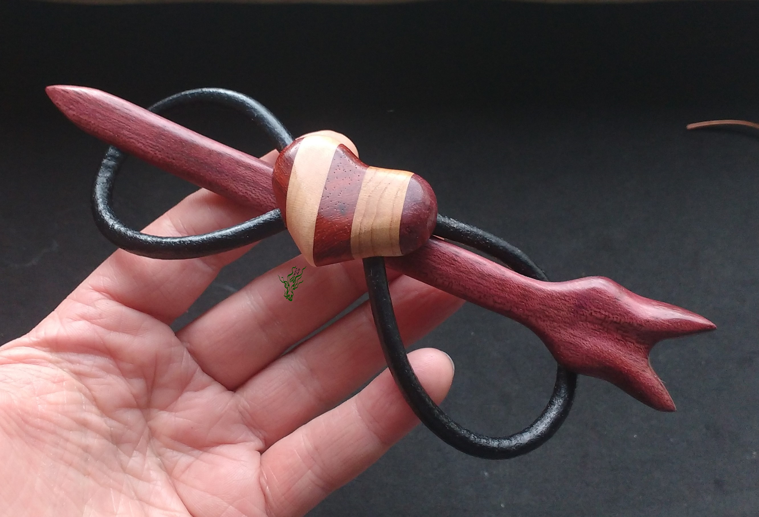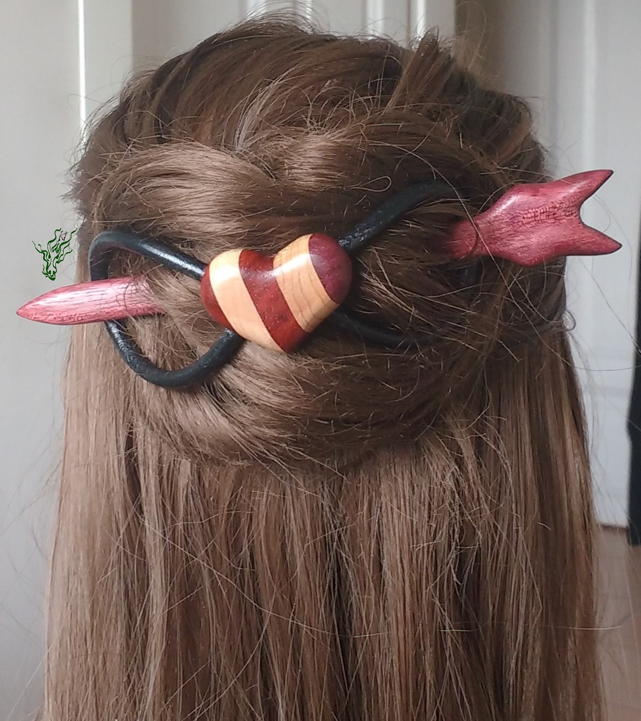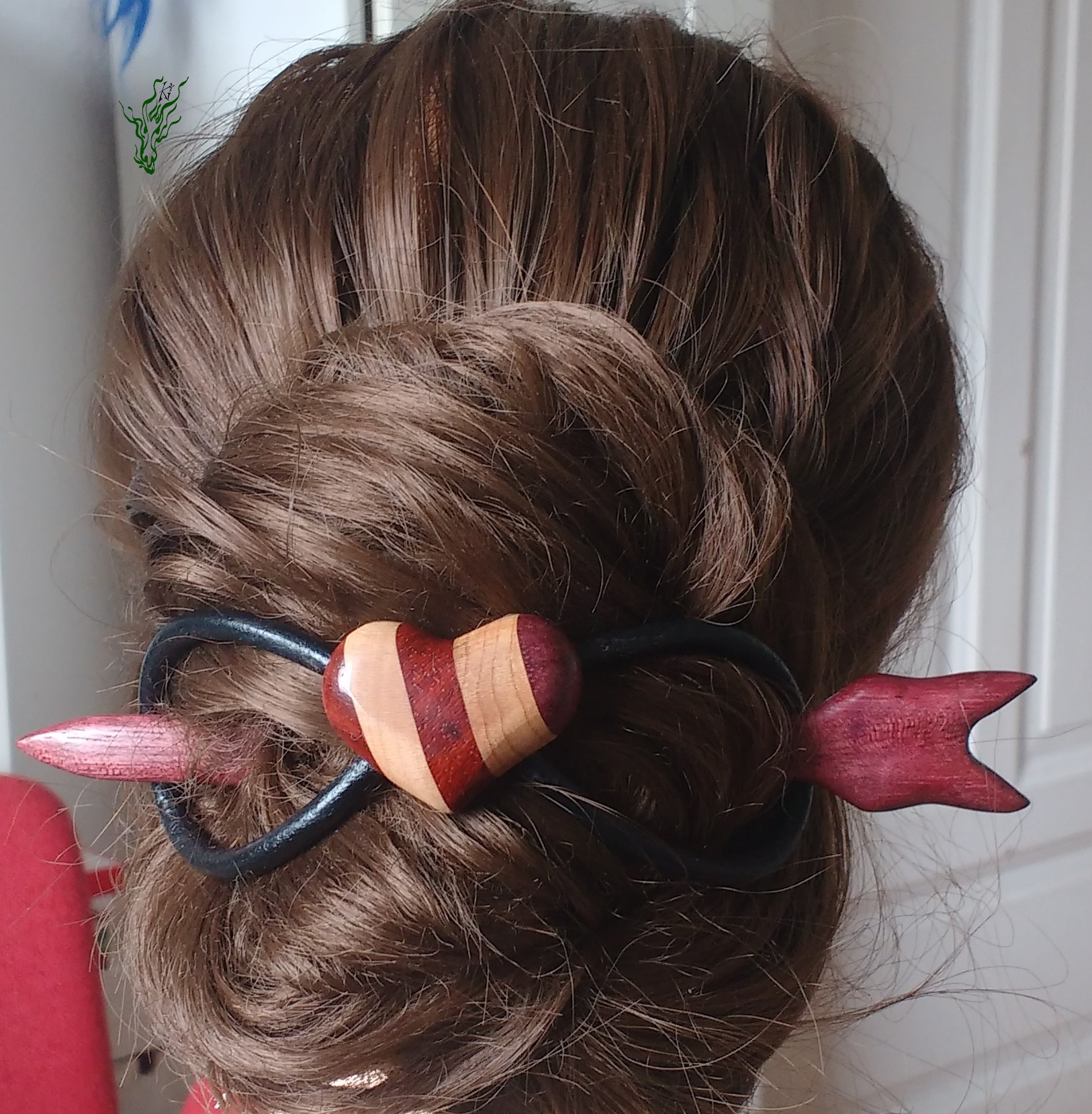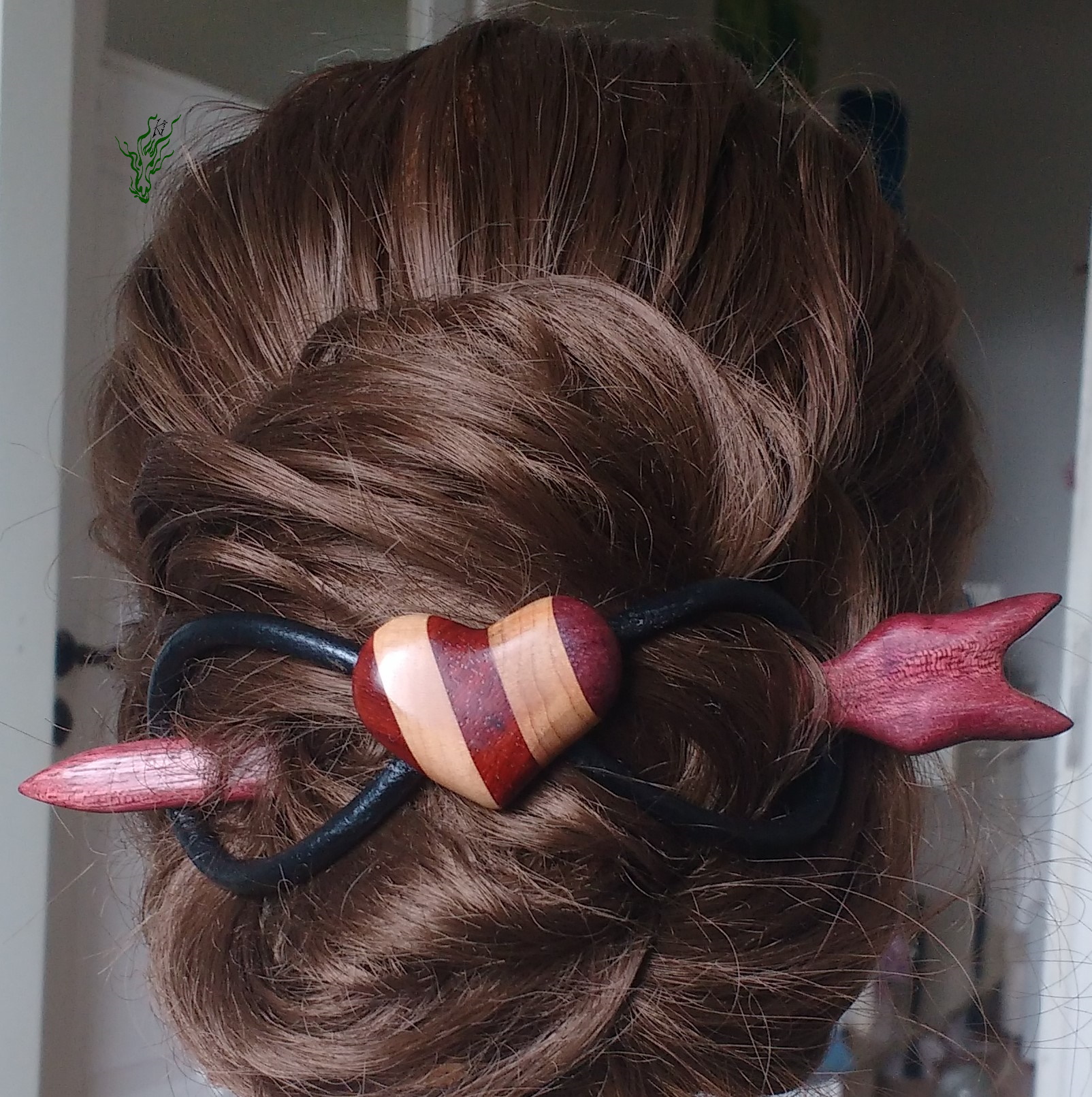Haarspange aus edlen Hölzern & Leder. Mit handgeschnitztem Herz & Pfeil. Lila Amaranth & rotes Padouk bringen Farbe hinein. Stab & Spange sind verbunden – so geht nix verloren. Du verwendest sie wie jede andere Haarspange, am besten steckst du erst den Stab und ziehst dann die flexible Schlaufe drüber.