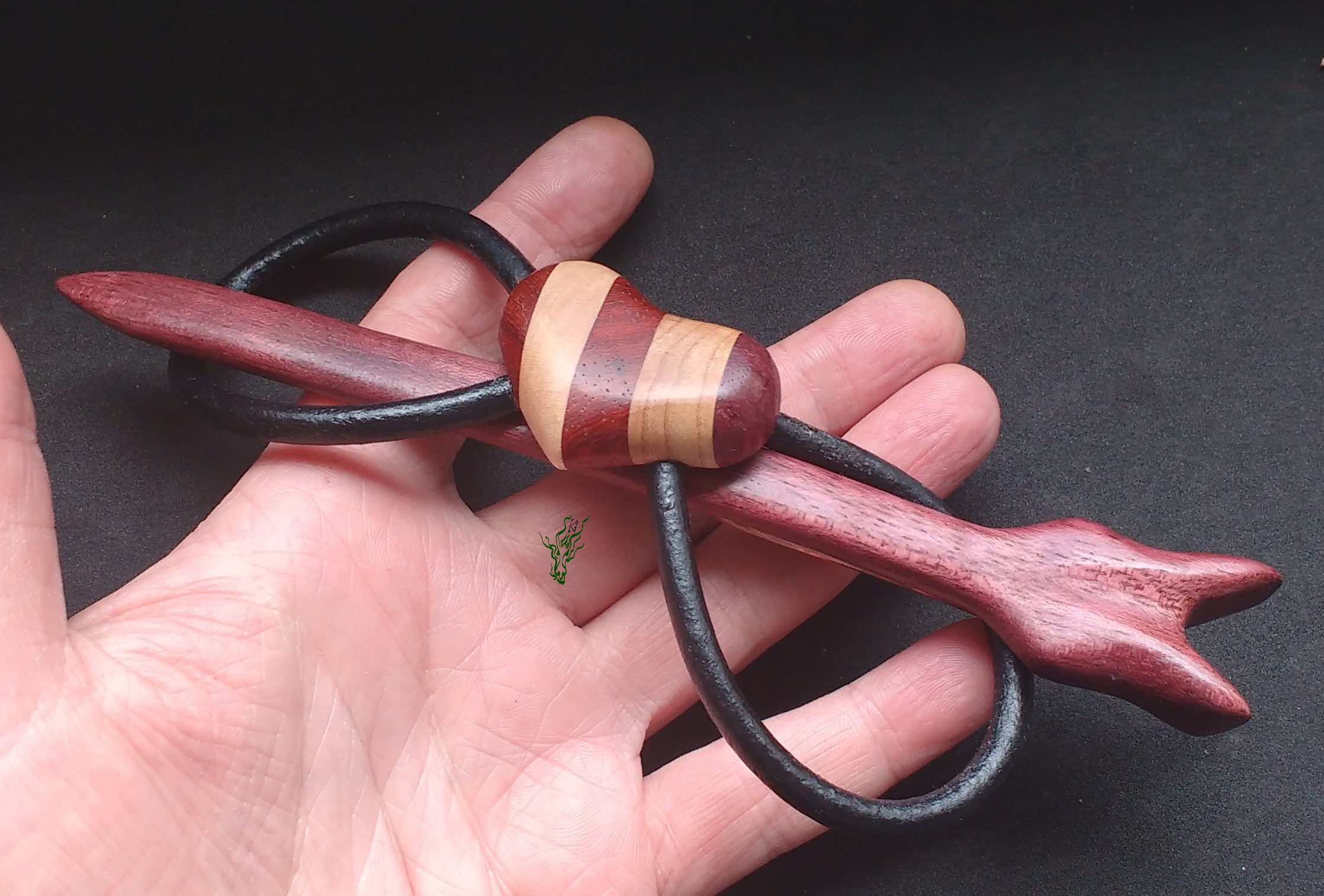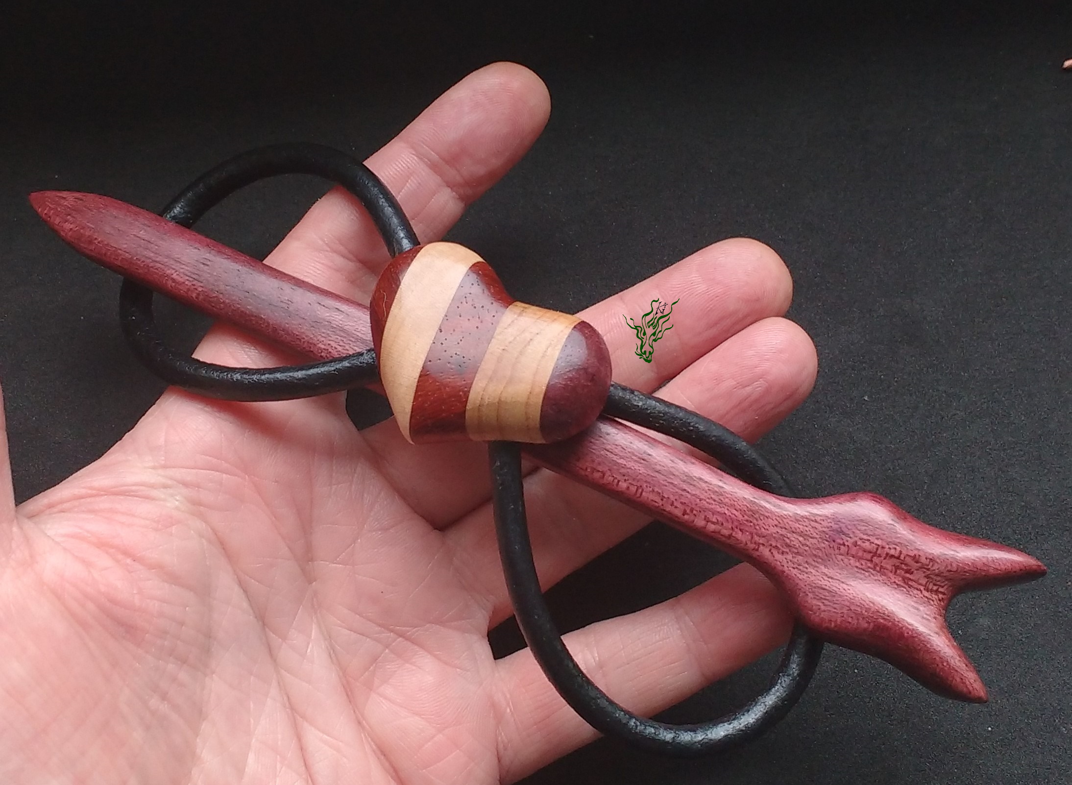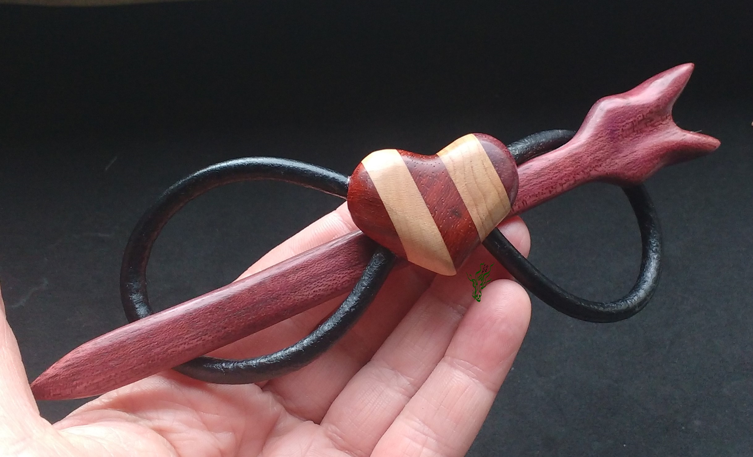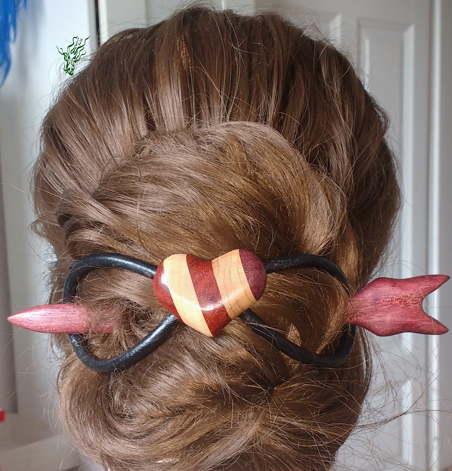 Haarspange aus edlen Hölzern & Leder. Mit handgeschnitztem Herz & Pfeil. Lila Amaranth & rotes Padouk bringen Farbe hinein. Stab & Spange sind verbunden – so geht nix verloren. Du verwendest sie wie jede andere Haarspange, am besten steckst du erst den Stab und ziehst dann die flexible Schlaufe drüber.