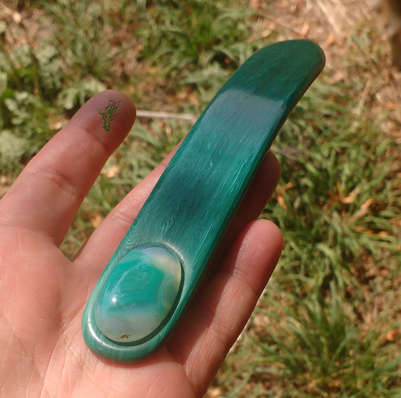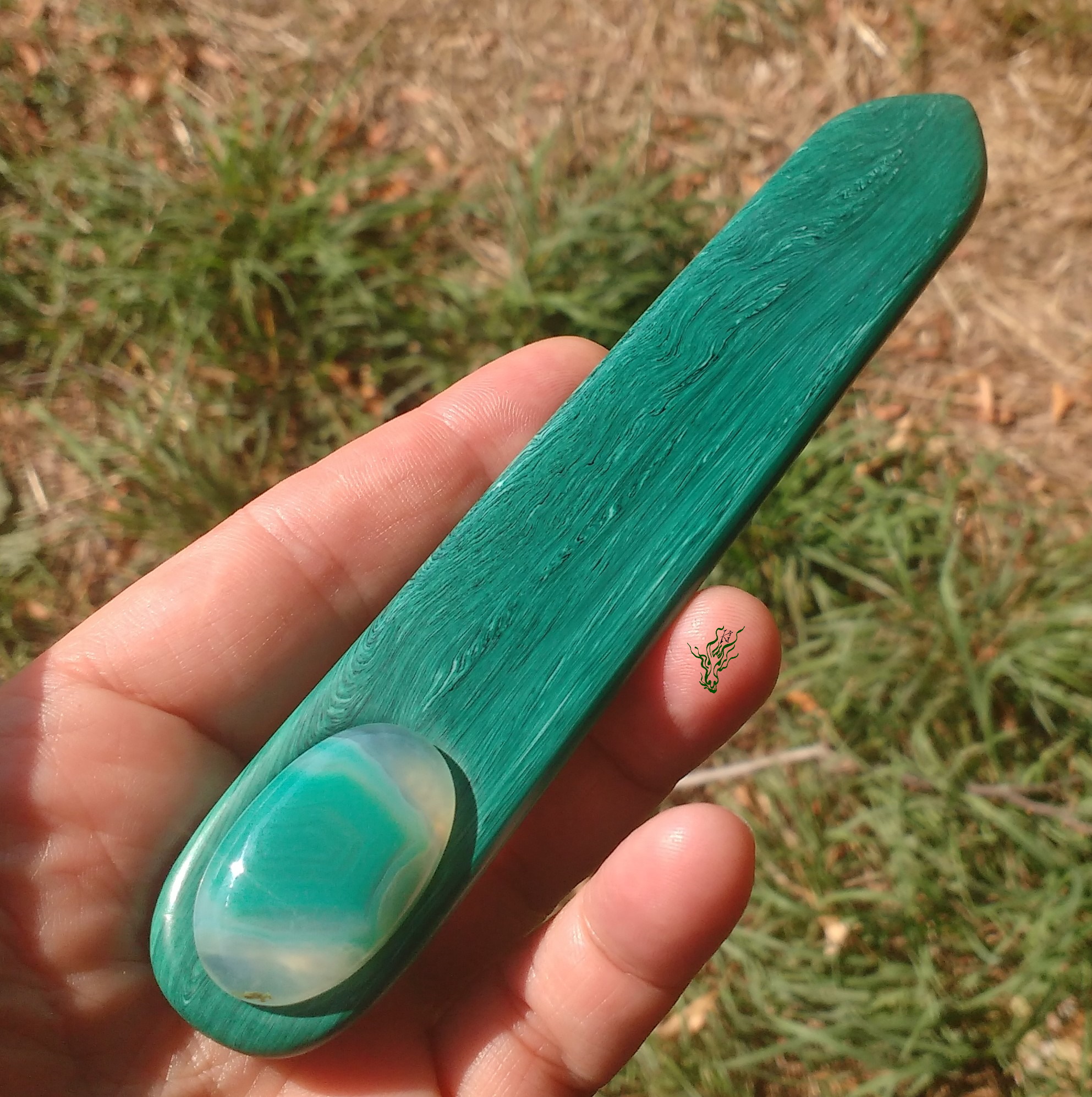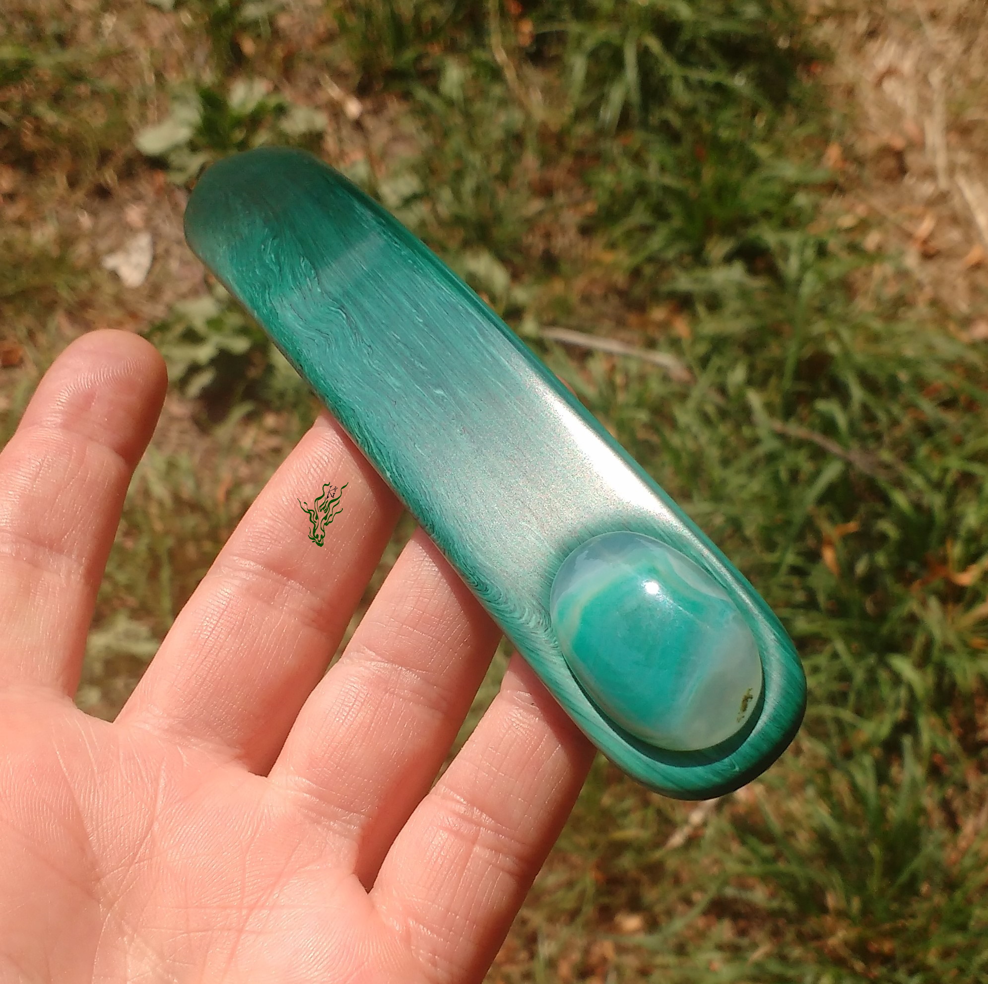 Gelegentlich macht es mir Spaß mit Acryl zu spielen und in meinem Fundus fand sich dieses Malachit- Imitat –  Acryl.   Ein breiter Flachstab wie aus grünem Edelstein.  In  Kopfform  gebogen  und  abgerundet.  Nun kann man sich fragen, warum zur Hölle hat sie einen Achat eingesetzt und keinen  Malachit?  Njoa, der  Malachit weicht  farblich ganz dezent  von der Farbe des Acryls ab, während der Achat  perfekt passte.  Und manchmal ist es eben nicht das Offensichtliche, das am schönsten aussieht.  ^^