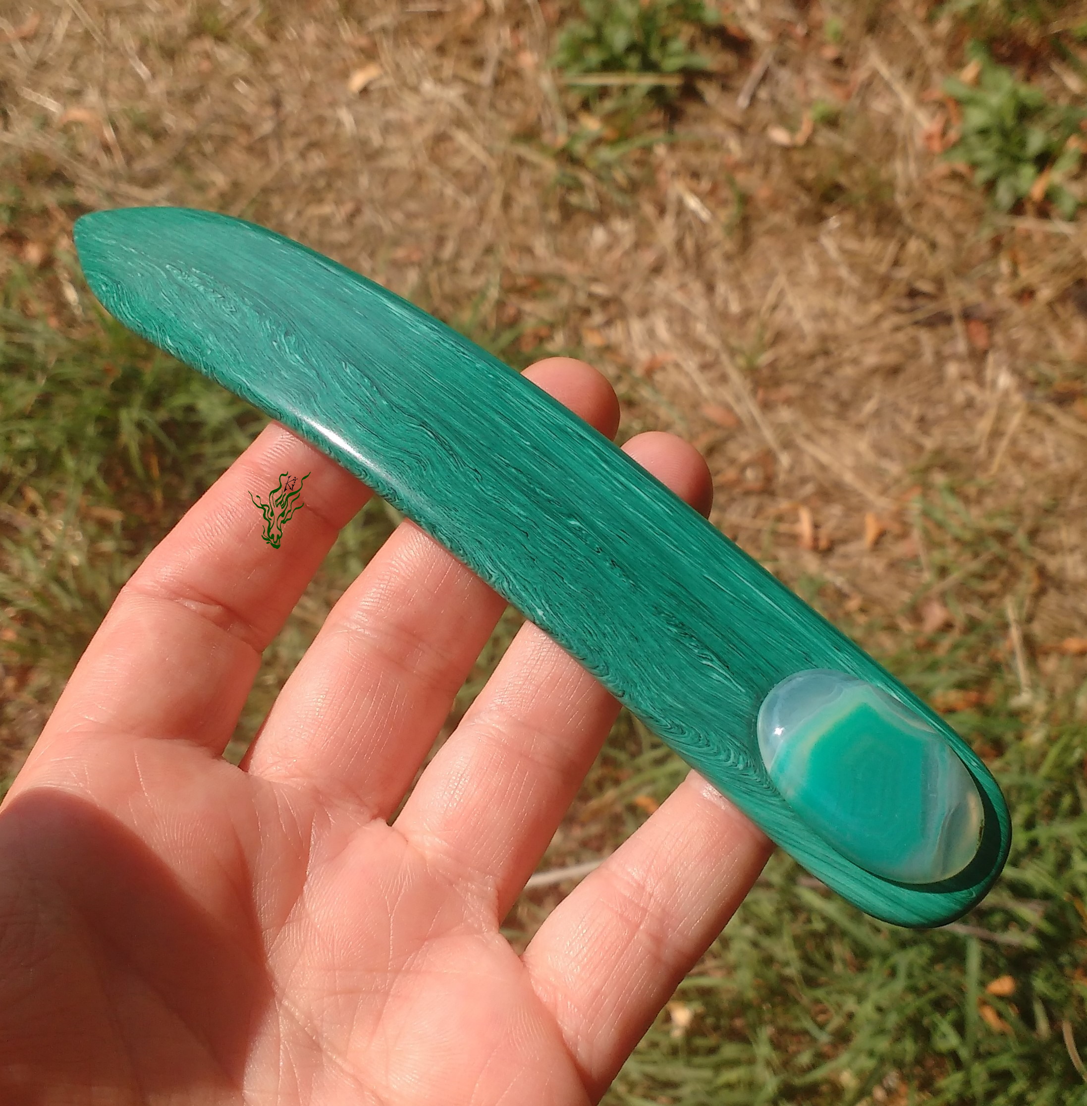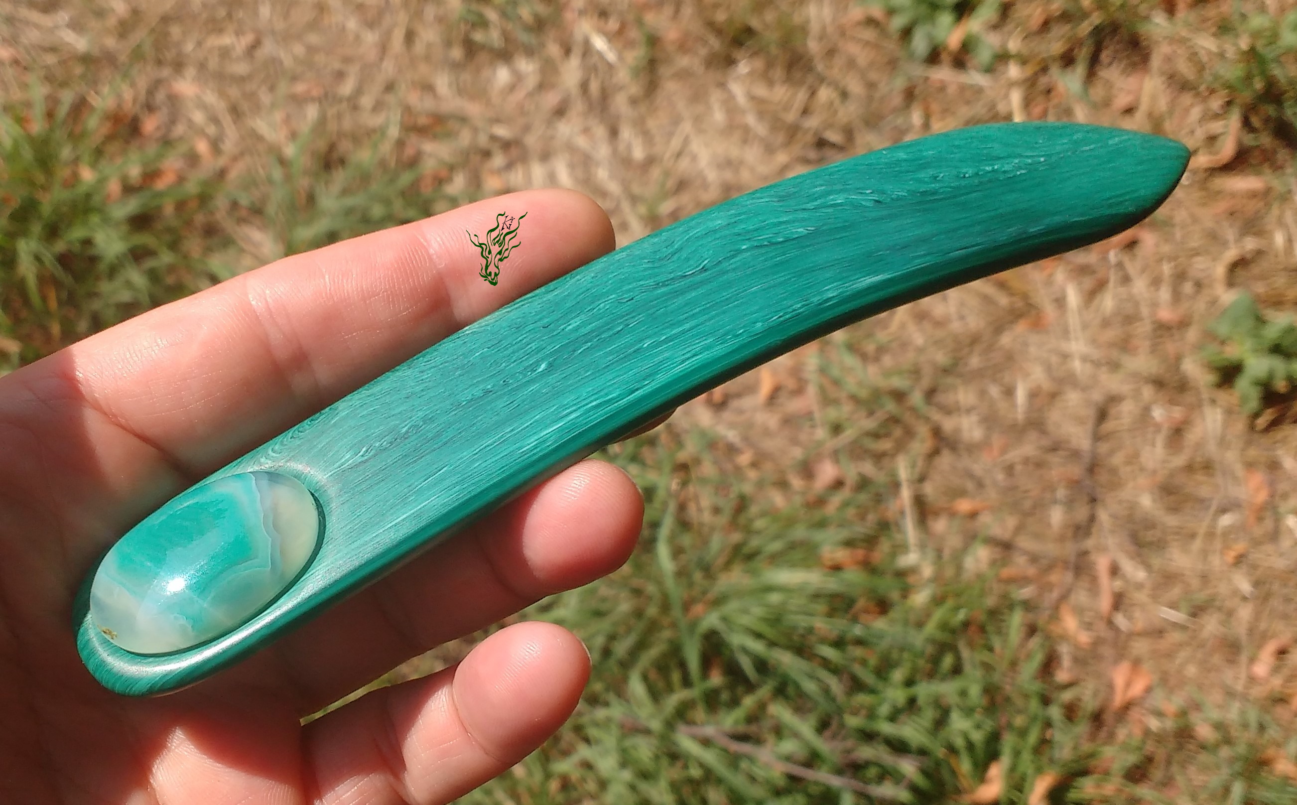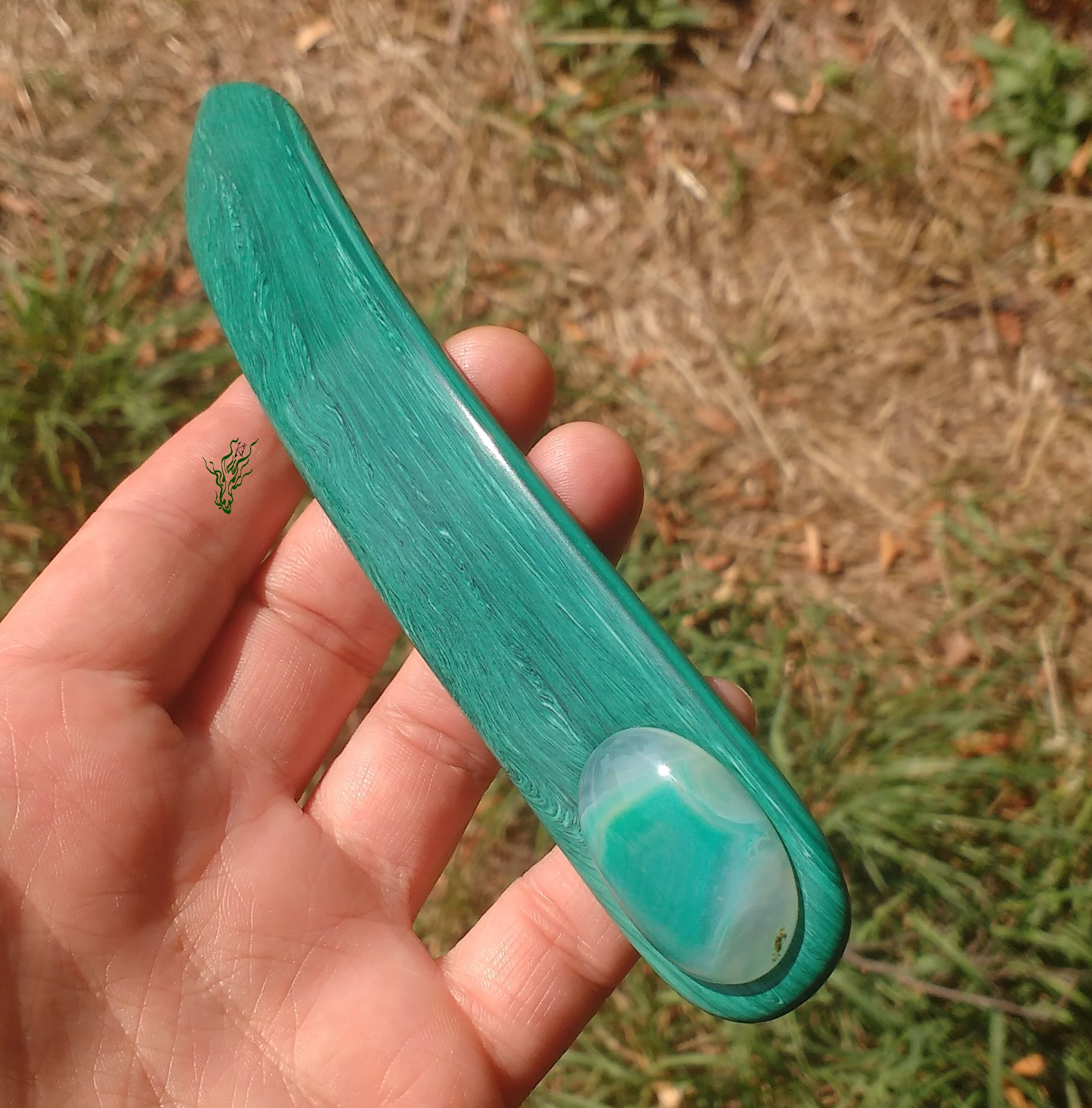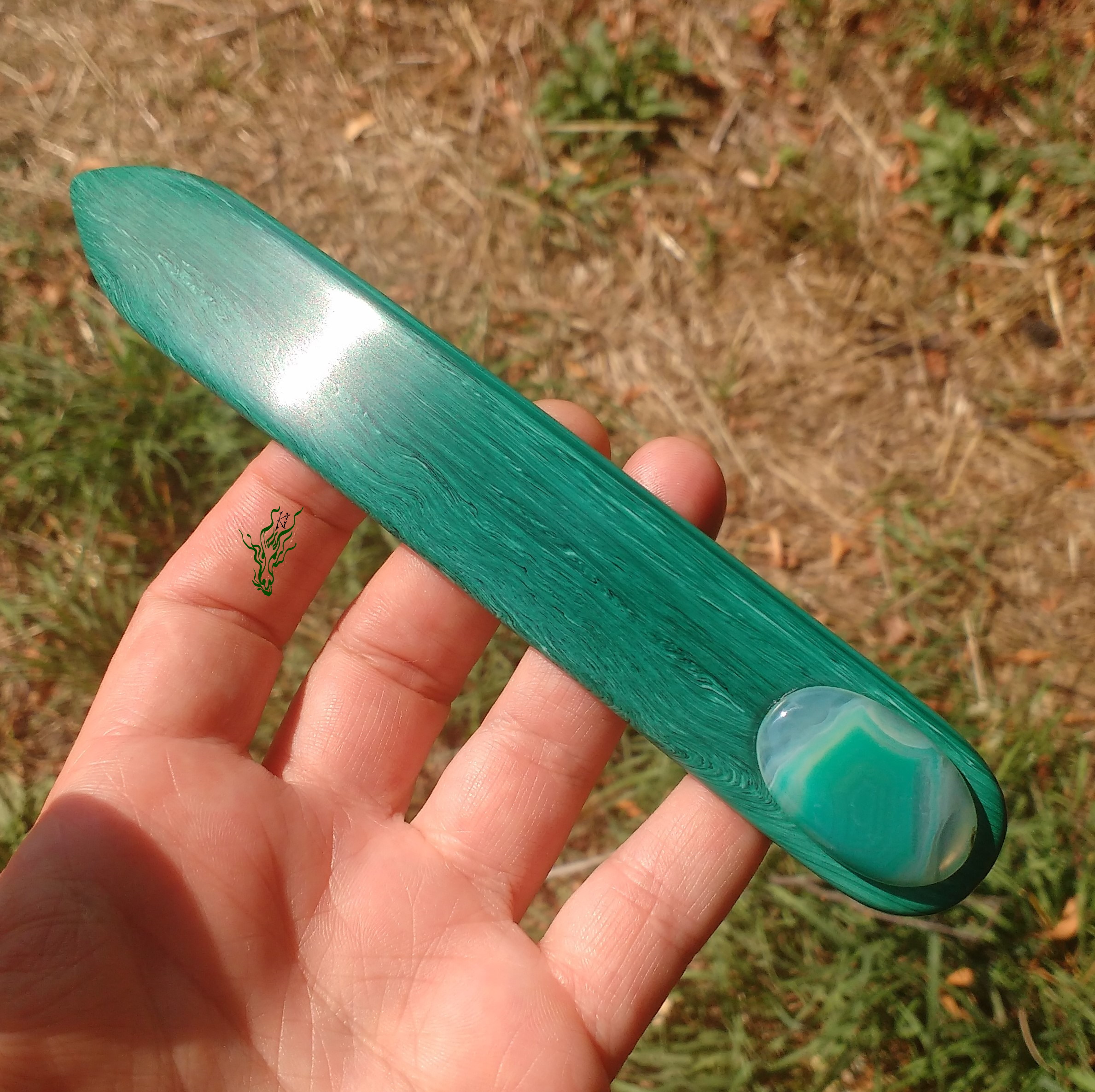 Gelegentlich macht es mir Spaß mit Acryl zu spielen und in meinem Fundus fand sich dieses Malachit- Imitat –  Acryl.   Ein breiter Flachstab wie aus grünem Edelstein.  In  Kopfform  gebogen  und  abgerundet.  Nun kann man sich fragen, warum zur Hölle hat sie einen Achat eingesetzt und keinen  Malachit?  Njoa, der  Malachit weicht  farblich ganz dezent  von der Farbe des Acryls ab, während der Achat  perfekt passte.  Und manchmal ist es eben nicht das Offensichtliche, das am schönsten aussieht.  ^^