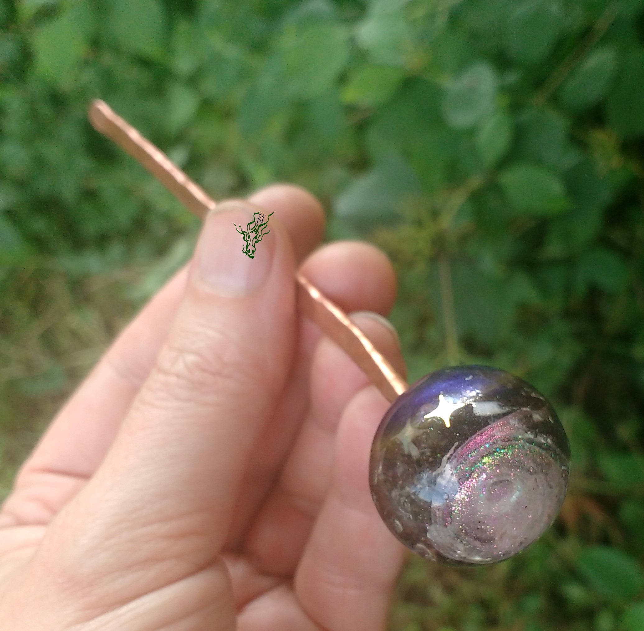 Ein klassischer Kugel- Haarstab – neu und innovativ interpretiert.  Ein Kugeltopper wie ein kleines Universum mit Sternen, die  je nach  Licht  silber- regenbogenbunt schimmern.  Von einer Seite legt sich Blauschimmernder  Schatten über die  kleine Welt und eine Galaxie schimmert oben. Weltallgestein regnet herab und du hast tagelang was zum Gucken.