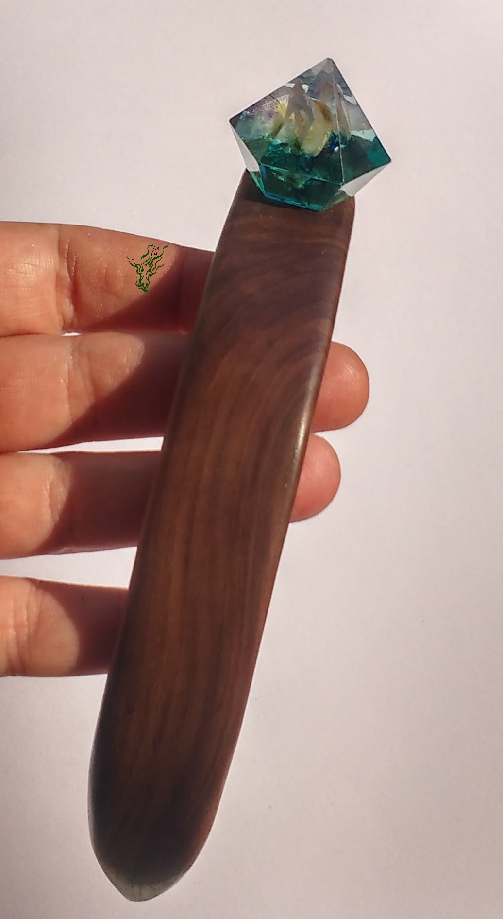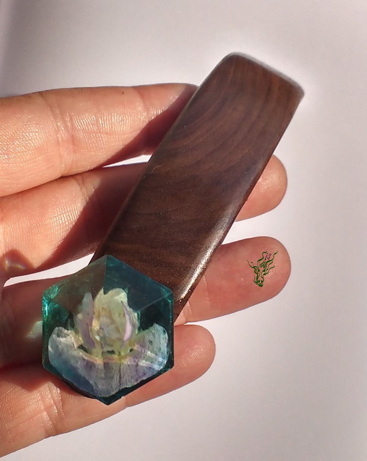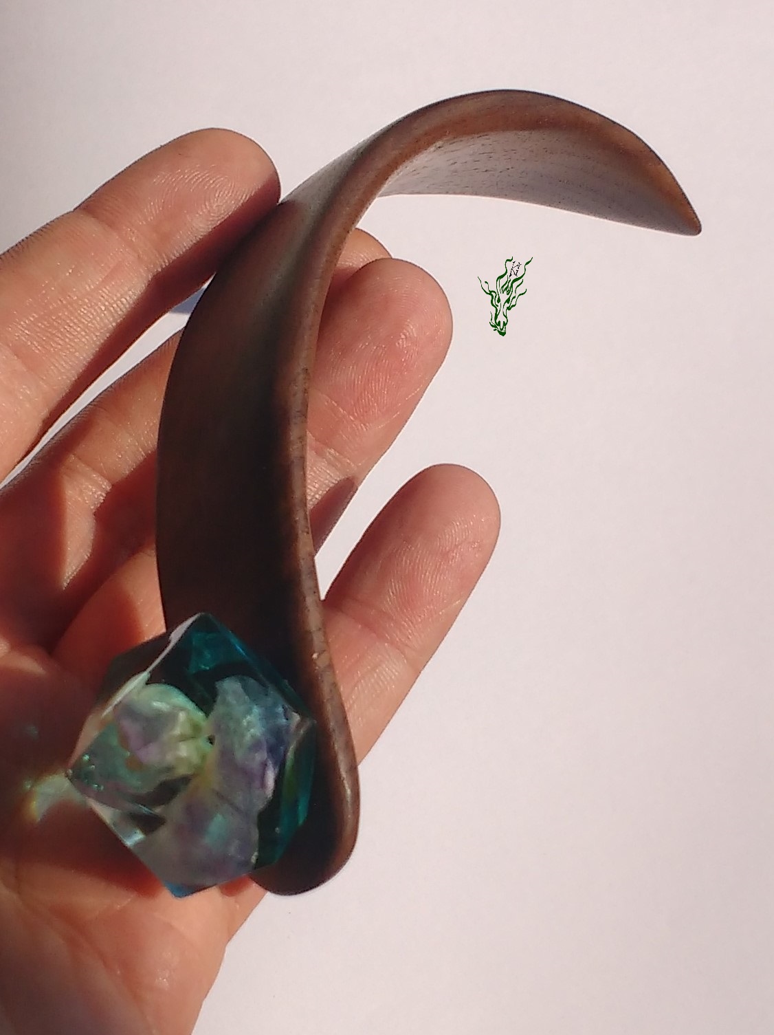 Die Kuppel ist durchsichtig- blau in Diamantform mit einer einzelnen Wickenblüte. Dieser breite Stab ist leicht, bequem und hält durch die starke Biegung in Kopfform sicher, wird nicht heraus rutschen & vor allem nicht komisch vom Kopf abstehen. Das herrlich gemaserte Walnussholz wirkt kühl & edel. Natürlich wie all meine Holz Haarschmückers vor Feuchtigkeit geschützt durch ein Öl- Wachs – Finish.