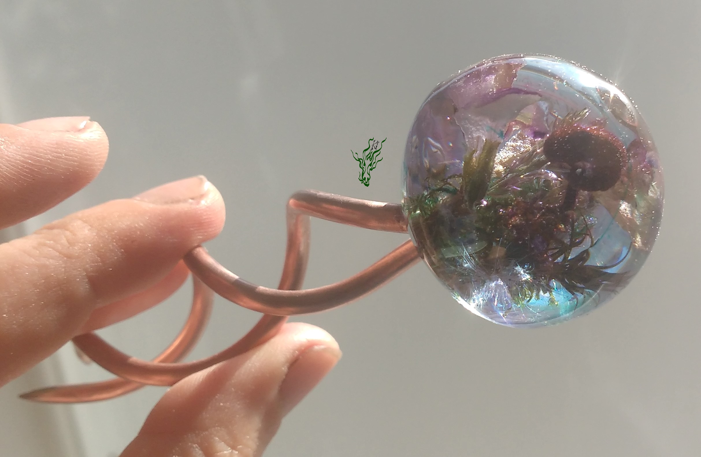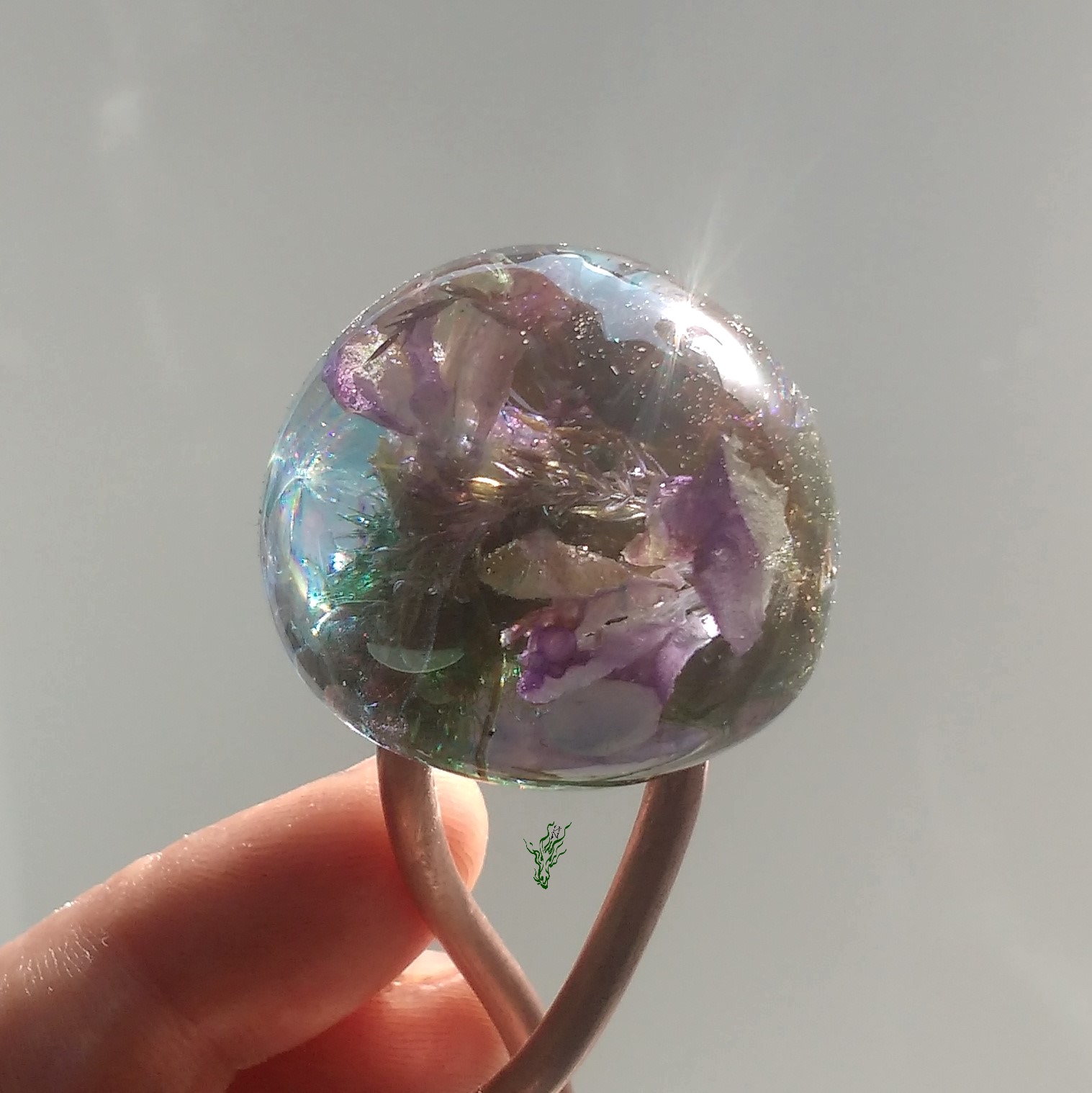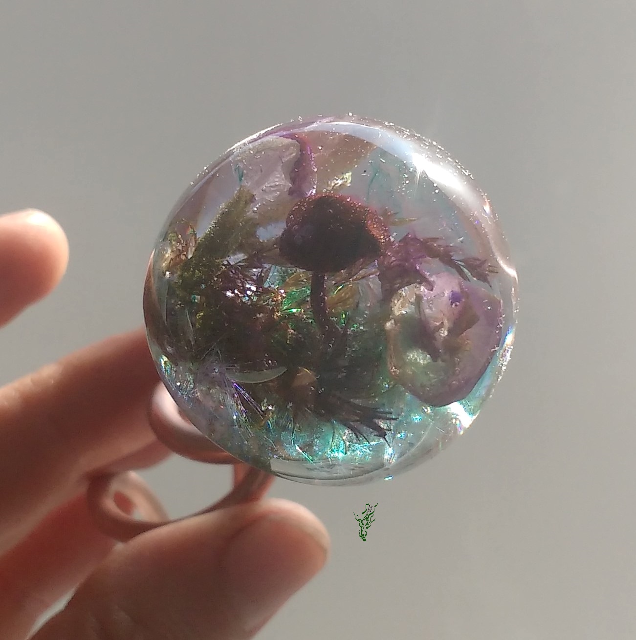 Wiesenblumenblüten, Pilze, Gräser, Moos & Pusteblume – alles, was die Natur zu bieten hat, von mir gesammelt, konserviert & arrangiert zu einer stimmungsvollen Landschaft. Irisierende Blässchen bringen geheimnisvollen Glitzer in eine zart zweifarbige Kuppel, die mal rosa, mal blau wirkt.