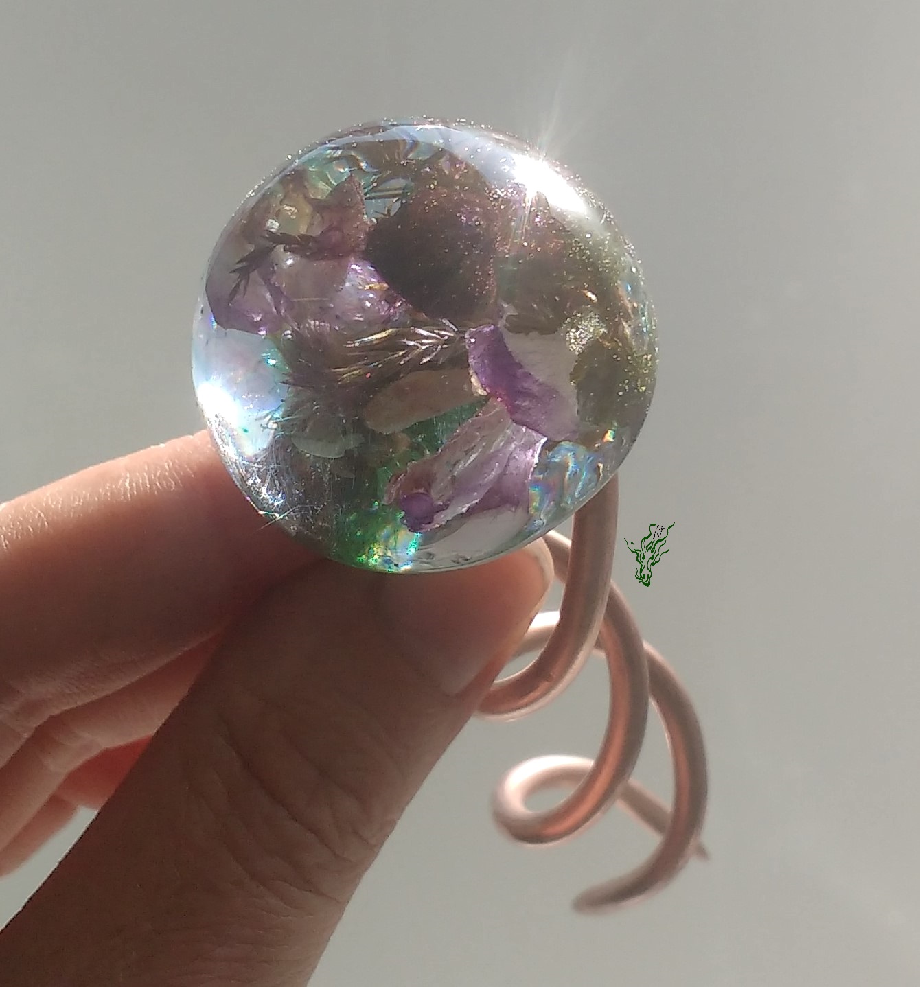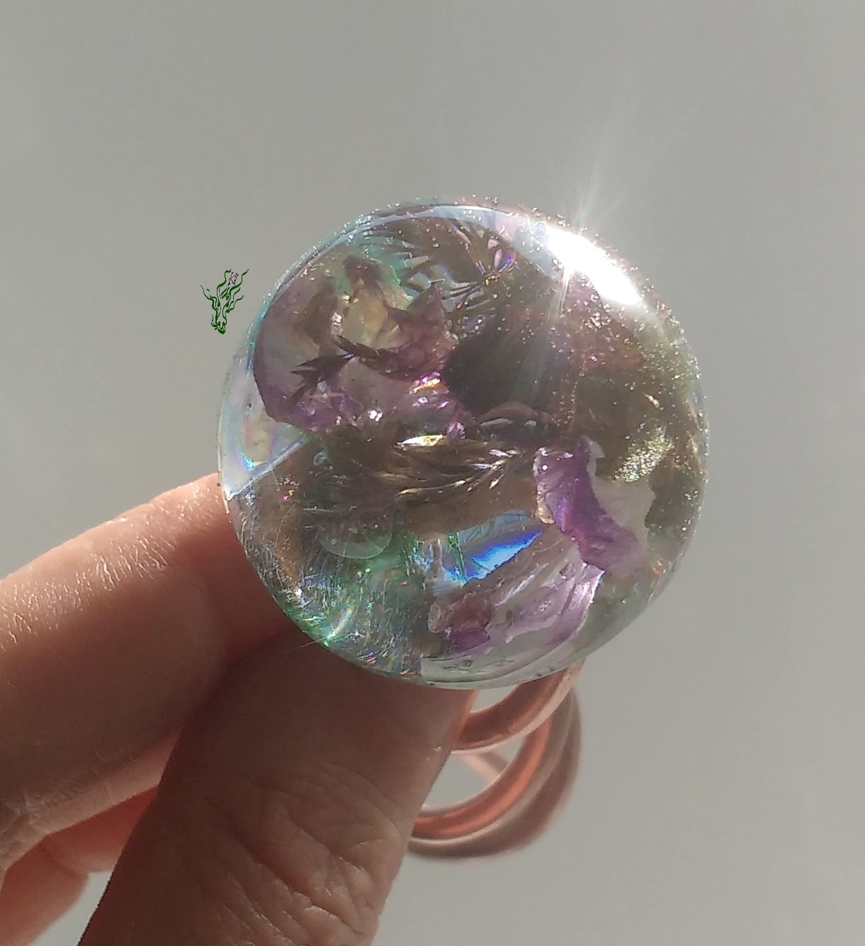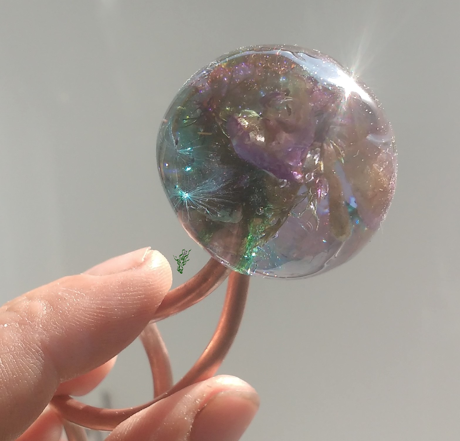 Wiesenblumenblüten, Pilze, Gräser, Moos & Pusteblume – alles, was die Natur zu bieten hat, von mir gesammelt, konserviert & arrangiert zu einer stimmungsvollen Landschaft. Irisierende Blässchen bringen geheimnisvollen Glitzer in eine zart zweifarbige Kuppel, die mal rosa, mal blau wirkt.