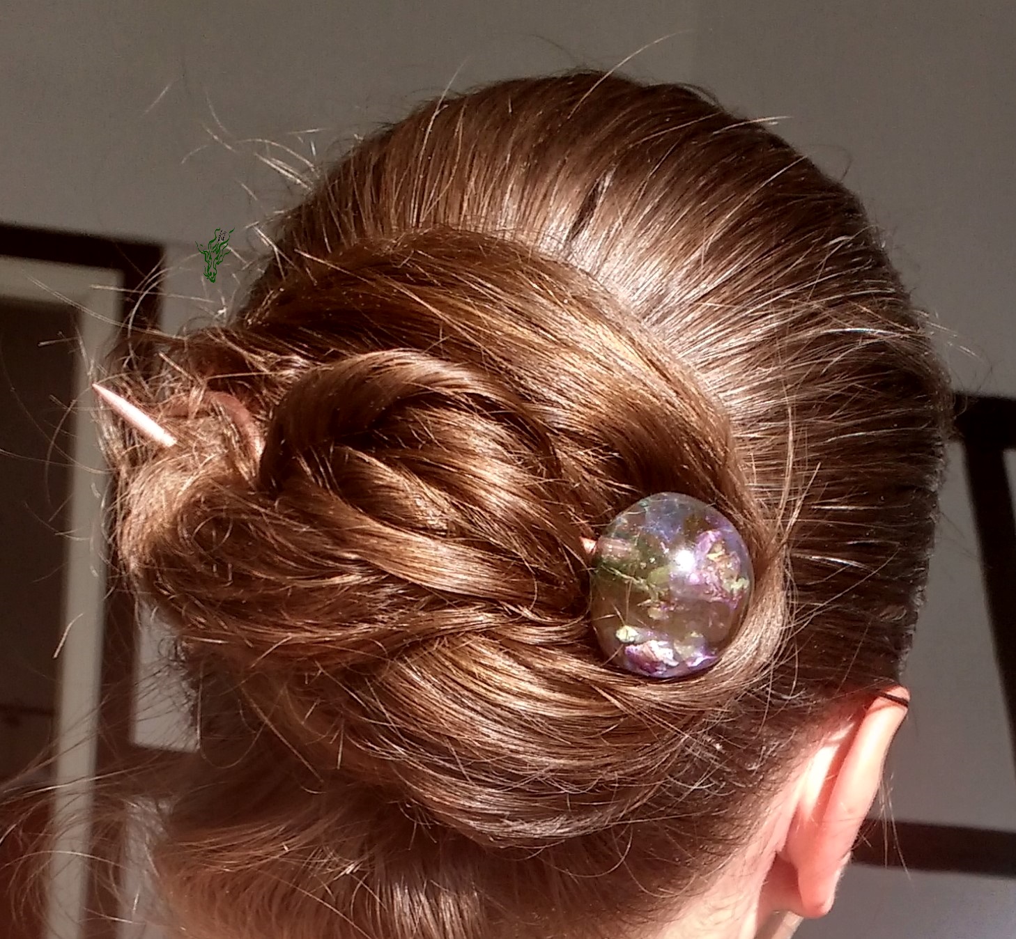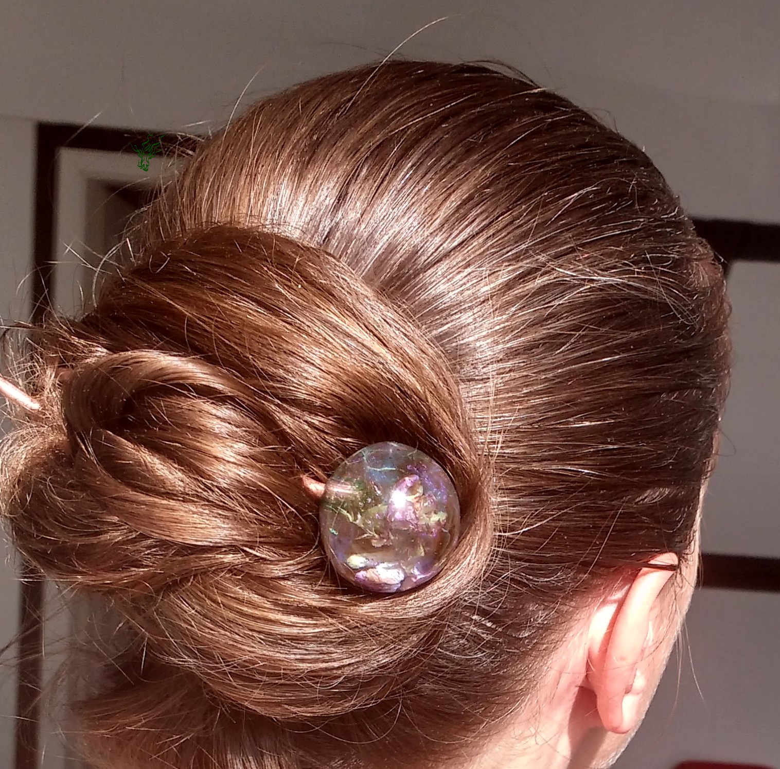 Die Haarforke ist so konzipiert, dass sich die Kuppel an deinen Dutt anfügt & perfekt ausbalanciert ist. Die Helix ist aus stabilem Kupfer. Die verbiegst du nicht so leicht & sie hält deinen Dutt sicher in Form. Die spiral Zinken verteilen das Gewicht besonders gut, deshalb kann sogar ich mit meinen empfindlichen Haarwurzeln solche Schmuckstücke den ganzen Tag tragen.