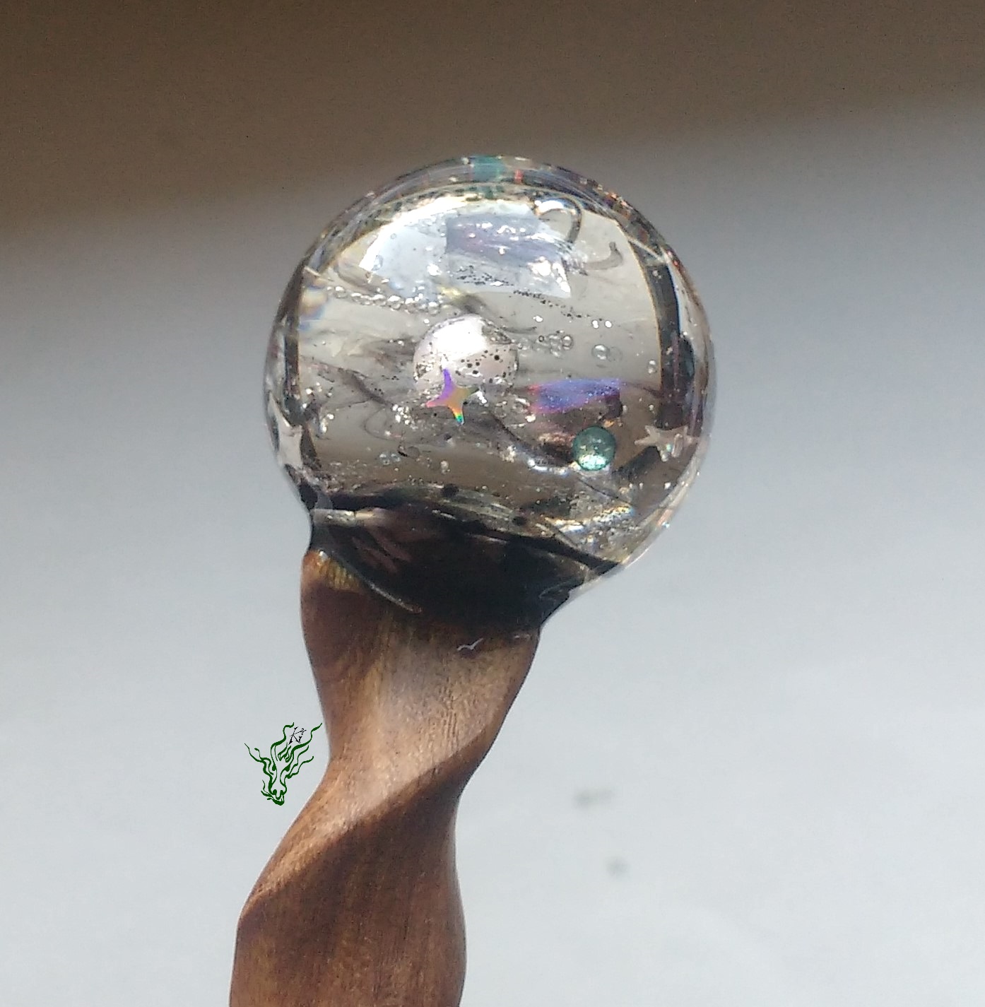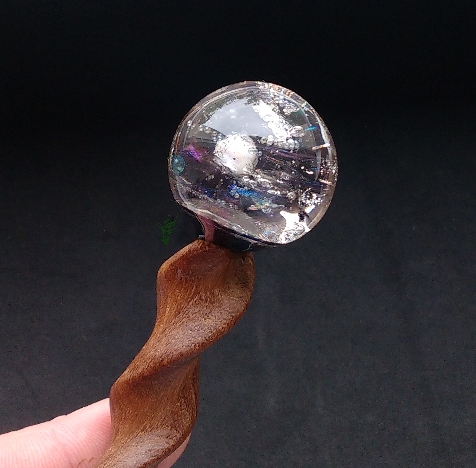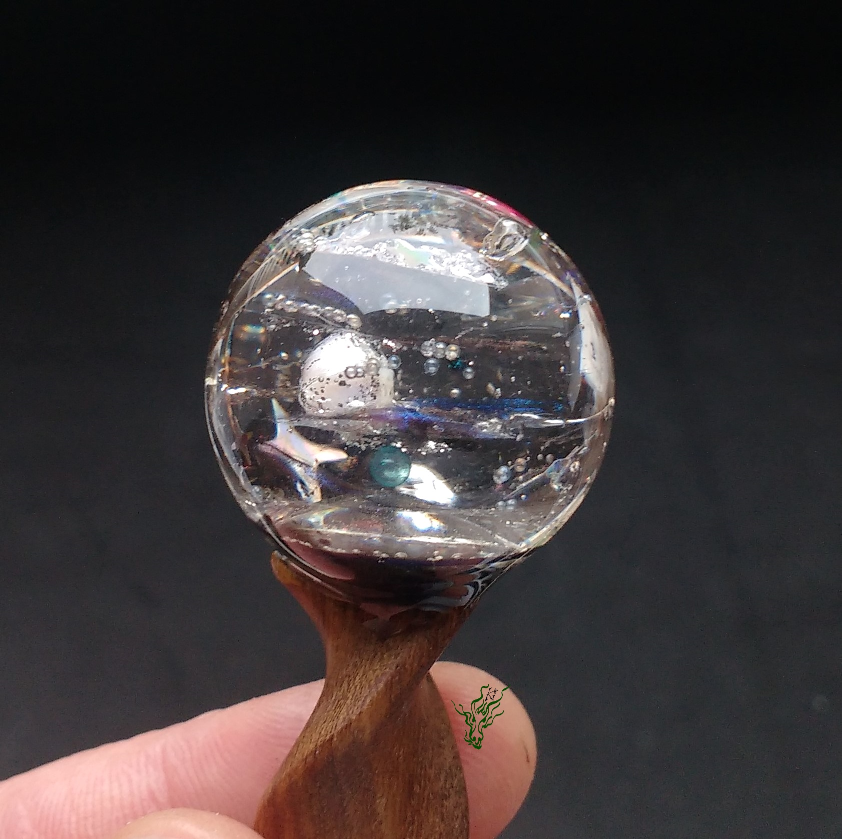 Ein klassischer Kugel- Haarstab – neu und innovativ interpretiert. Ein Kugeltopper wie ein kleines Universum mit Sternen, die je nach Licht silber- regenbogenbunt schimmern.