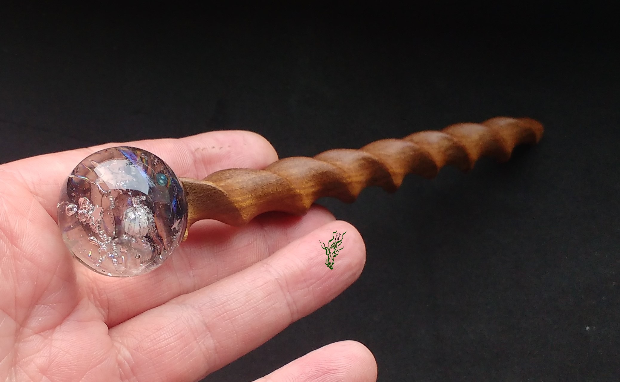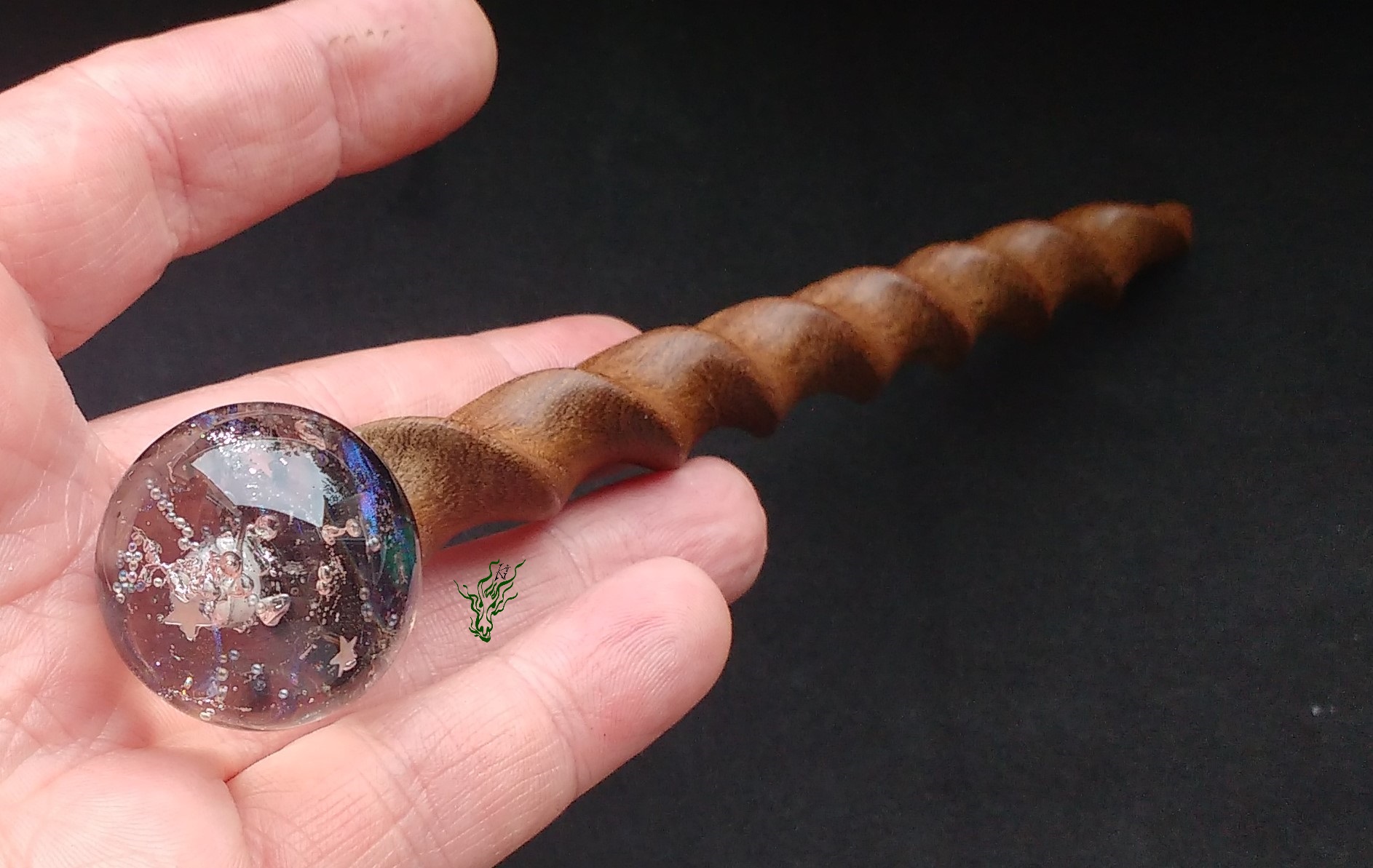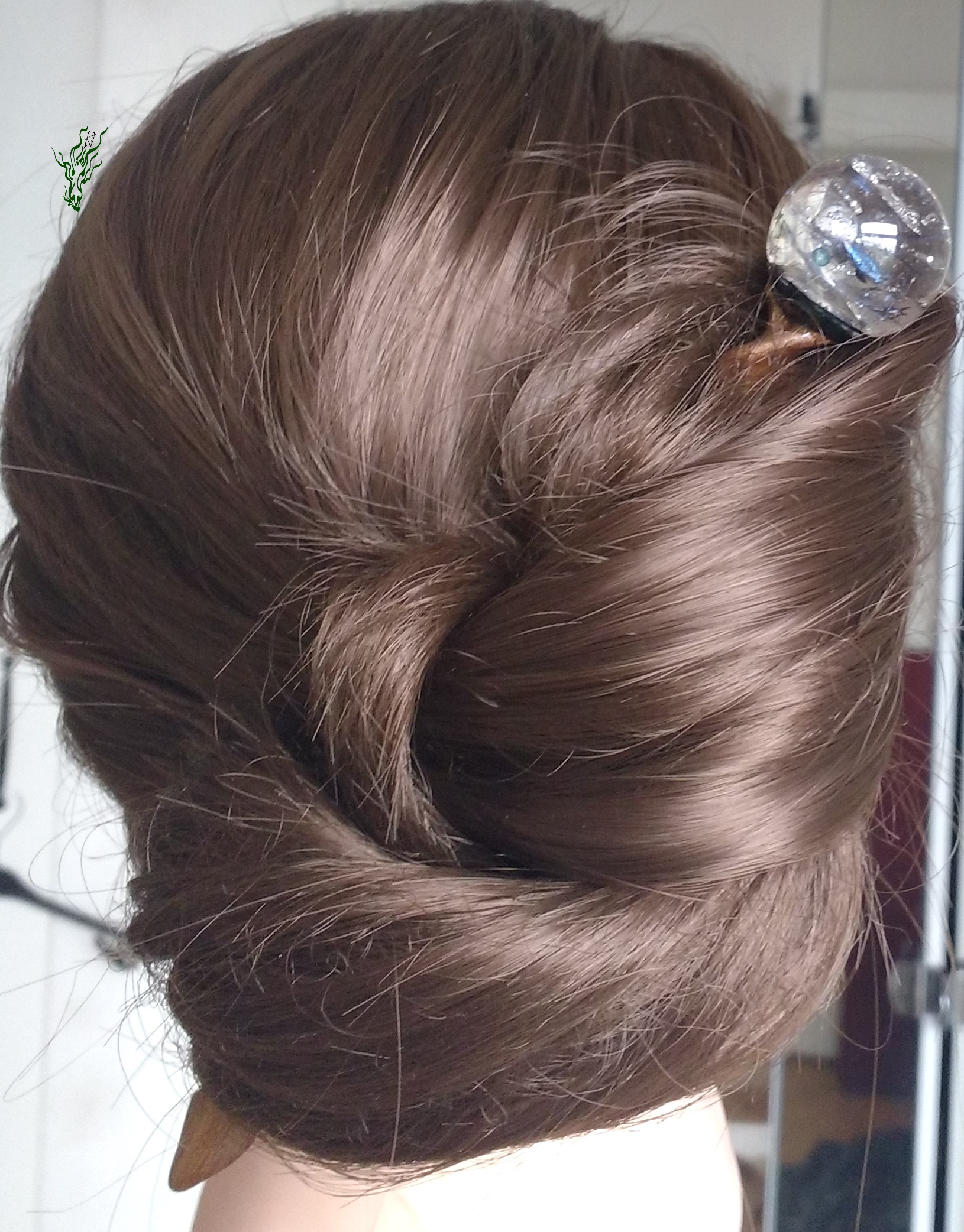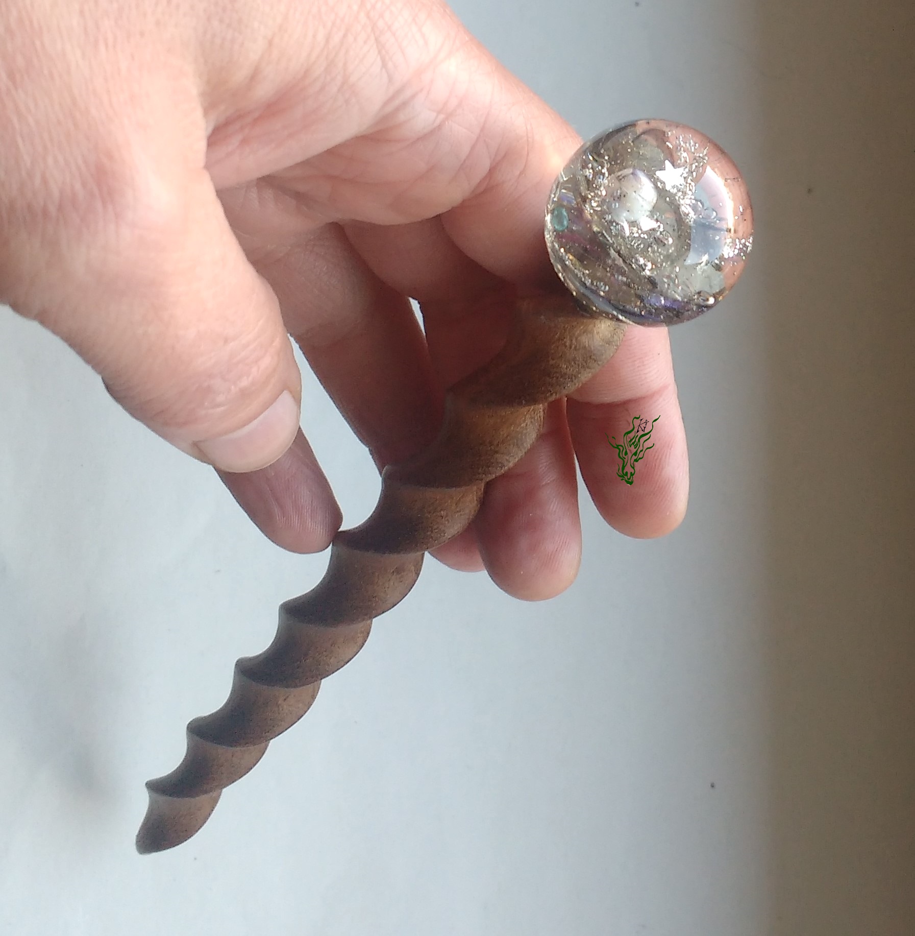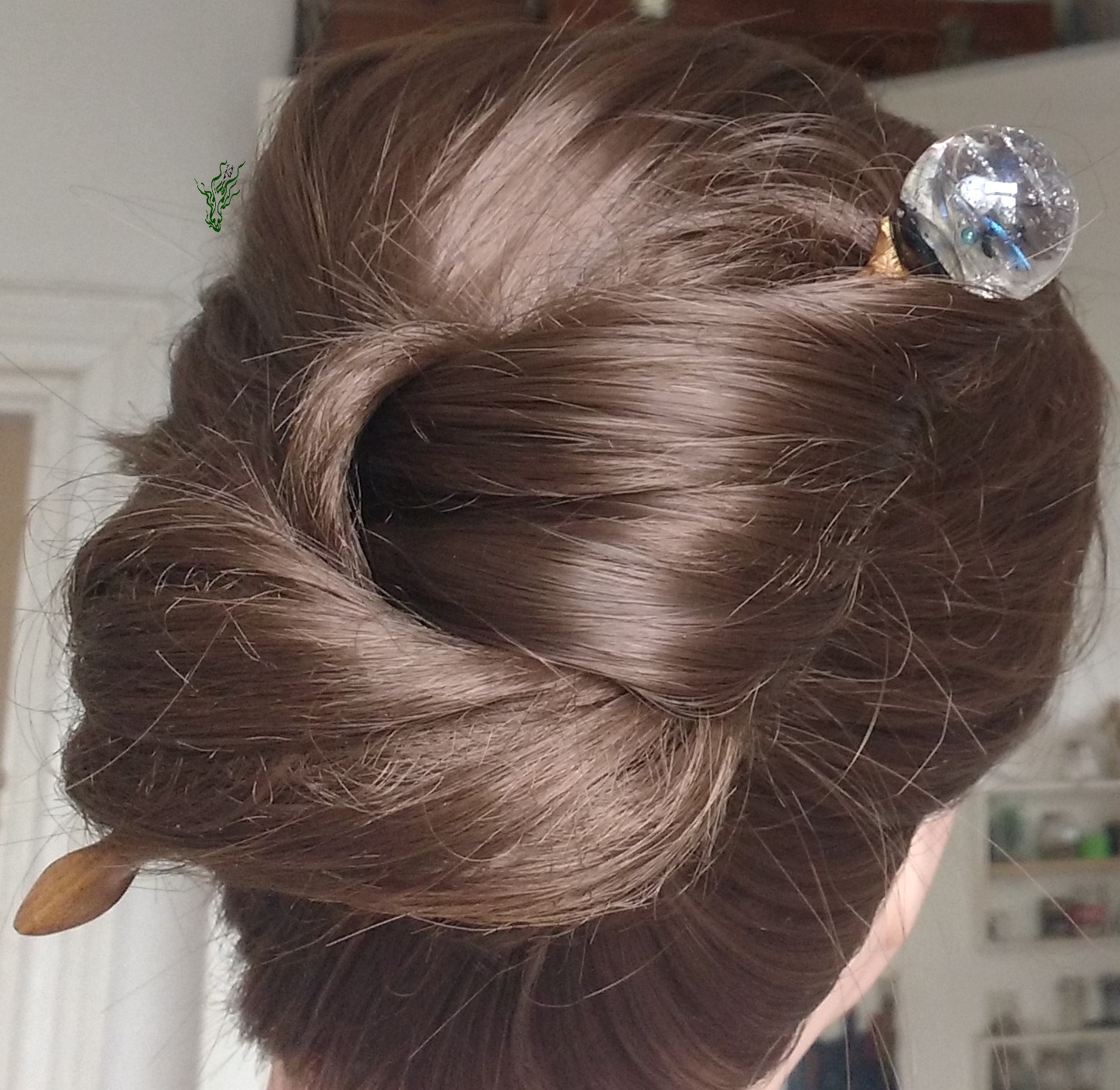 Den Haarstab selbst habe ich von Hand aus einem herrlichen Stück GoldregenHolz geschnitzt. Spiralformen mag ich am liebsten, wie du weißt – sie halten so gut.