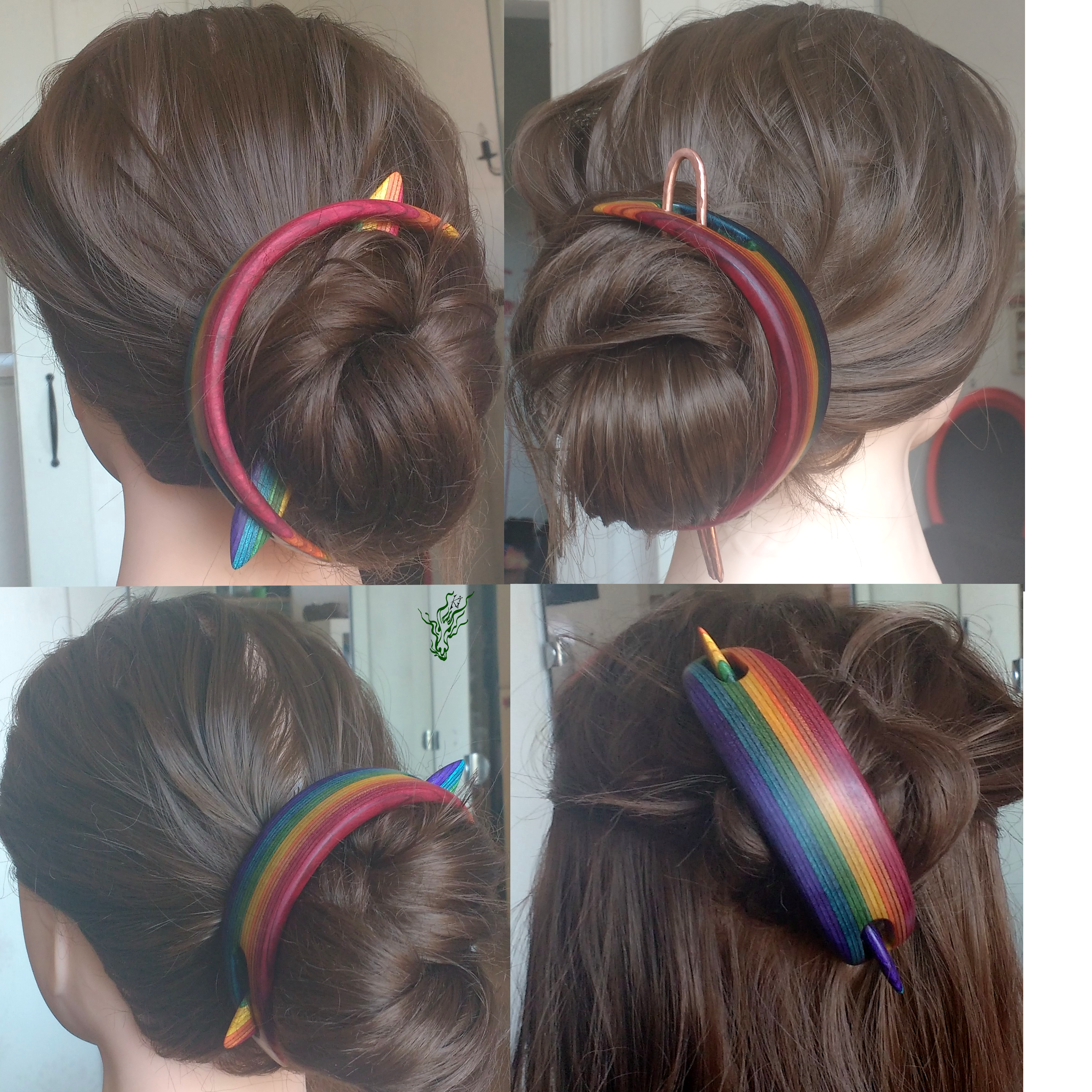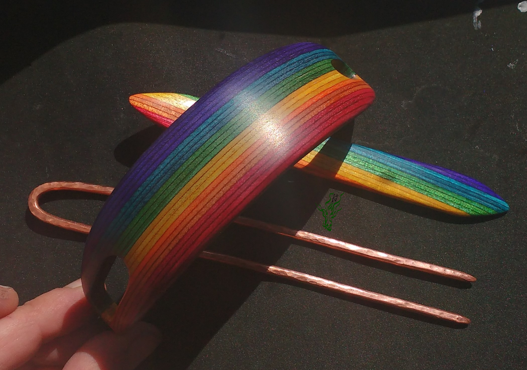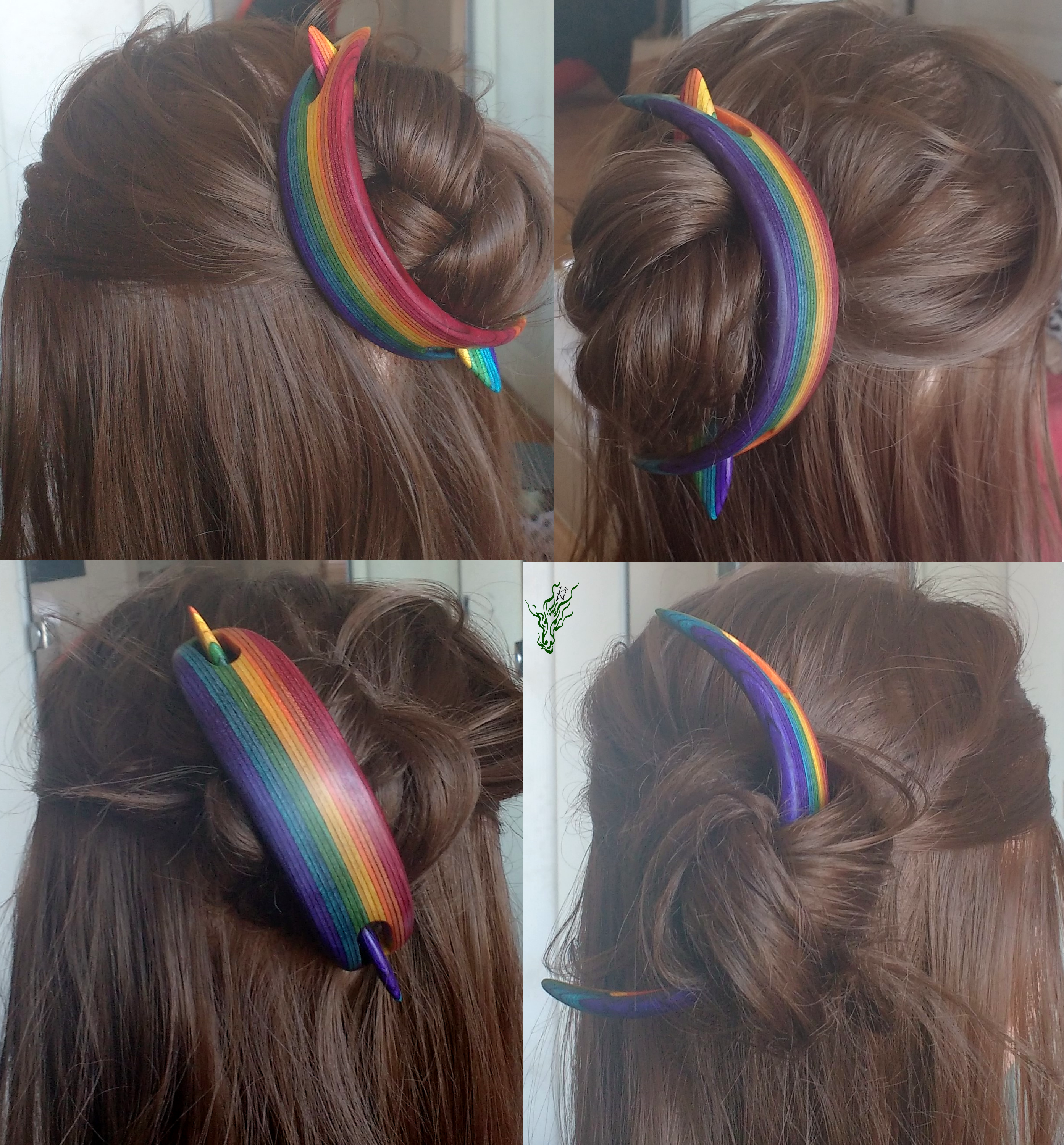 Haarspange aus meinem herrlichen selbst designten RegenbogenHolz mit passendem Regenbogenstab und gehämmerte Kupferforke im Set. Ich selbst hab so meine Schwierigkeiten, Haarmonde zum Halten zu bringen & deshalb wieder mal ein wenig experimentiert, um einen bequemen Mond- Haarschmuck zu kreieren.