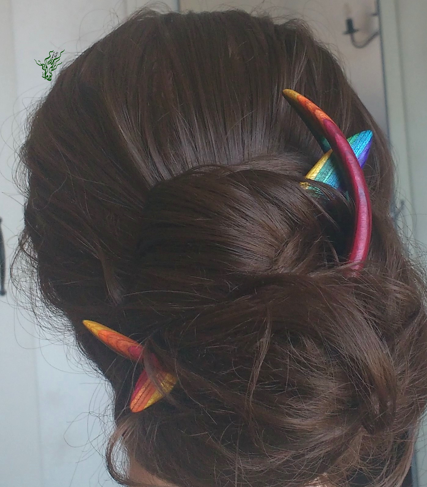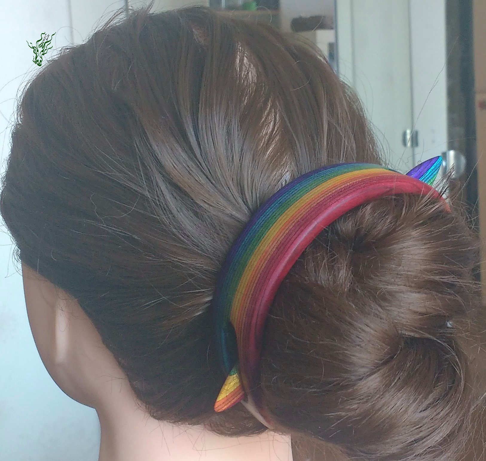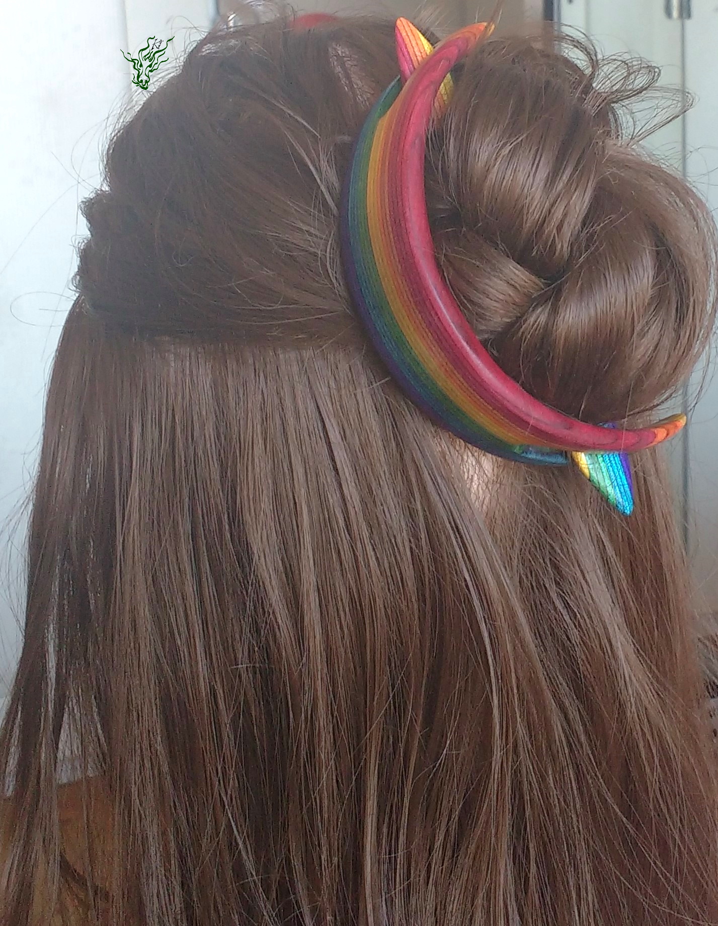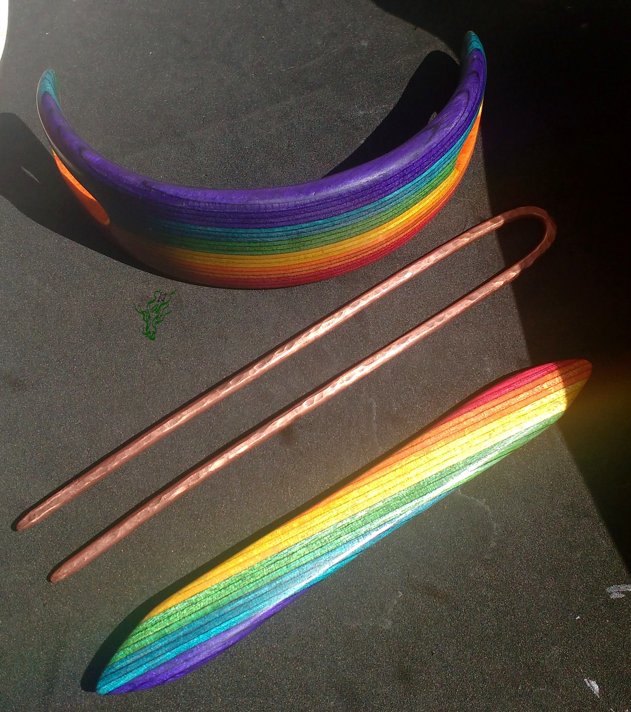 Haarspange aus meinem herrlichen selbst designten RegenbogenHolz mit passendem Regenbogenstab und gehämmerte Kupferforke im Set. Ich selbst hab so meine Schwierigkeiten, Haarmonde zum Halten zu bringen & deshalb wieder mal ein wenig experimentiert, um einen bequemen Mond- Haarschmuck zu kreieren.