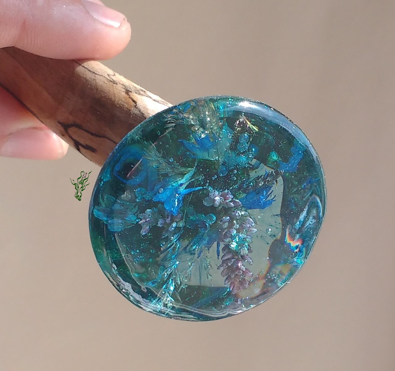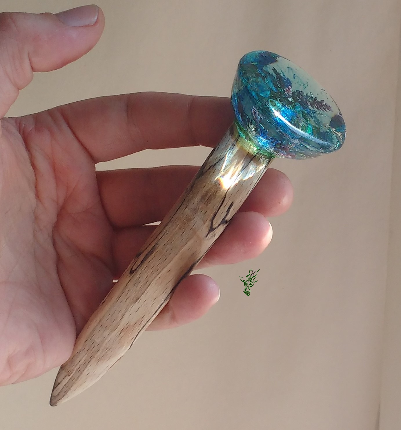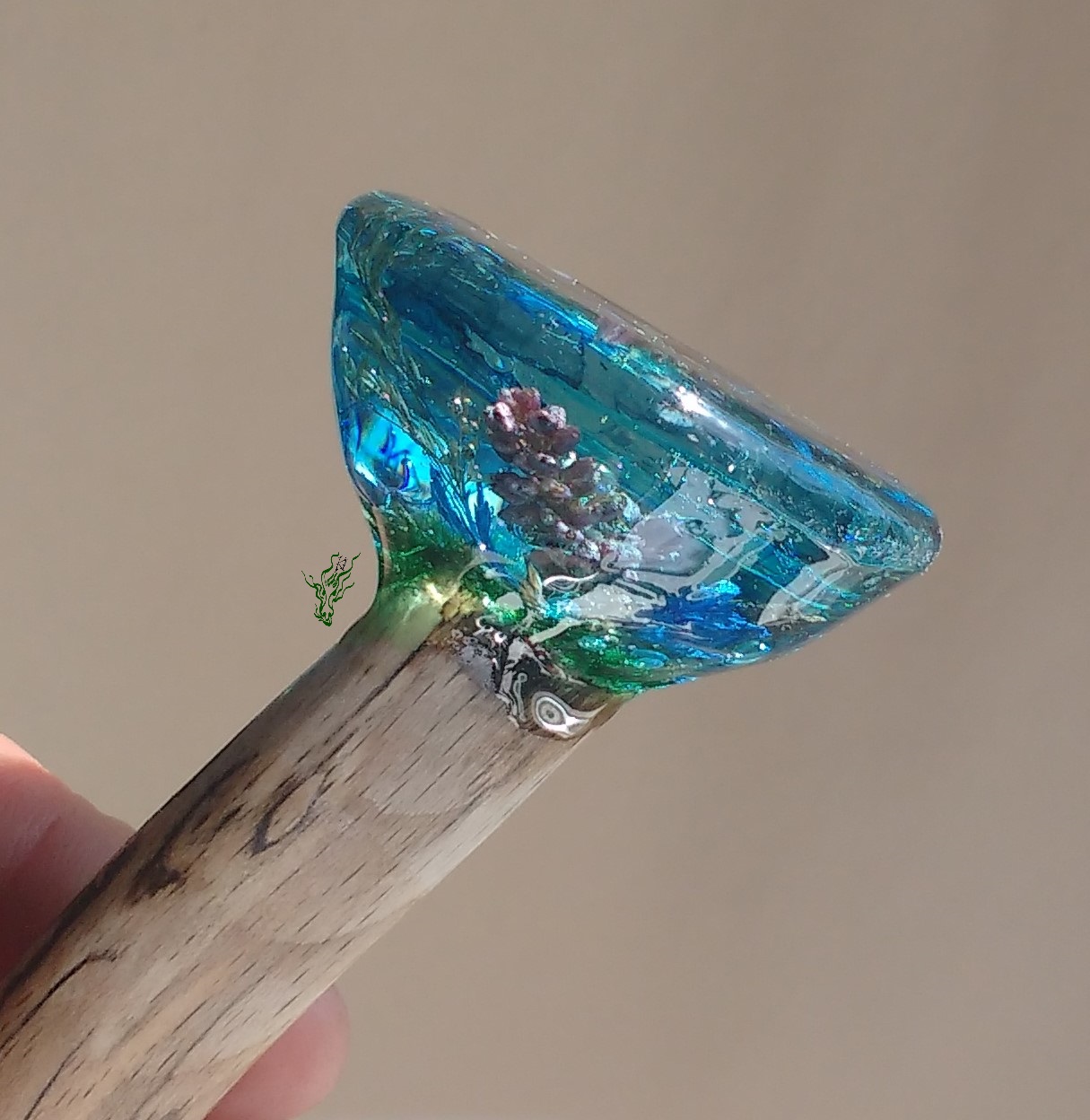 Breiter Gletscherstab , so bequem und  auch größere Topper kommen schön harmonisch mit einer breiteren Basis.  Dieser ist aus wunderbar gemasertem spalted beech wood (gestockte Buche), ich vergöttere die interessanten schwarzen Streifen.  In herrlichen Blautönen und einem *Potpurri* verschiedener Blüten  auf Wiese und irisierenden Blässchen.