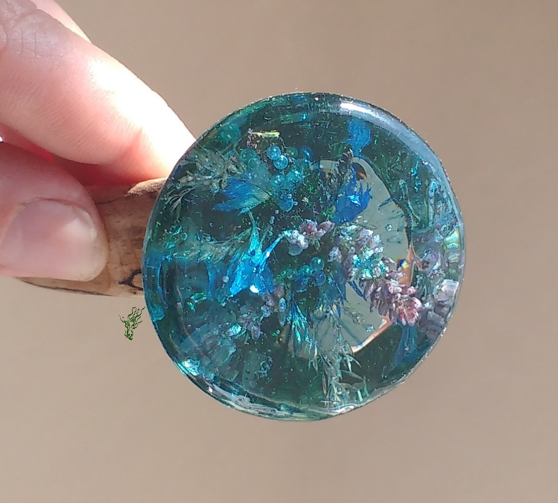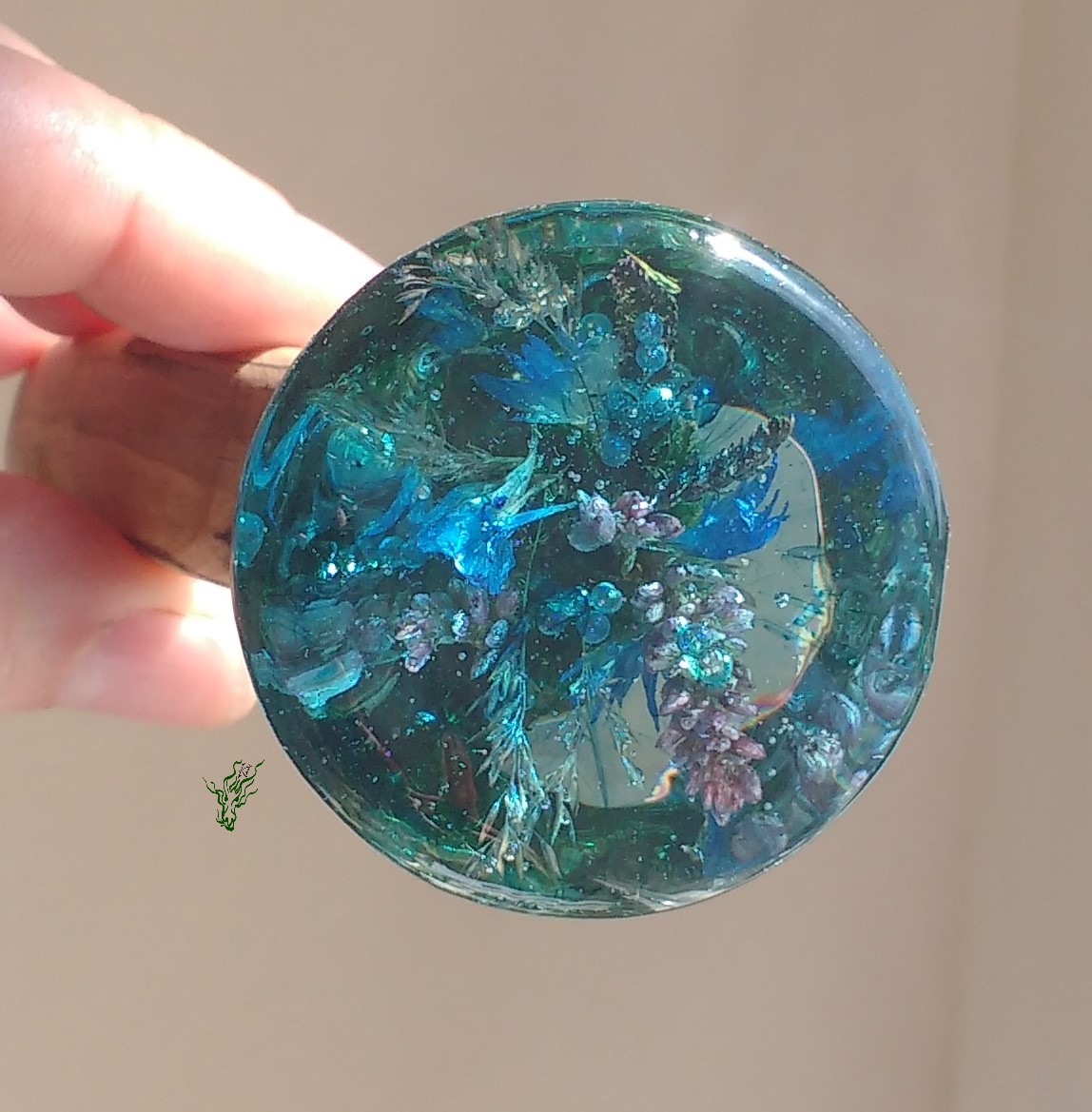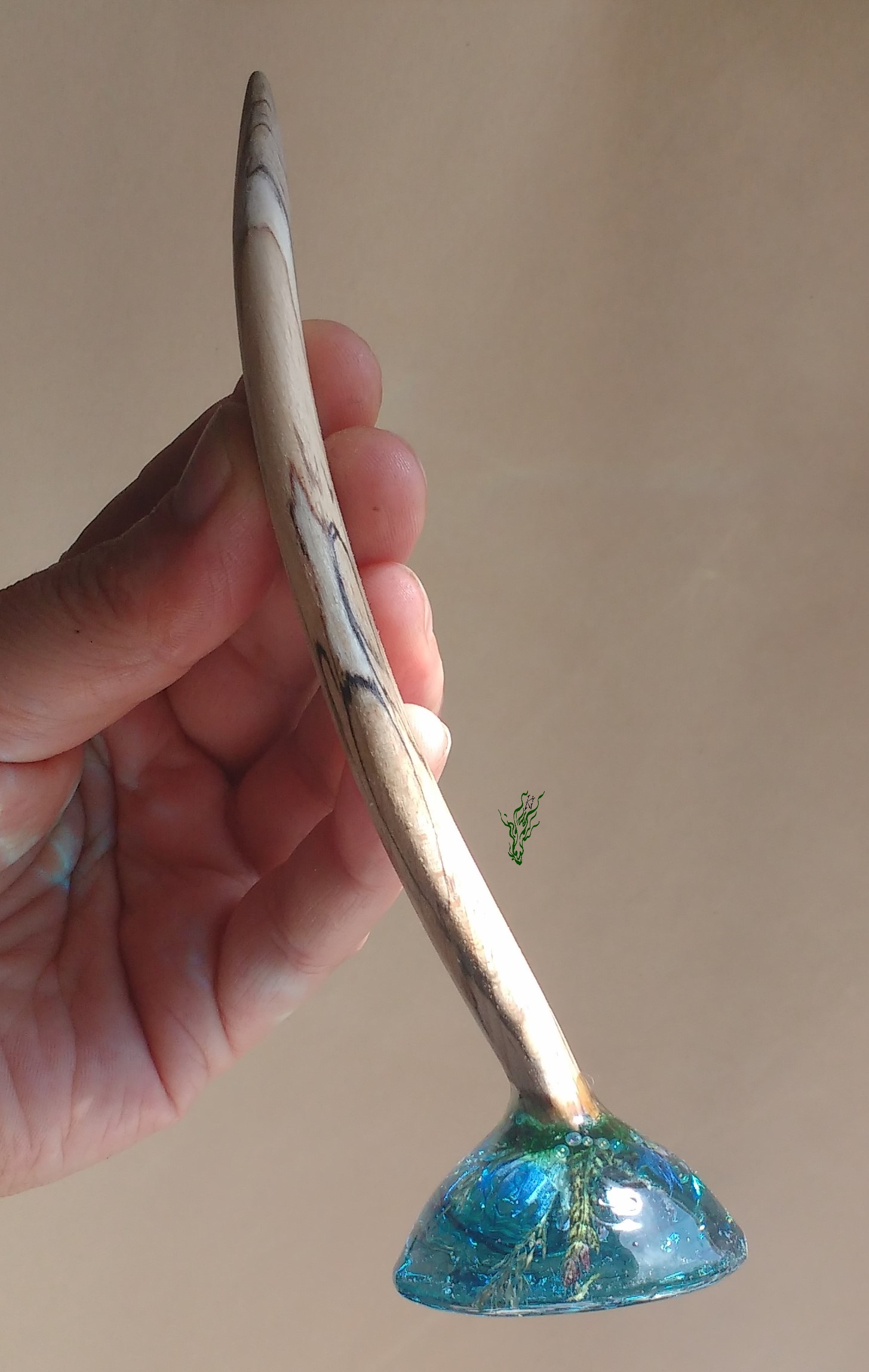 Breiter Gletscherstab , so bequem und  auch größere Topper kommen schön harmonisch mit einer breiteren Basis.  Dieser ist aus wunderbar gemasertem spalted beech wood (gestockte Buche), ich vergöttere die interessanten schwarzen Streifen.  In herrlichen Blautönen und einem *Potpurri* verschiedener Blüten  auf Wiese und irisierenden Blässchen.