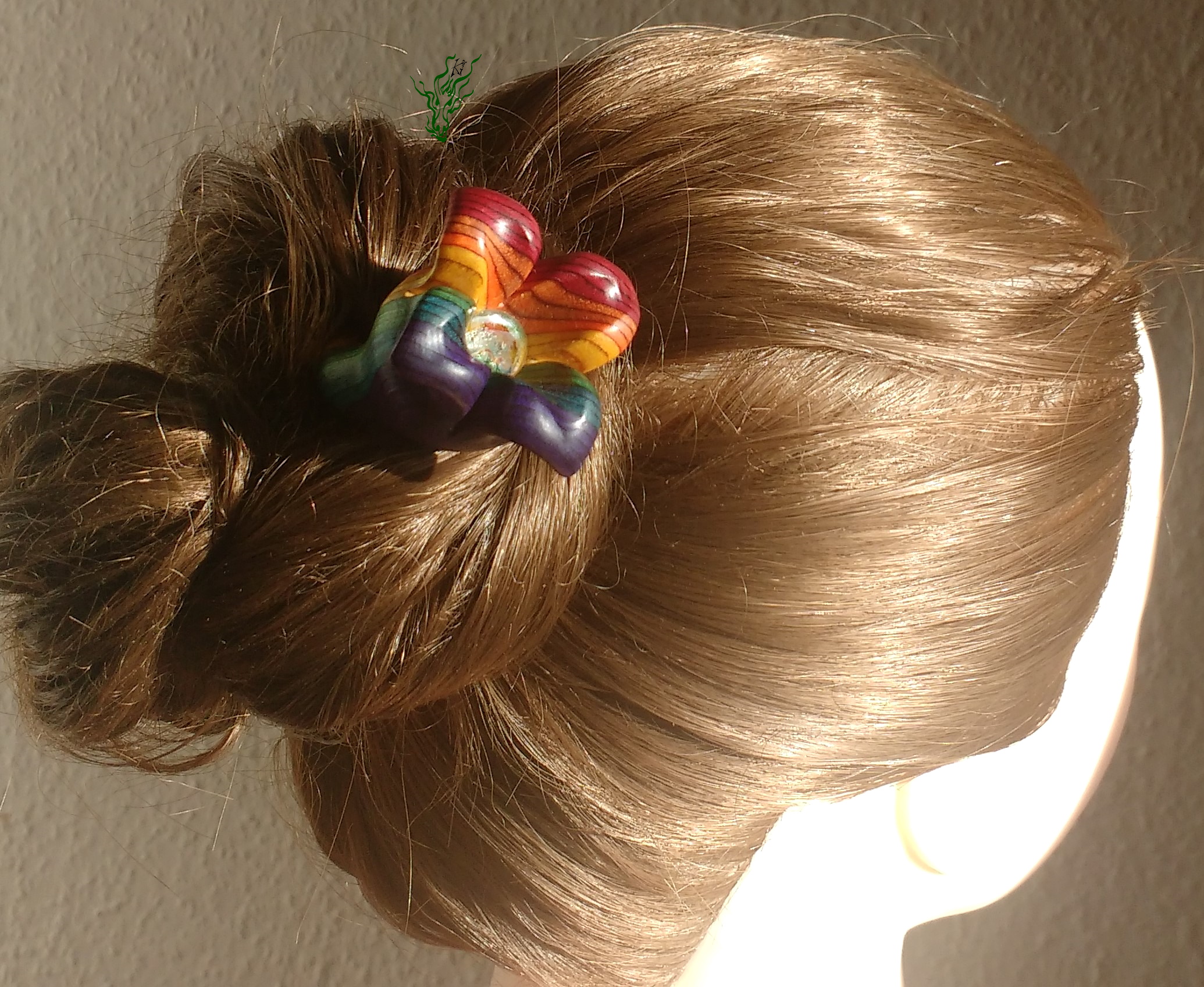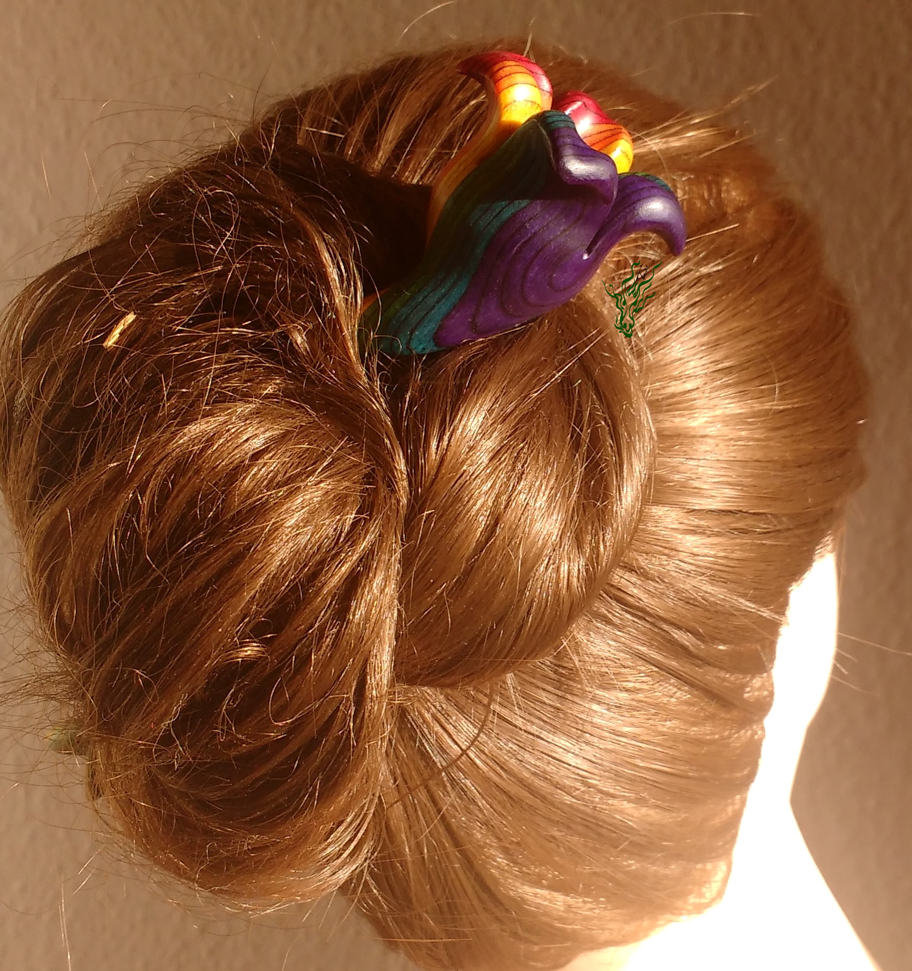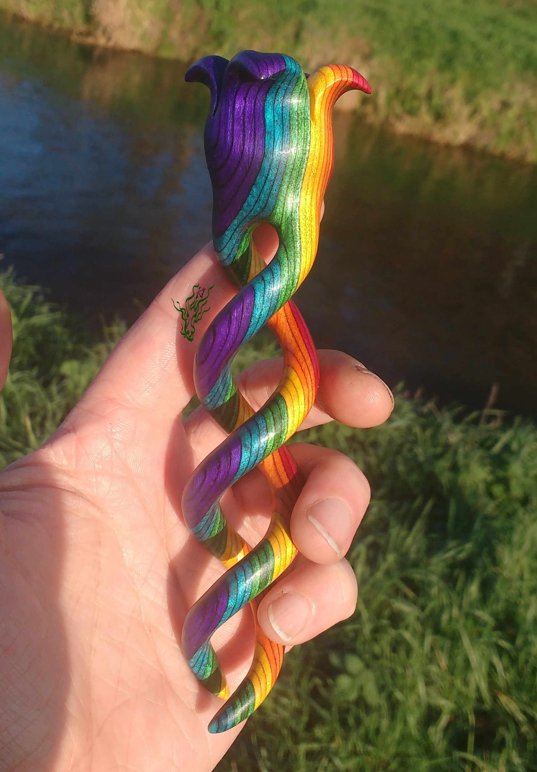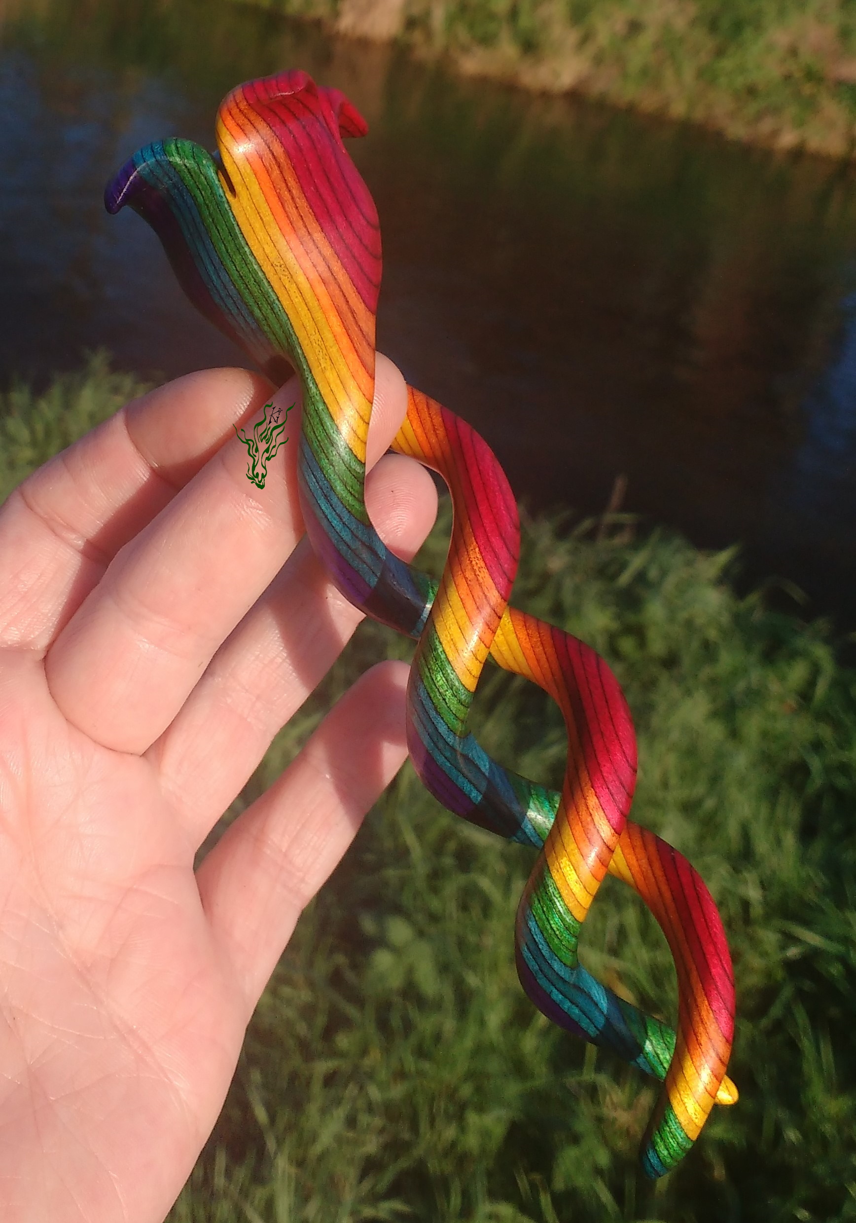 Mein RegenbogenHolz ist selbst designt und auf Echtholzbasis. Das komplette Farbspektrum des Regenbogens findest du in dieser bequemen 3D Haarforke – mit Helix- Beinen für besseren Halt. Die Spiralform fügt sich in deine Frisur. Du drehst sie einfach in den Dutt. Damit hält auch spontanes Gewuschel ^^