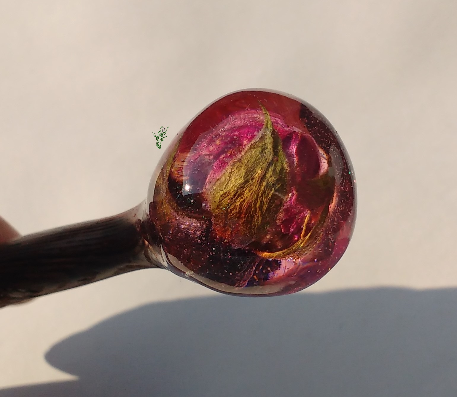 Dieses leichte Gletscherstäbchen präsentiert glänzendes Resin mit magischer Vielfalt auf aufregendem, mehrfarbig gemustertem WengeHolz. Mit kleinem Nöpsie für sicheren Halt. Der stört nicht beim Reinschieben, verhindert aber unkontrolliertes Rausrutschen. Der Haarstab ist so konzipiert, dass sich die Rose an deinen Dutt anfügt & perfekt ausbalanciert ist.