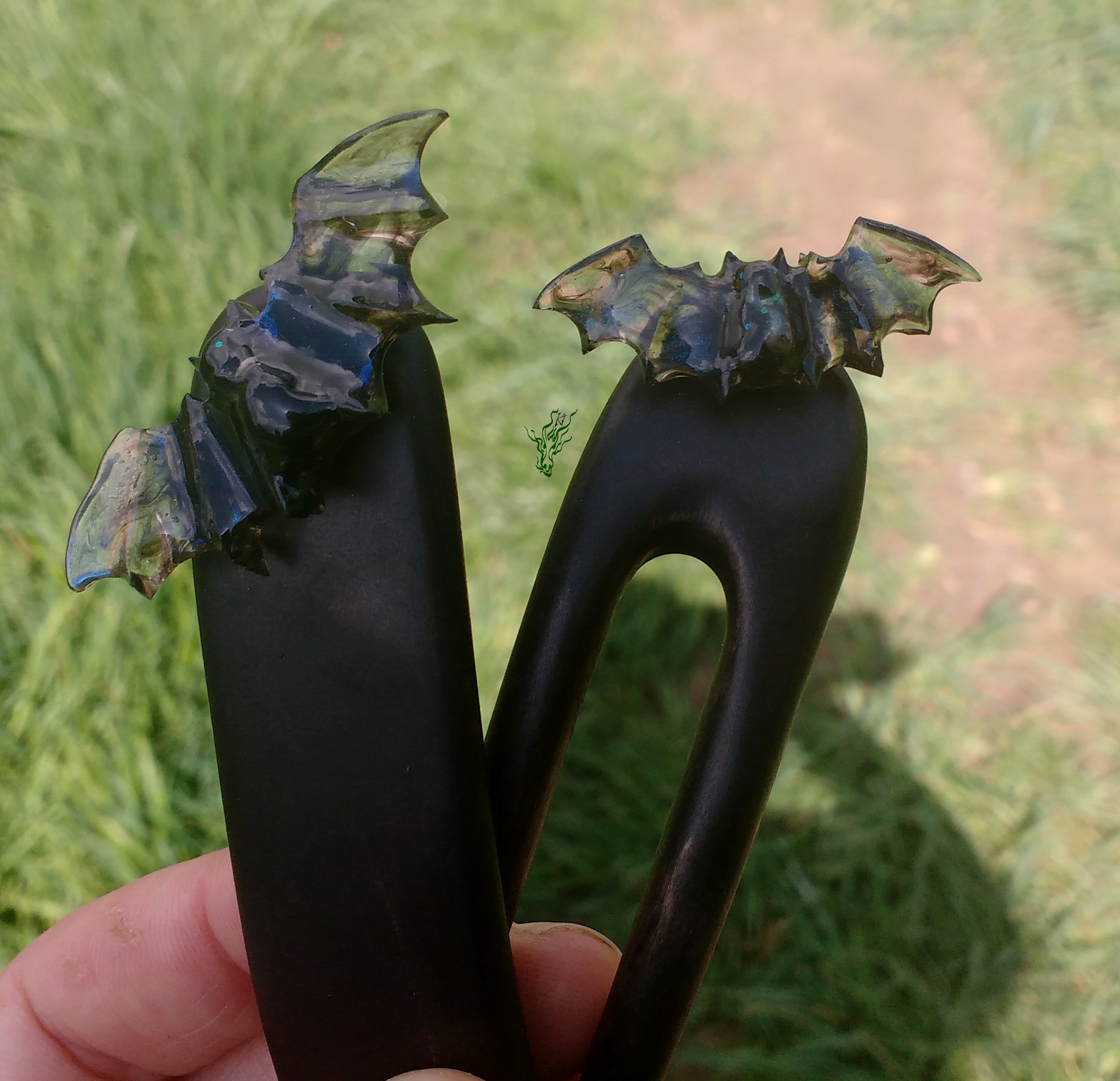Ein Set aus Birkenholz mit schwarzen Pigmenten mit hand geschnitzten Fledermäusen. Die Flügel schwarz- rauchig und beim richtigen Licht mit mystisch- blauem Schimmer. Federleicht und stabil. Breiter, gebogener Haarstab für exzellenten Halt oder leichte Haarforke mit Nöpsies? Adoptier nur einen oder das Set und fühl dich herrlich düster.