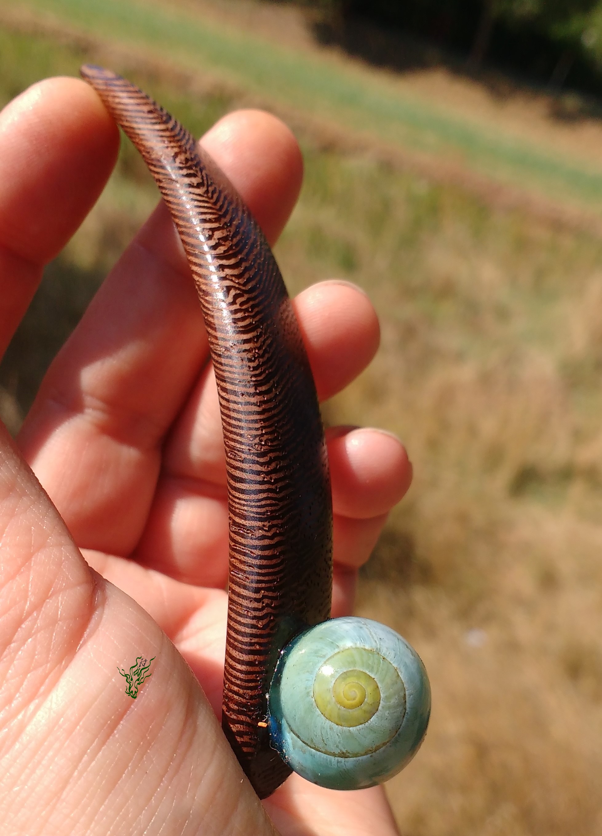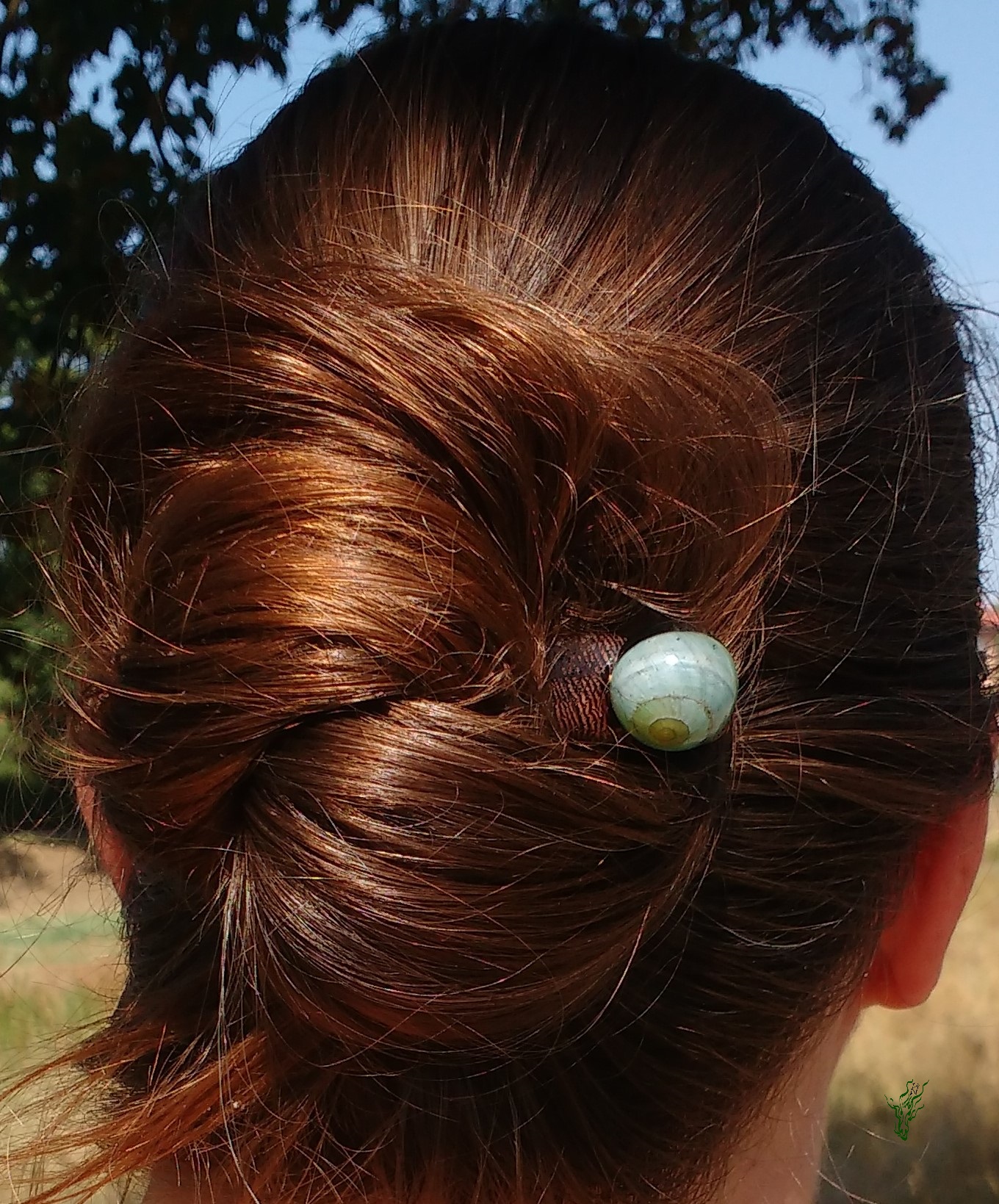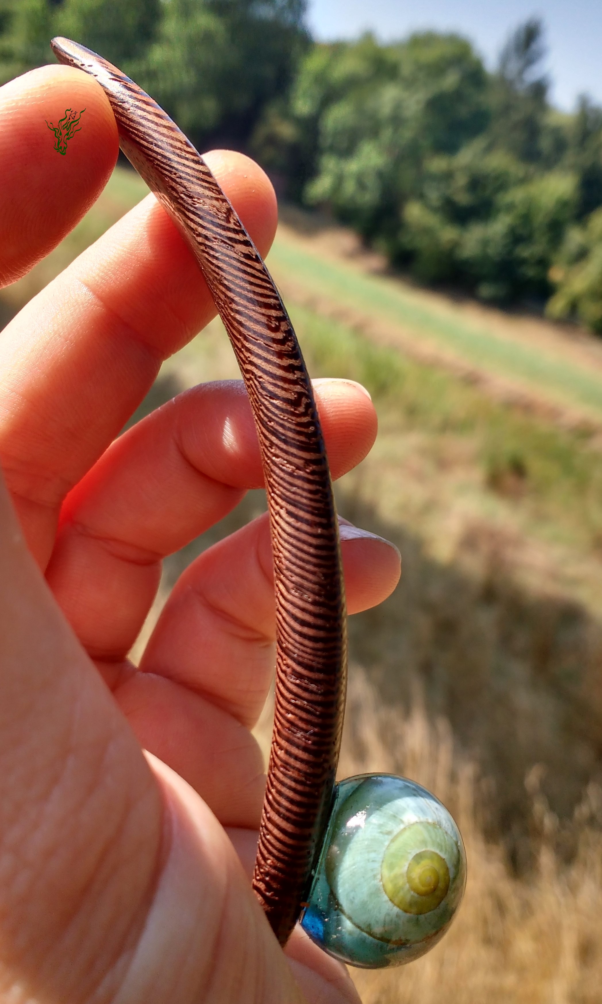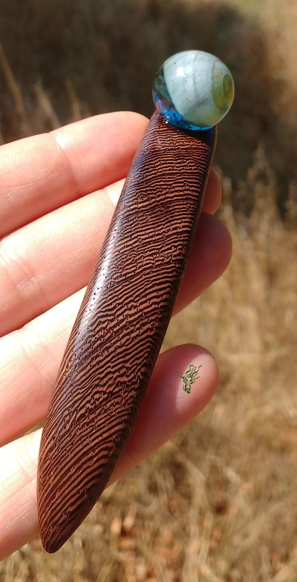 Die Kuppel ist durchsichtig- blau mit einem Schneckenhaus. Dieser breite Stab ist leicht, bequem und hält durch die starke Biegung in Kopfform sicher, wird nicht heraus rutschen & vor allem nicht komisch vom Kopf abstehen. Das herrlich gemaserteWengeholz trägt Ringelstrumpfhosen. Natürlich wie all meine Holz Haarschmückers vor Feuchtigkeit geschützt von einem Öl- Wachs – Finish