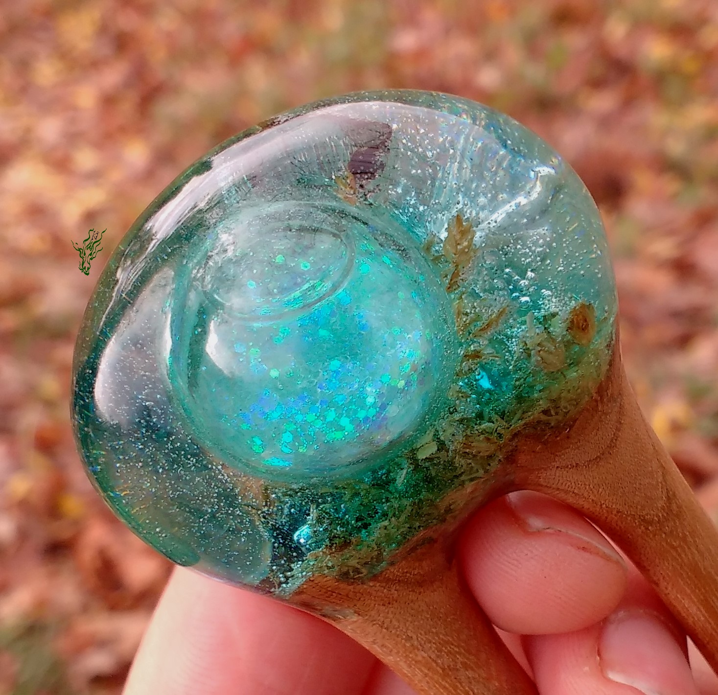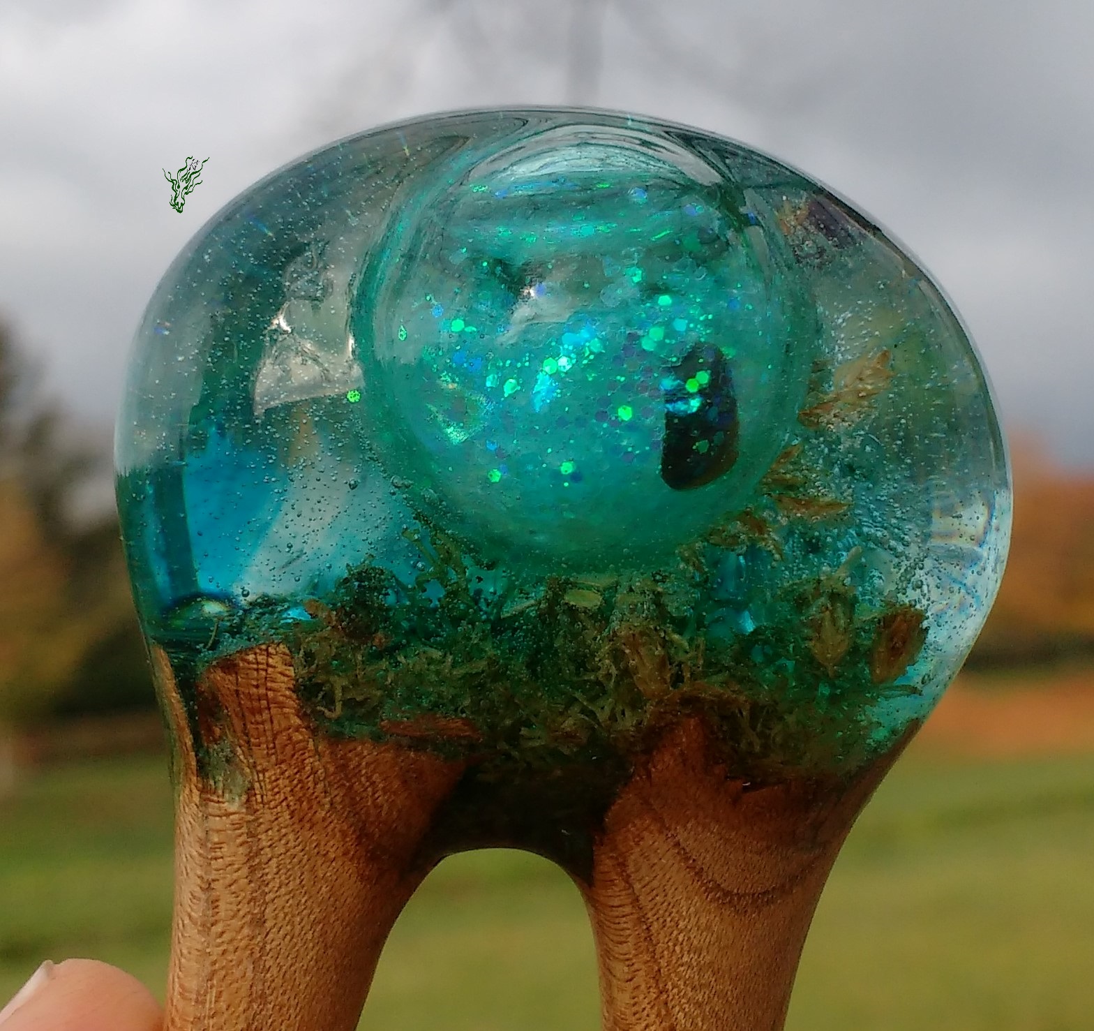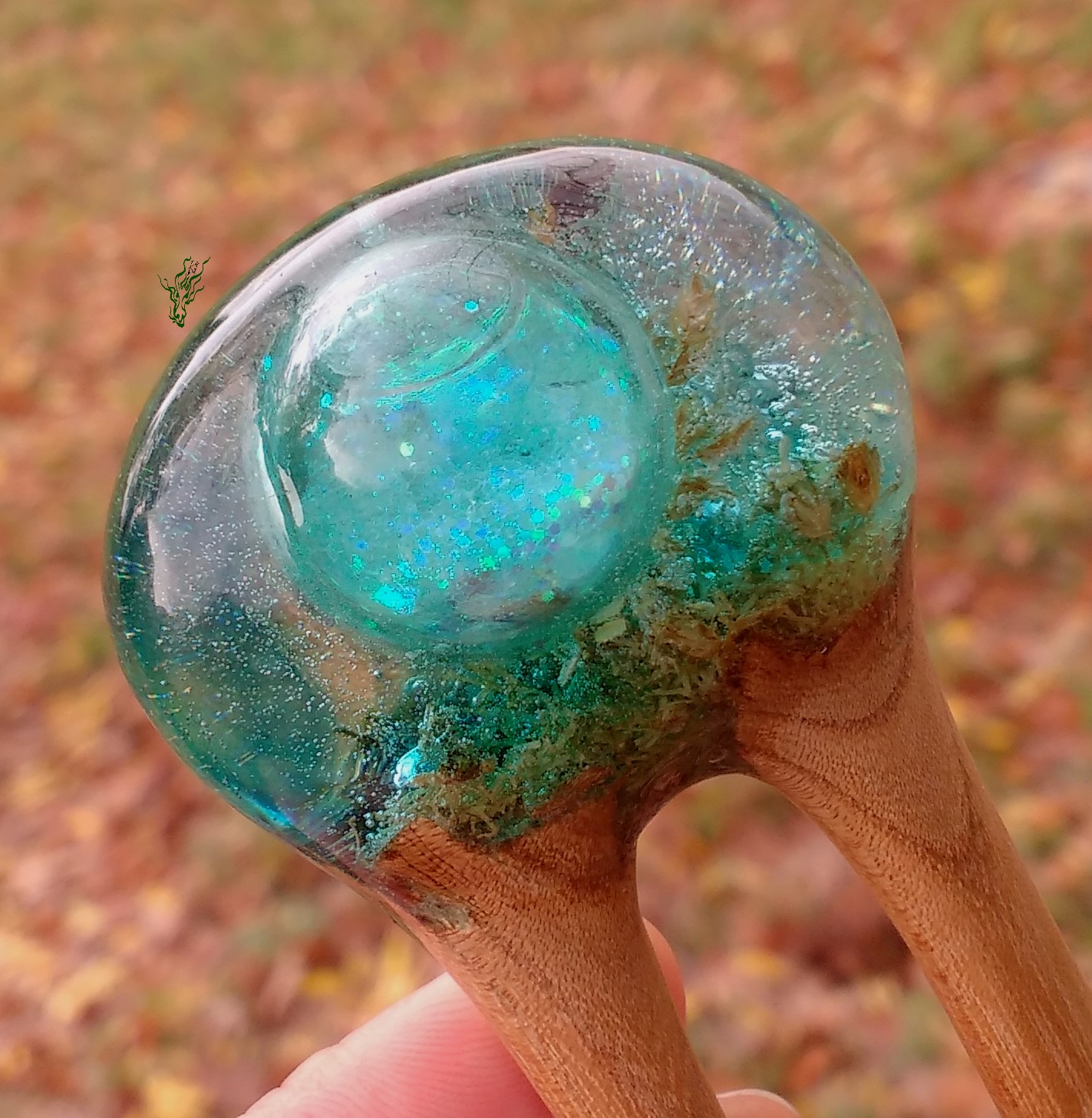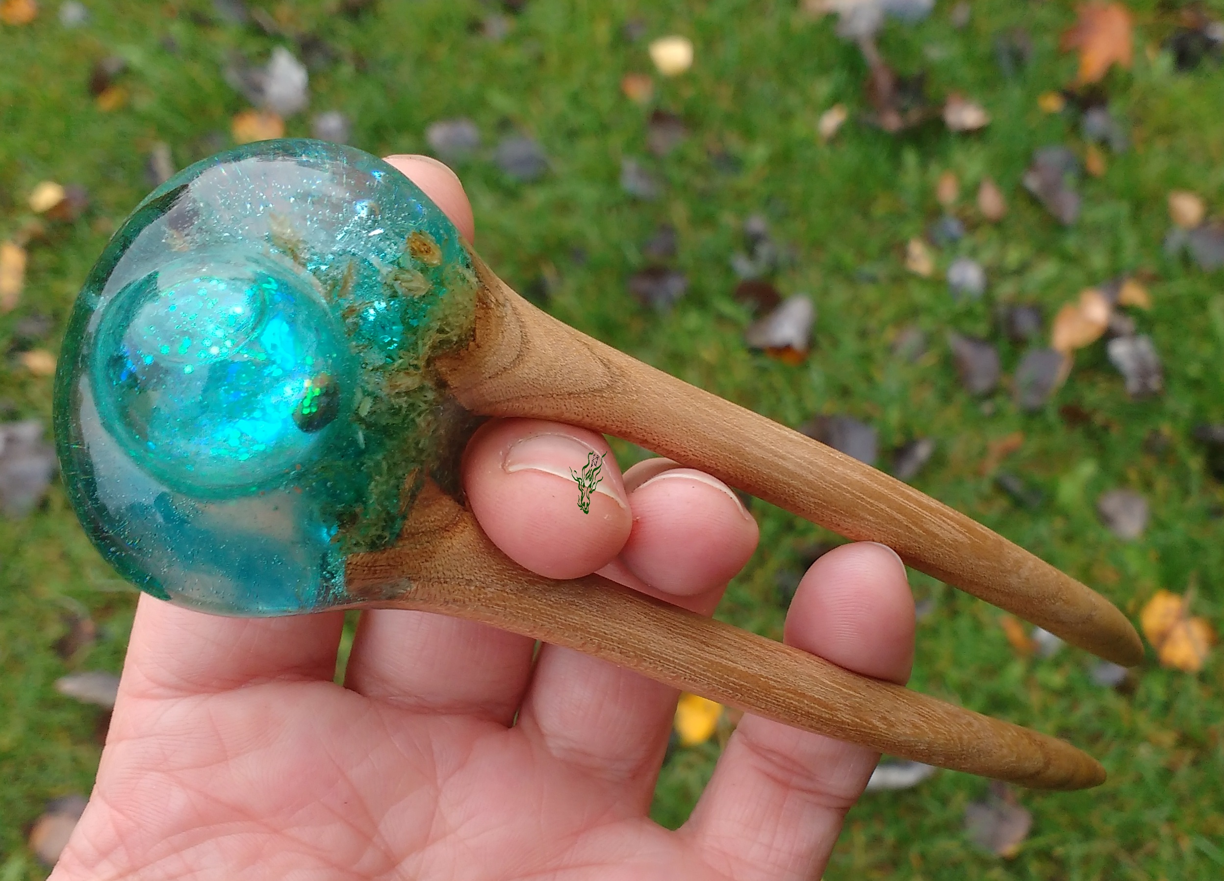 So, meine Spielkinder, wer sich an meine Anfangszeiten erinnert, weiß bestimmt noch, dass so´ne Schneekugel- Geschichte mich die ganze Zeit gereizt hat. Für alle Mädchen, die sich nach Einhörnern sehnen: eine Haarforke mit Bullauge, in dem ordentlich Glitzer & Tigerauge- Splitter schwimmen. Ich mag, wenn die Dinge sich bewegen. Hier bewegt sich ganz viel, du musst nur ein bisschen schütteln  ^^