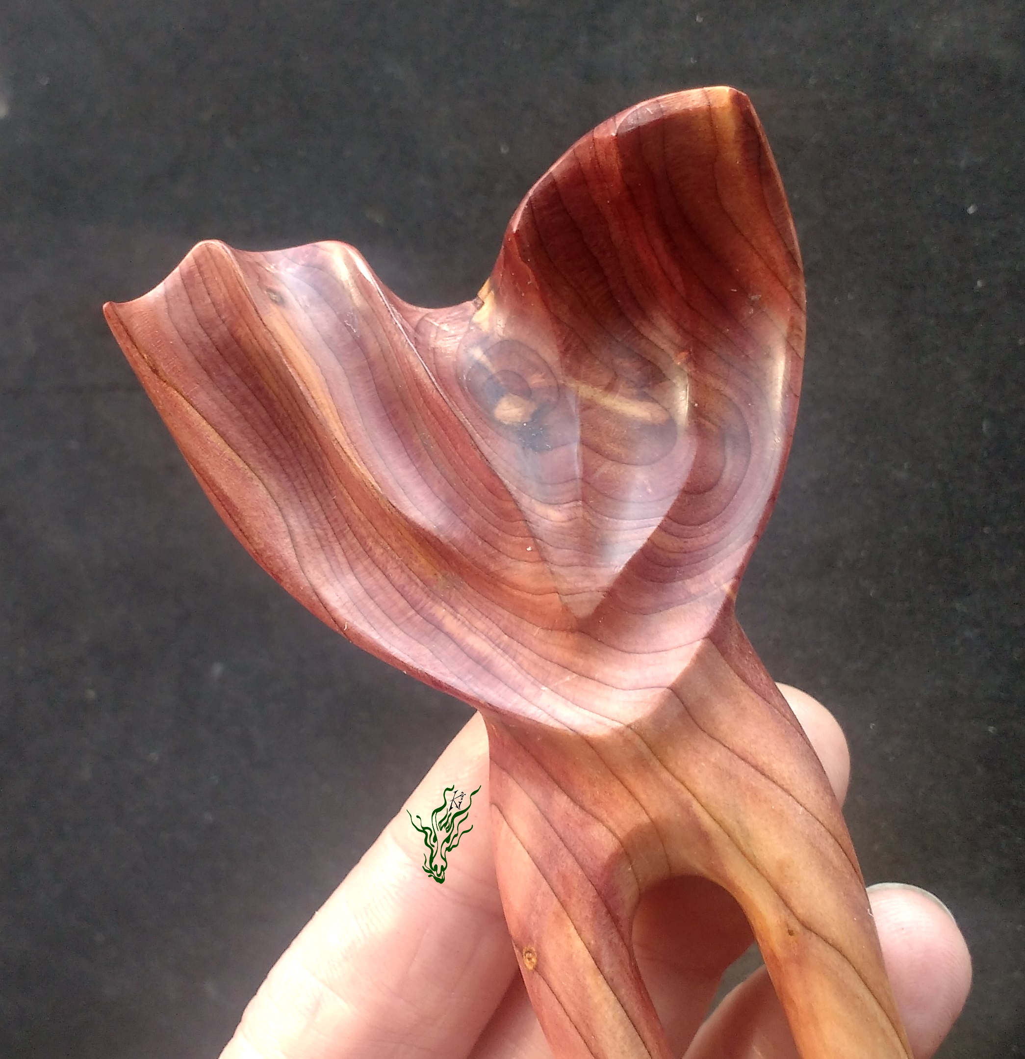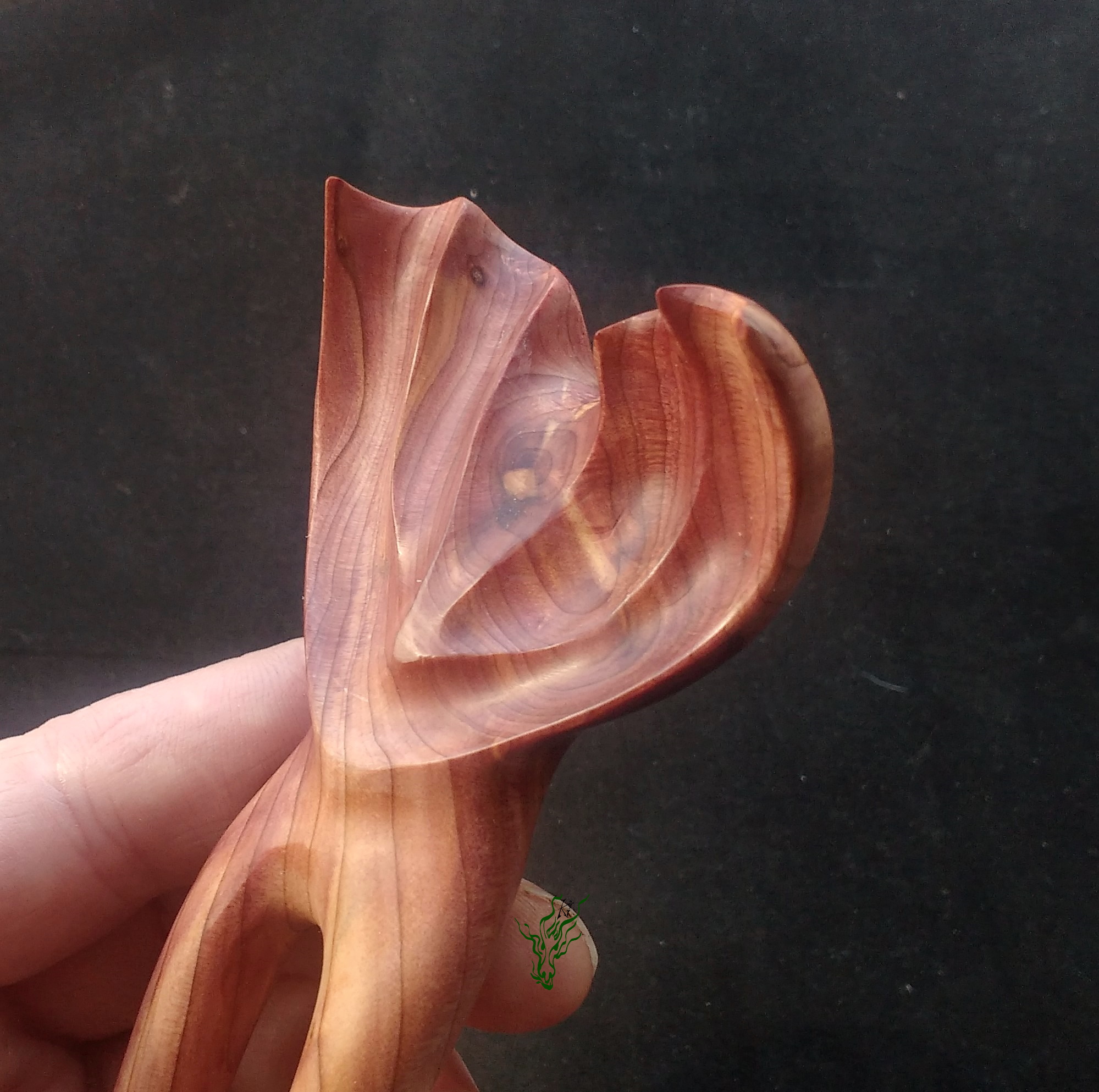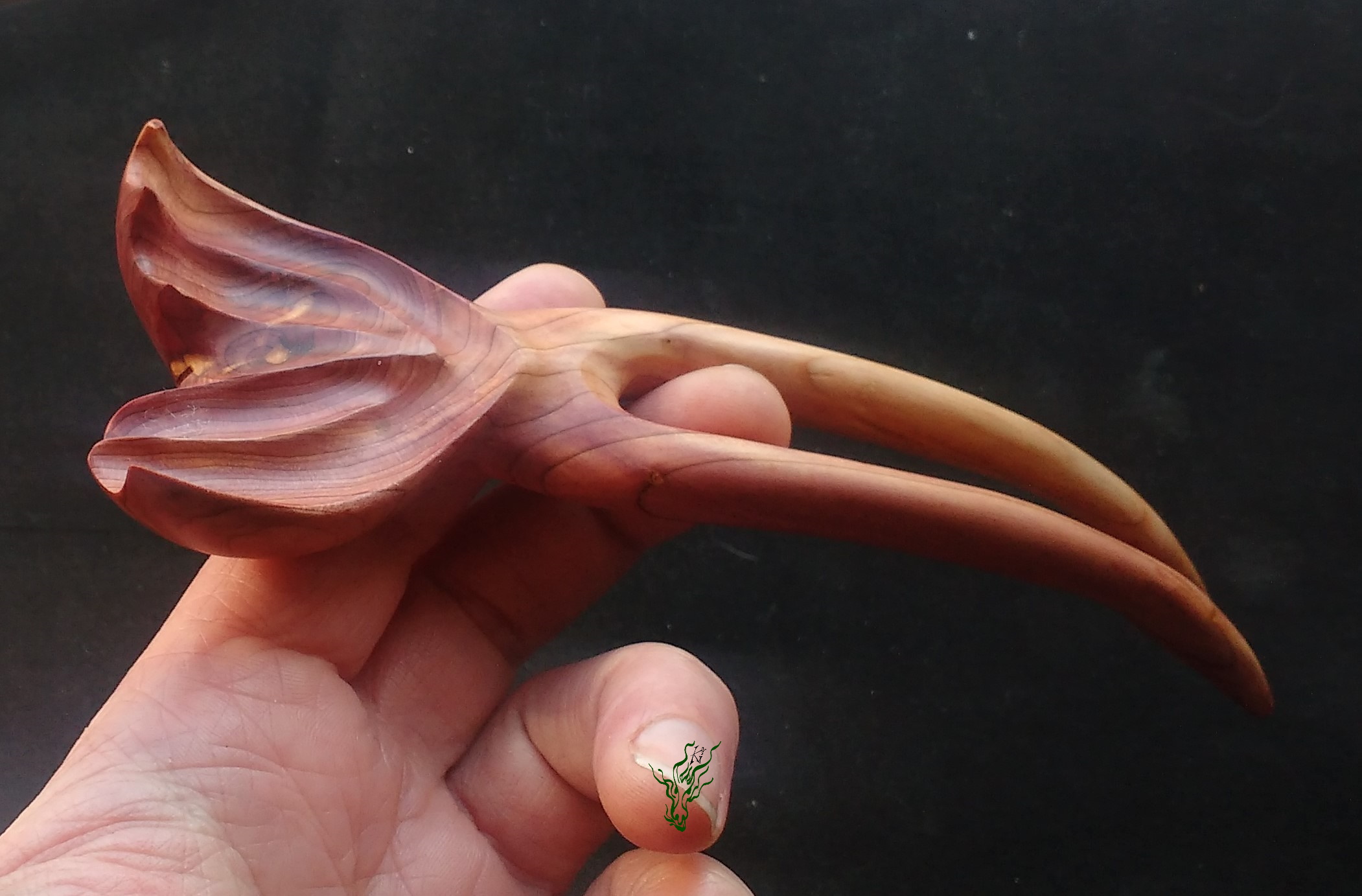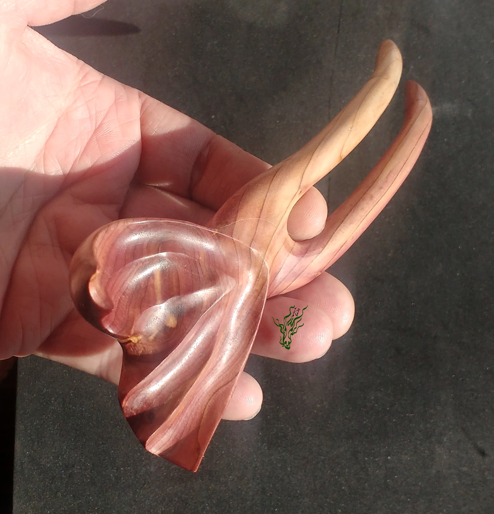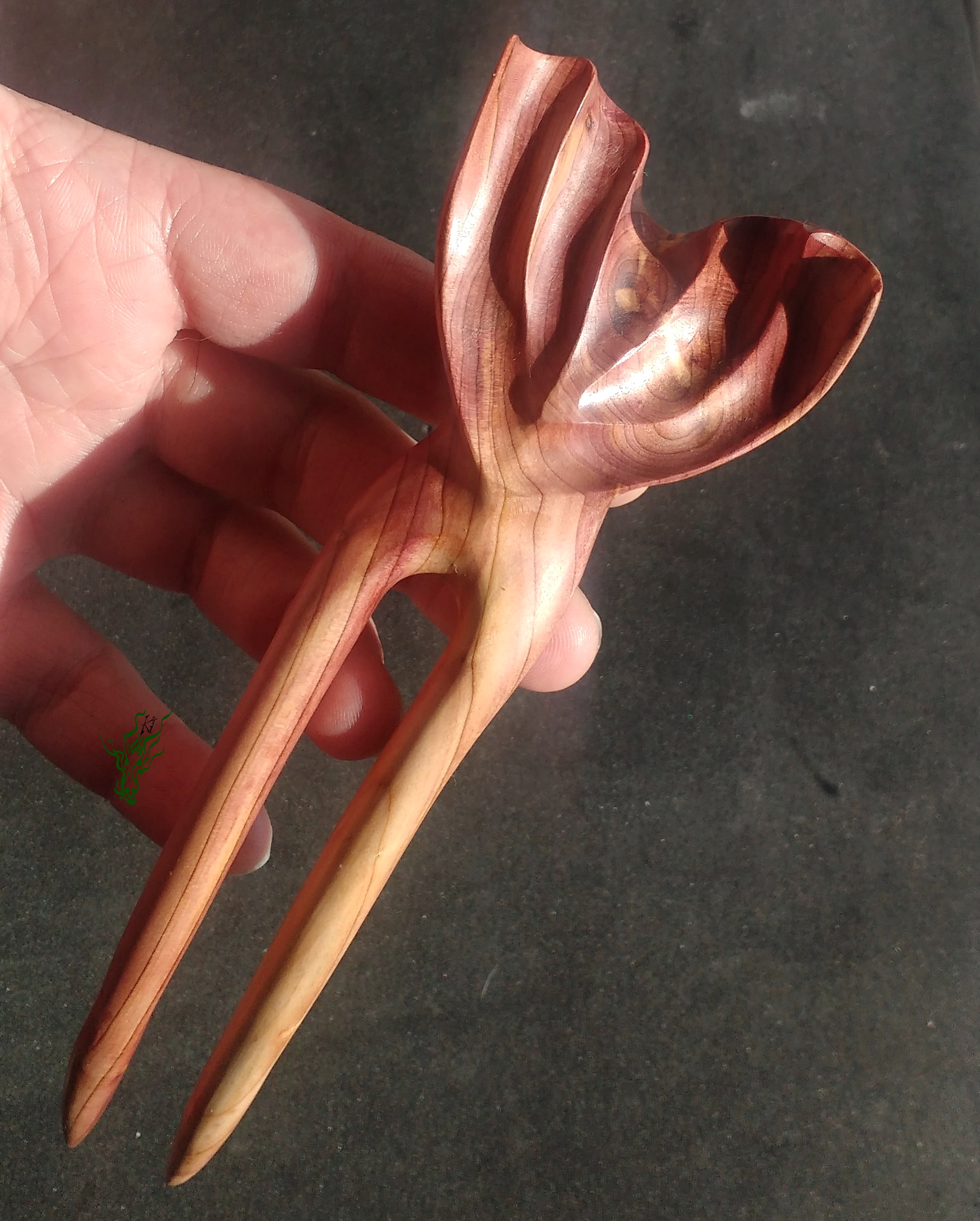 Haarforke aus meinem herrlich gemaserten roten Wacholderholz mit cremigen, violetten & rosa  swirls. Der  Wacholder war älter als ich, als er fallen musste – und wer den Jadedrachen von Anfang an kennt, weiß , dies ist meine erste Holzliebe. Schon allein der Duft, hach. Im Sonnenlicht wird sich die Farbe verändern, zu wunderbar schokoladigen Tönen, die Muster bleiben natürlich so aufregend.