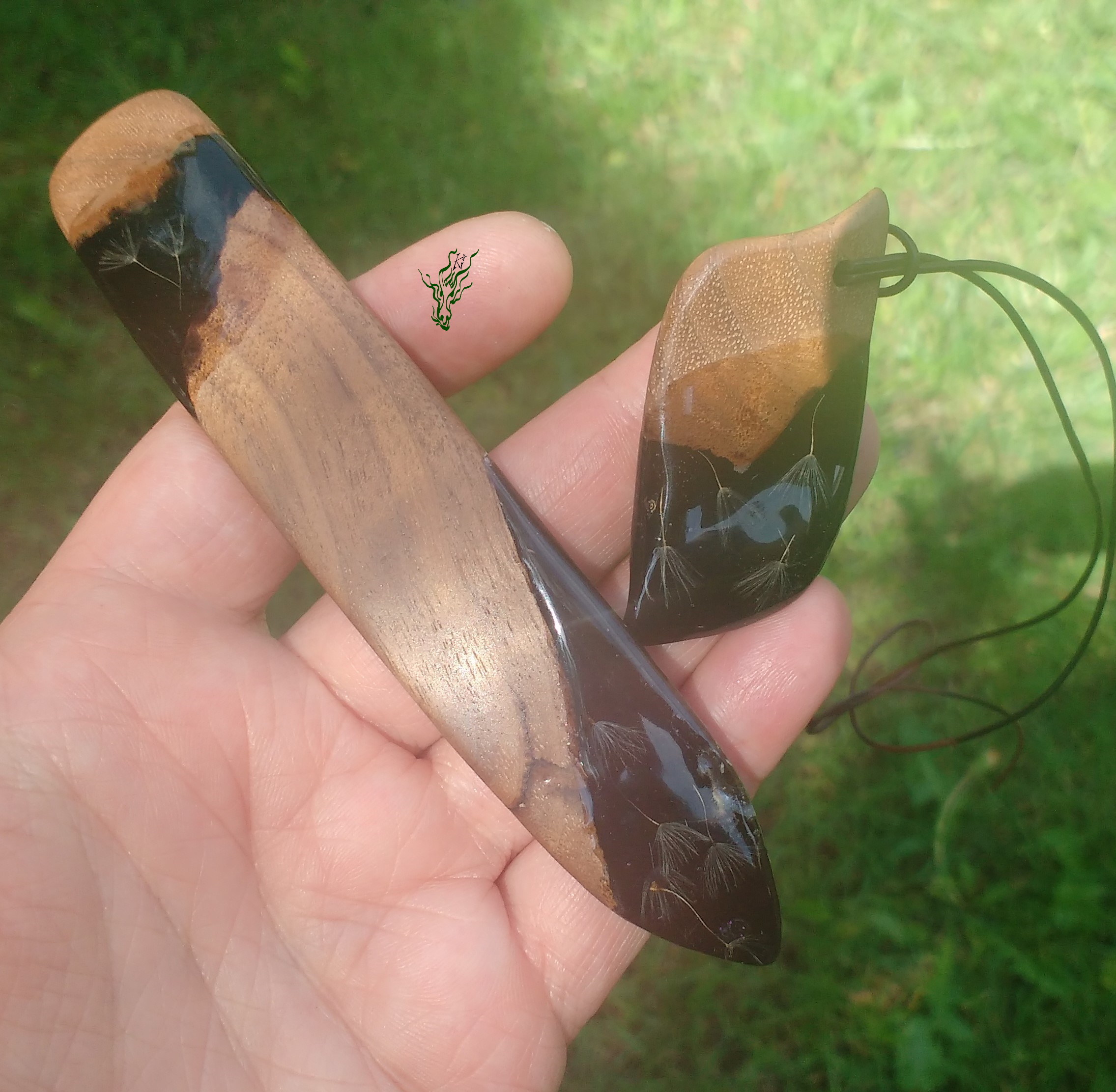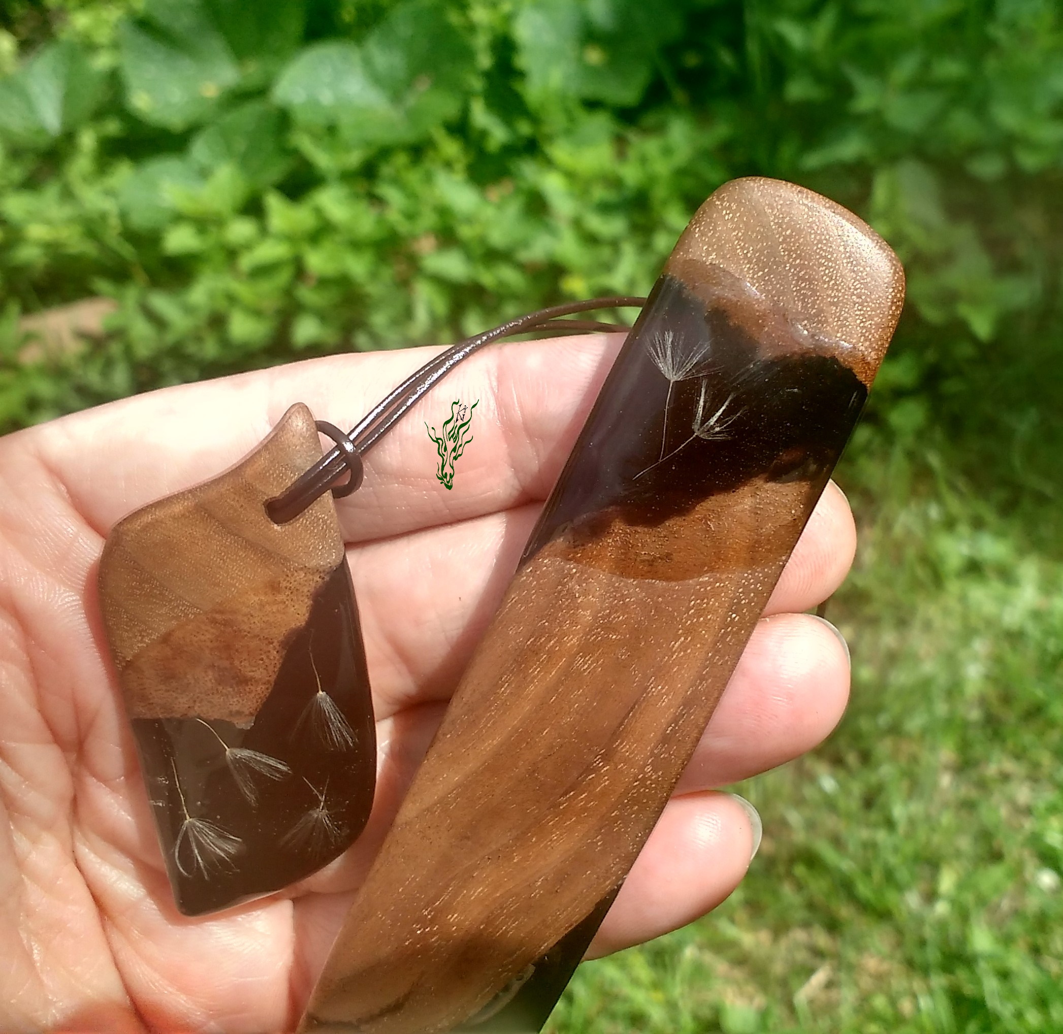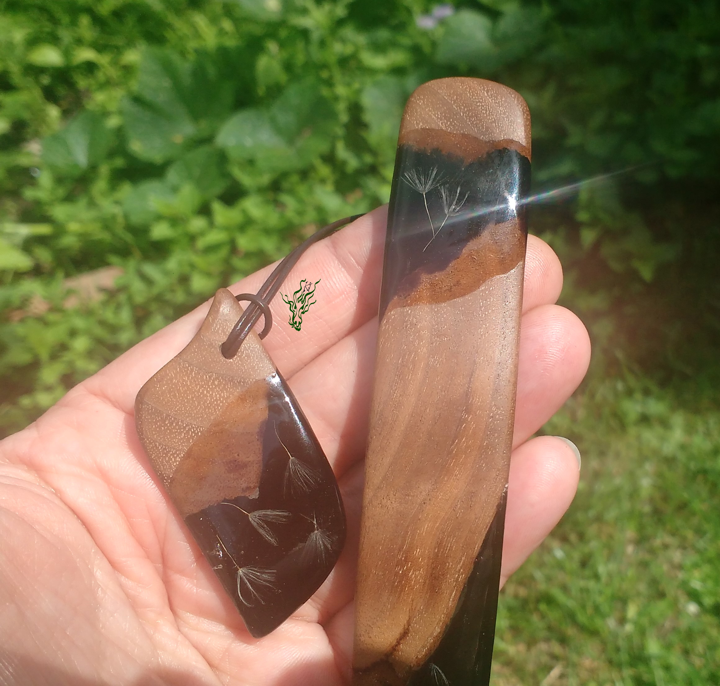 Breiter Gletscherstab , so bequem aus wunderschönem WalnussHolz.  Mit Pustenblume- Schirmchen & Geriesel in schwarzem Resin – für Schönheit auf beiden Seiten deines Dutts. Kommt mit passendem Anhänger aus den gleichen Materialien.