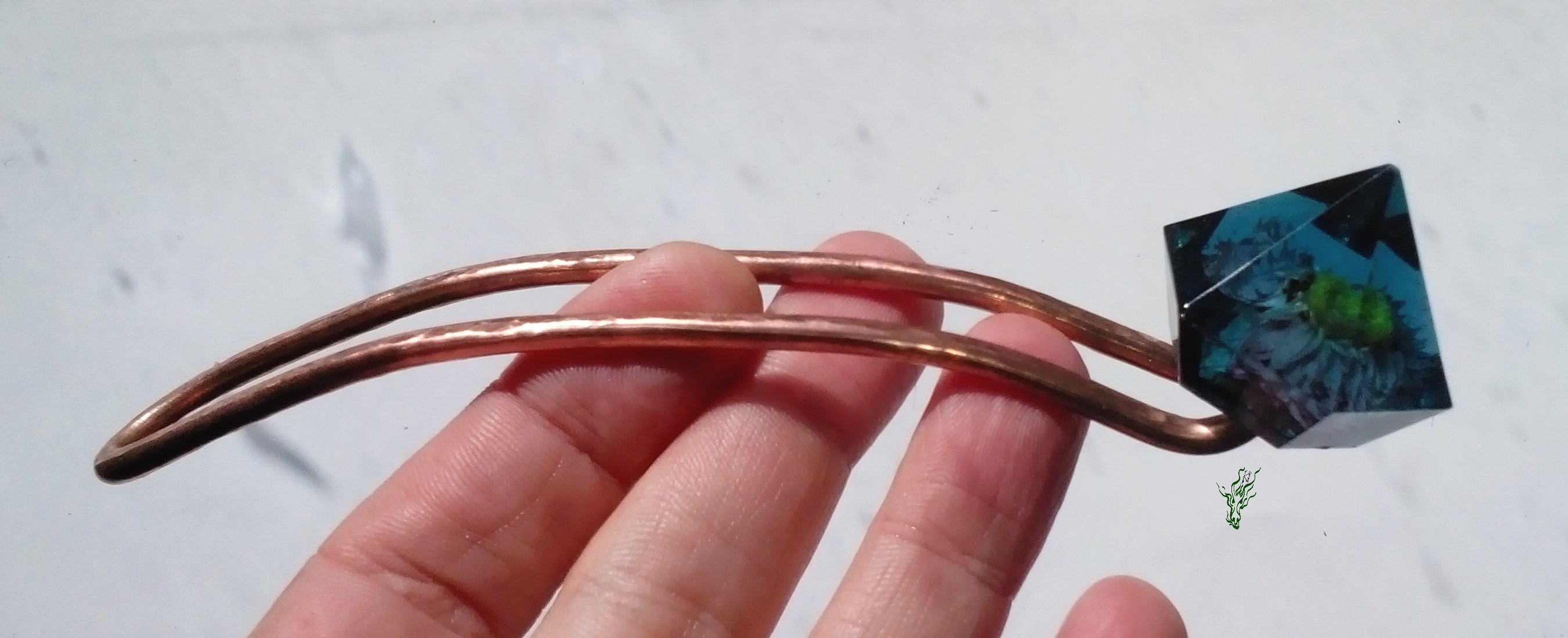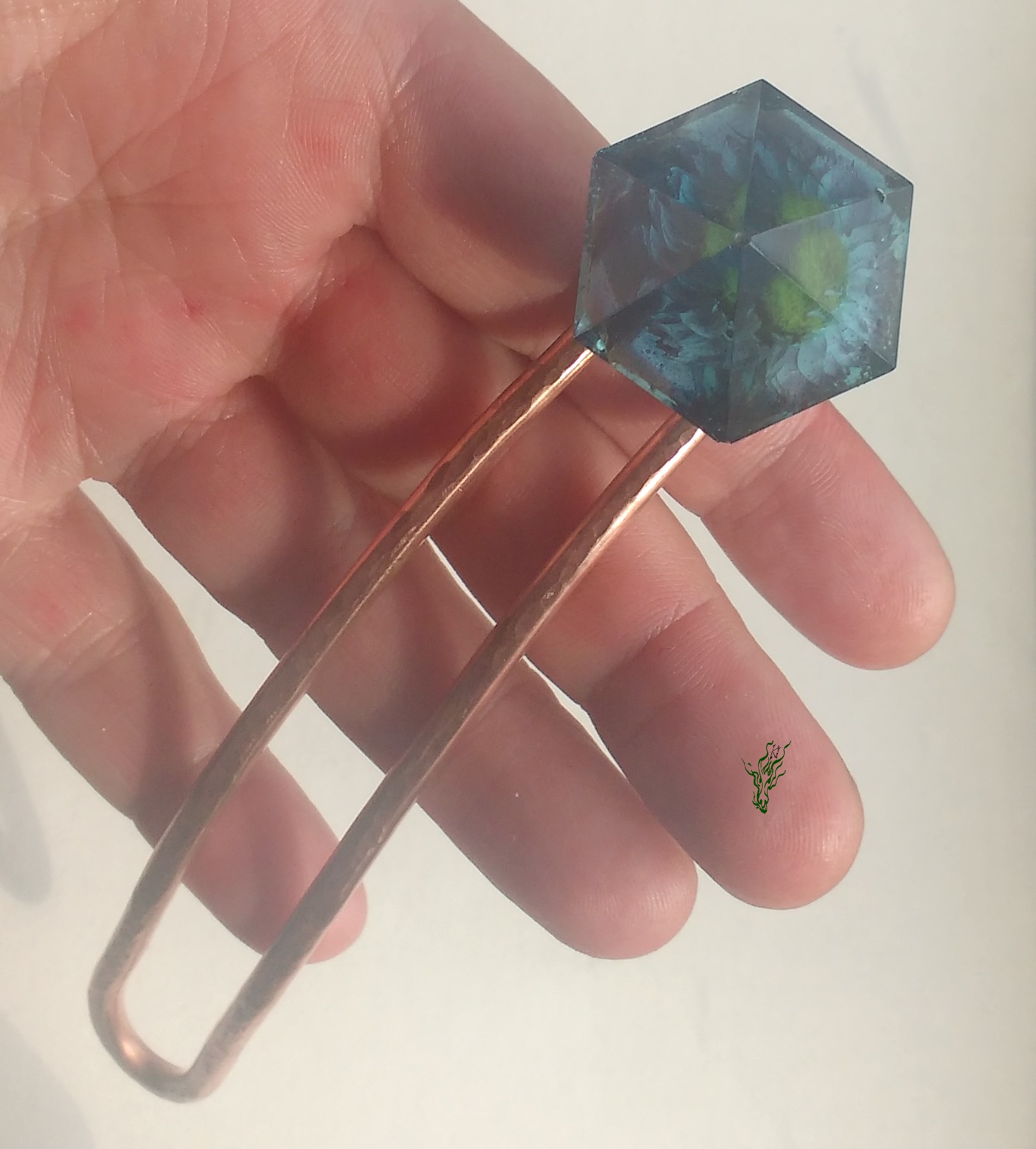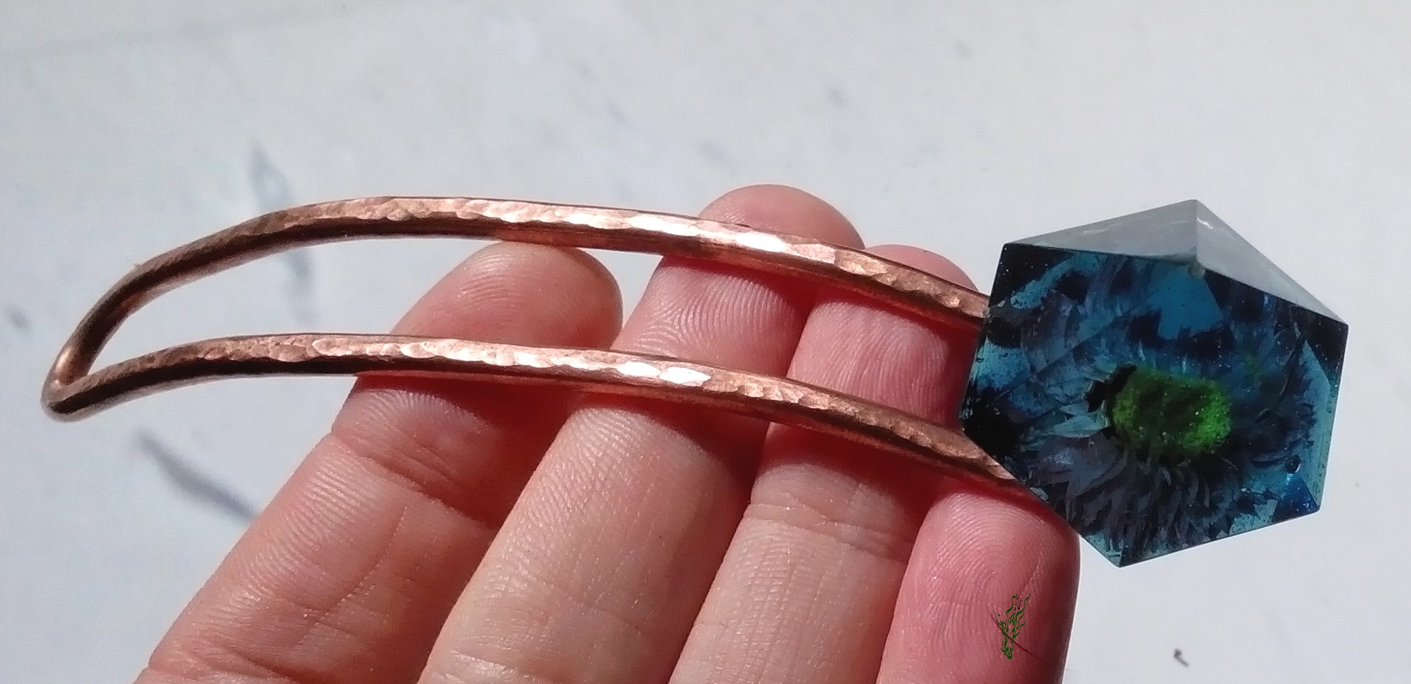 Breiter Gletscherstab , diesmal aus gehämmertem Kupfer & damit wasserfest. Ein Tausendschönchen wurde für die Ewigkeit konserviert, in einer rauchblauen Kuppel in Diamantform.