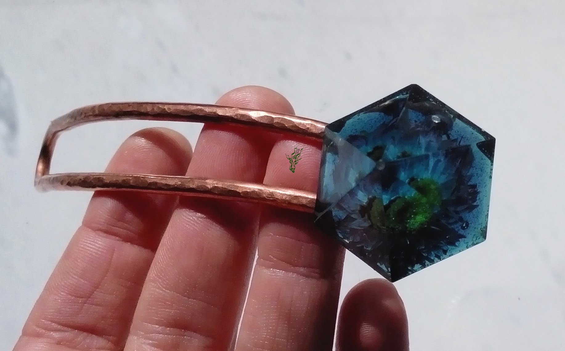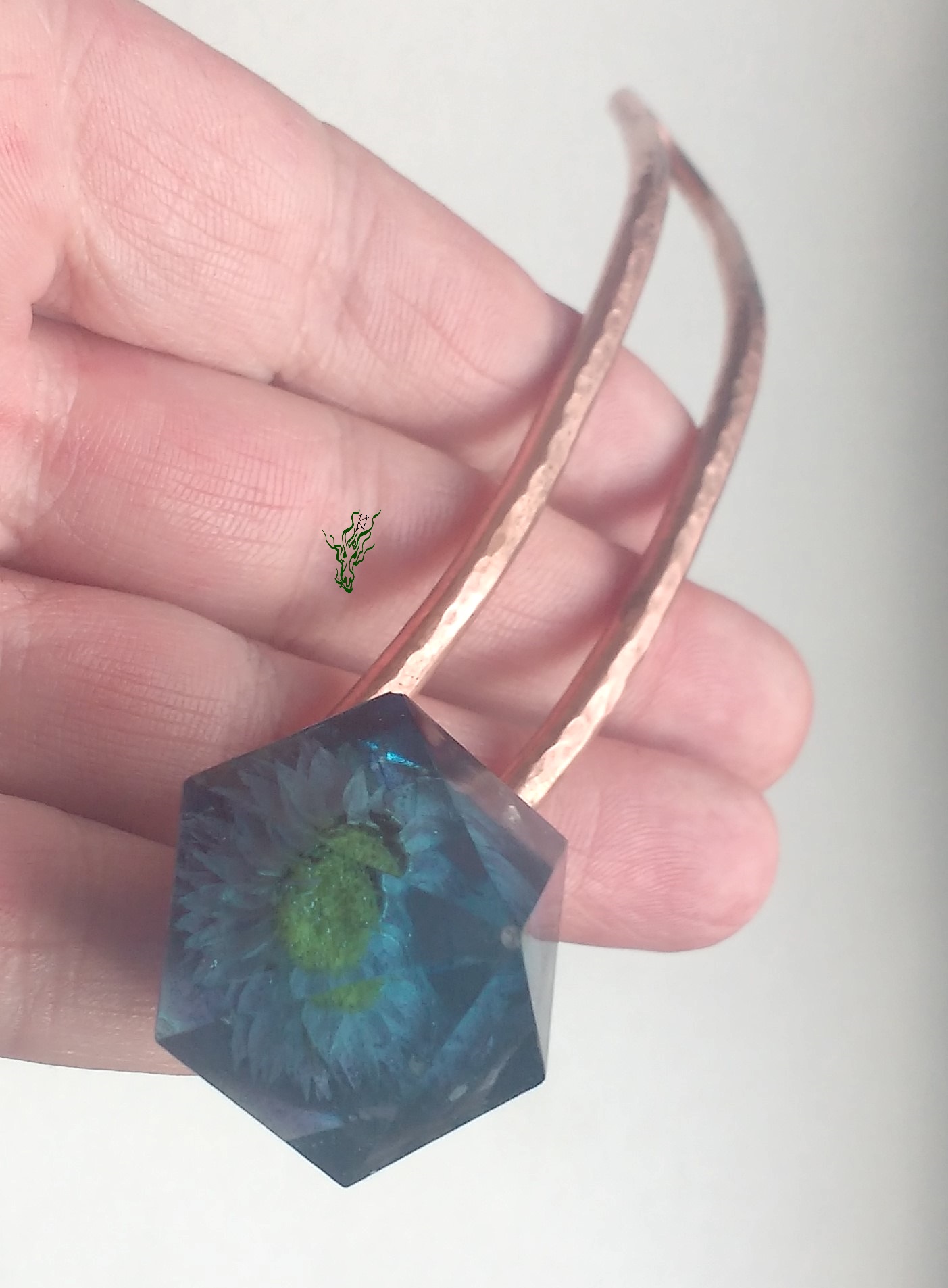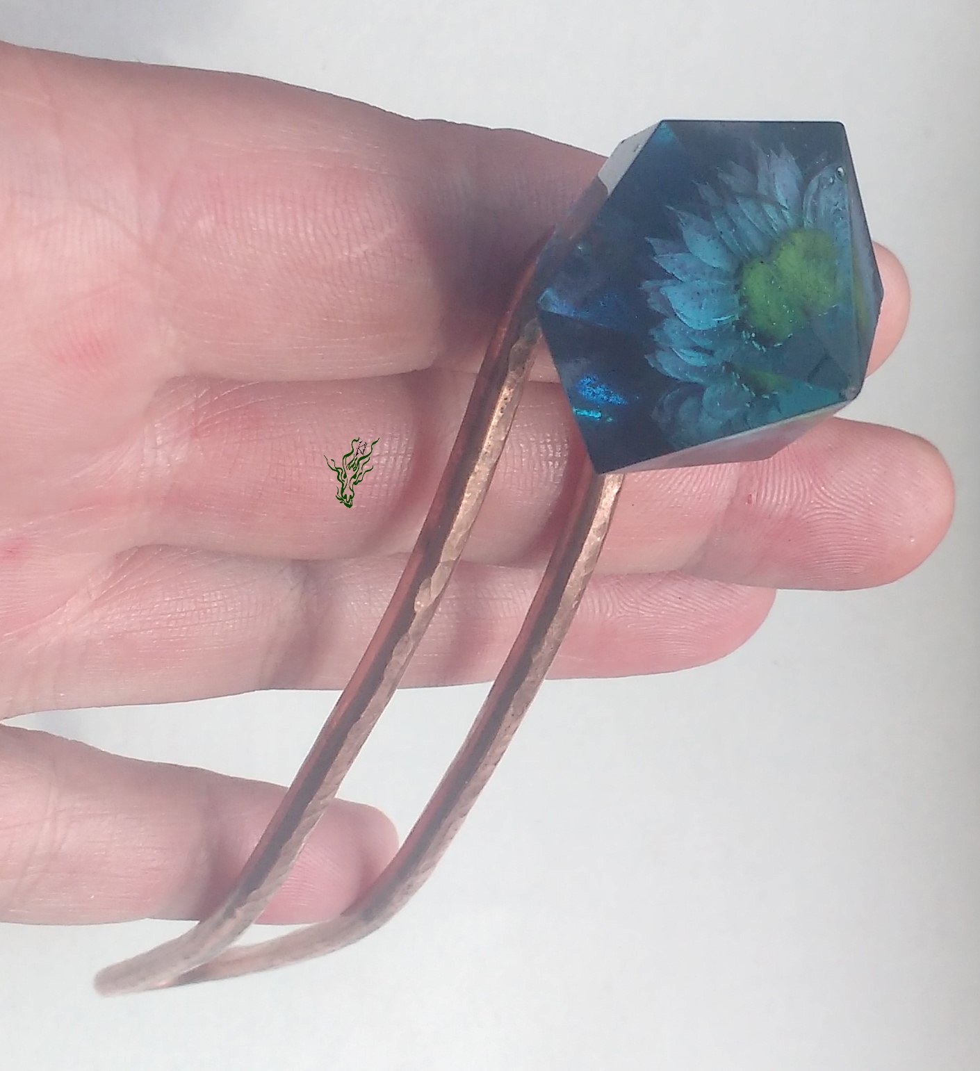 Breiter Gletscherstab , diesmal aus gehämmertem Kupfer & damit wasserfest. Ein Tausendschönchen wurde für die Ewigkeit konserviert, in einer rauchblauen Kuppel in Diamantform.