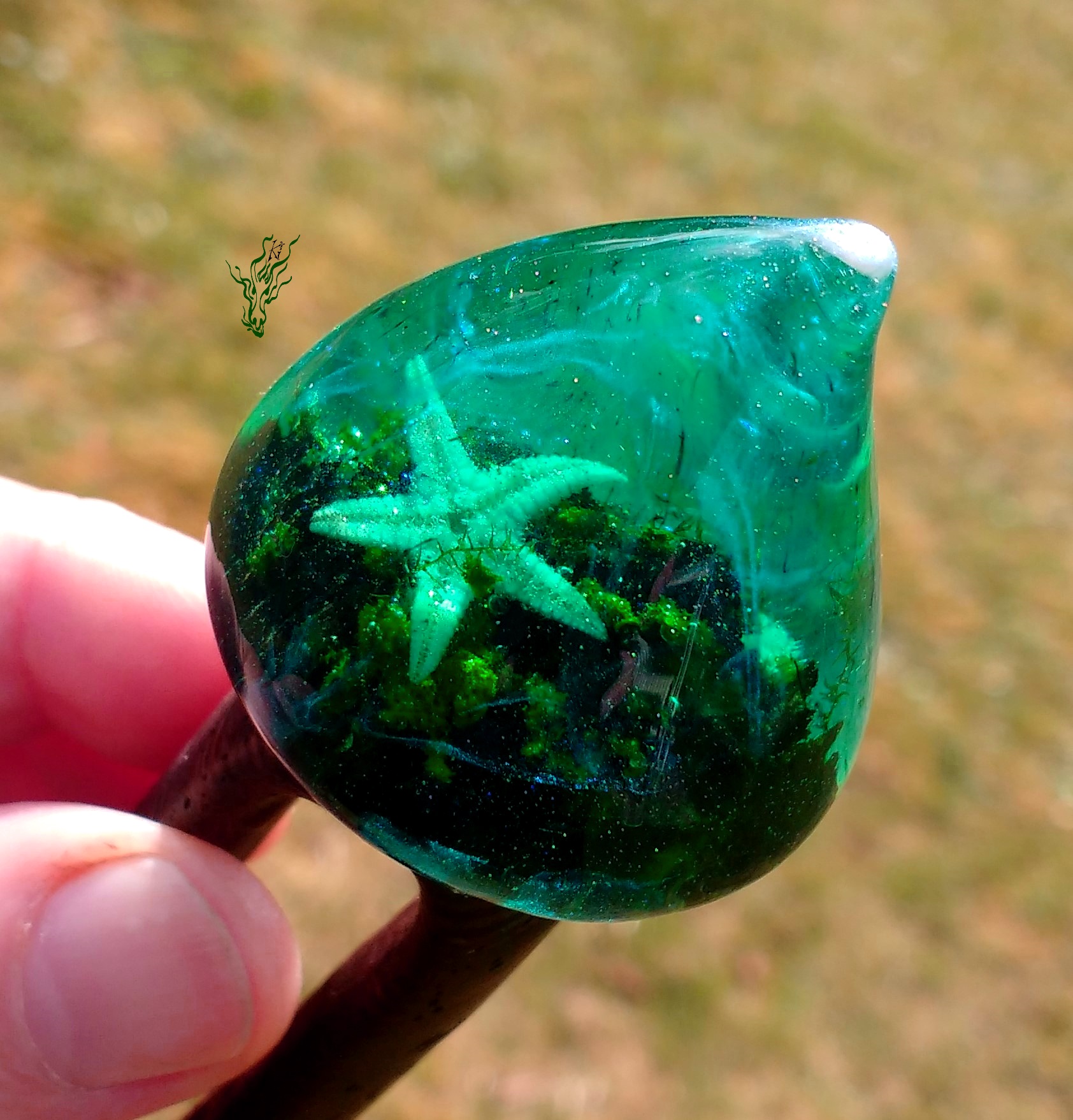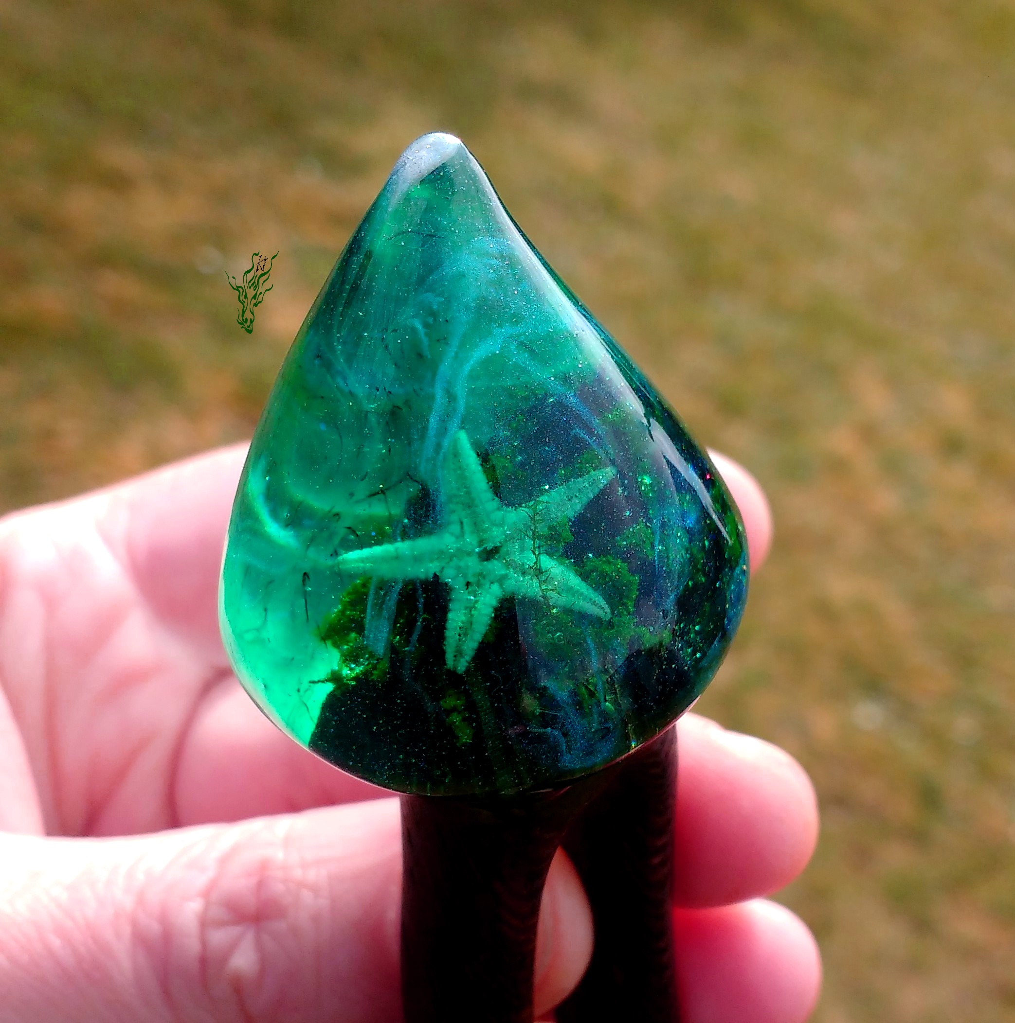 Seestern trifft auf Algen, Glitzerwolken auf Wasserschnecke und entstanden ist eine kleine Welt, in der du versinken kannst. In einer hochglänzenden Kuppel, die auf aufregendem, seidenzarten Wenge-Holz wohnt. Kühles Grün changiert zu Türkis.