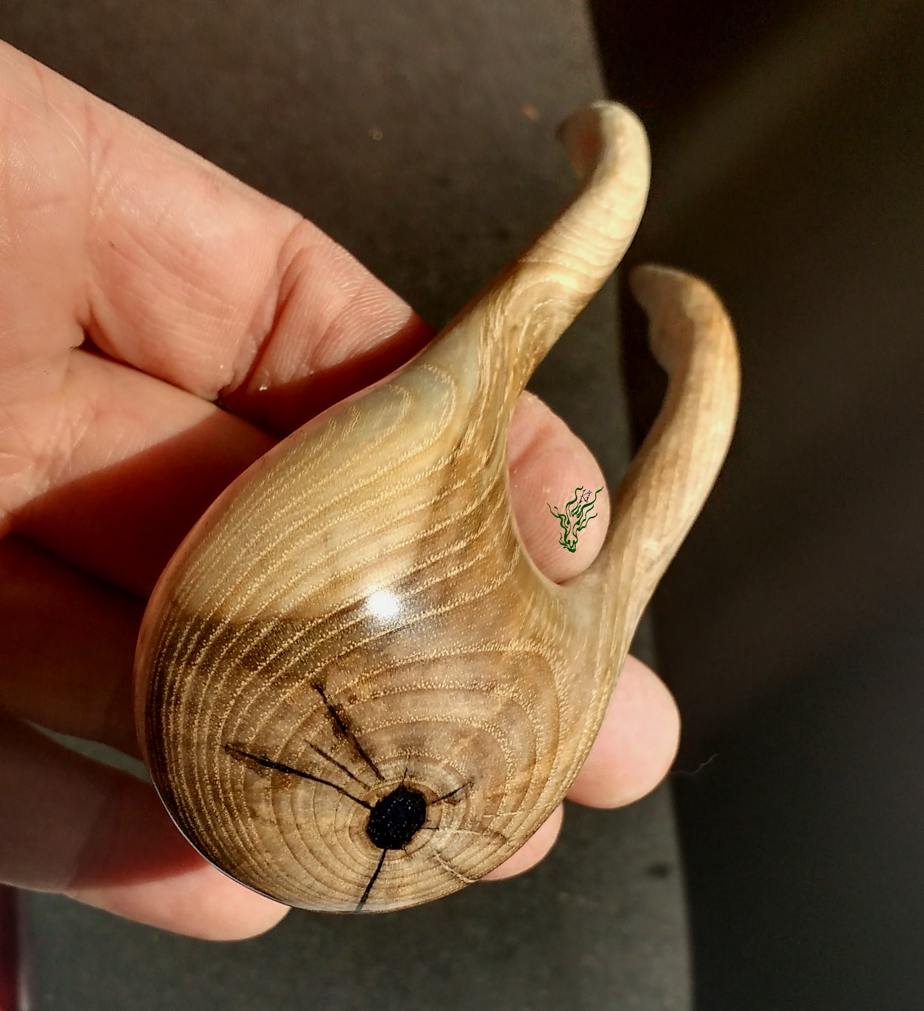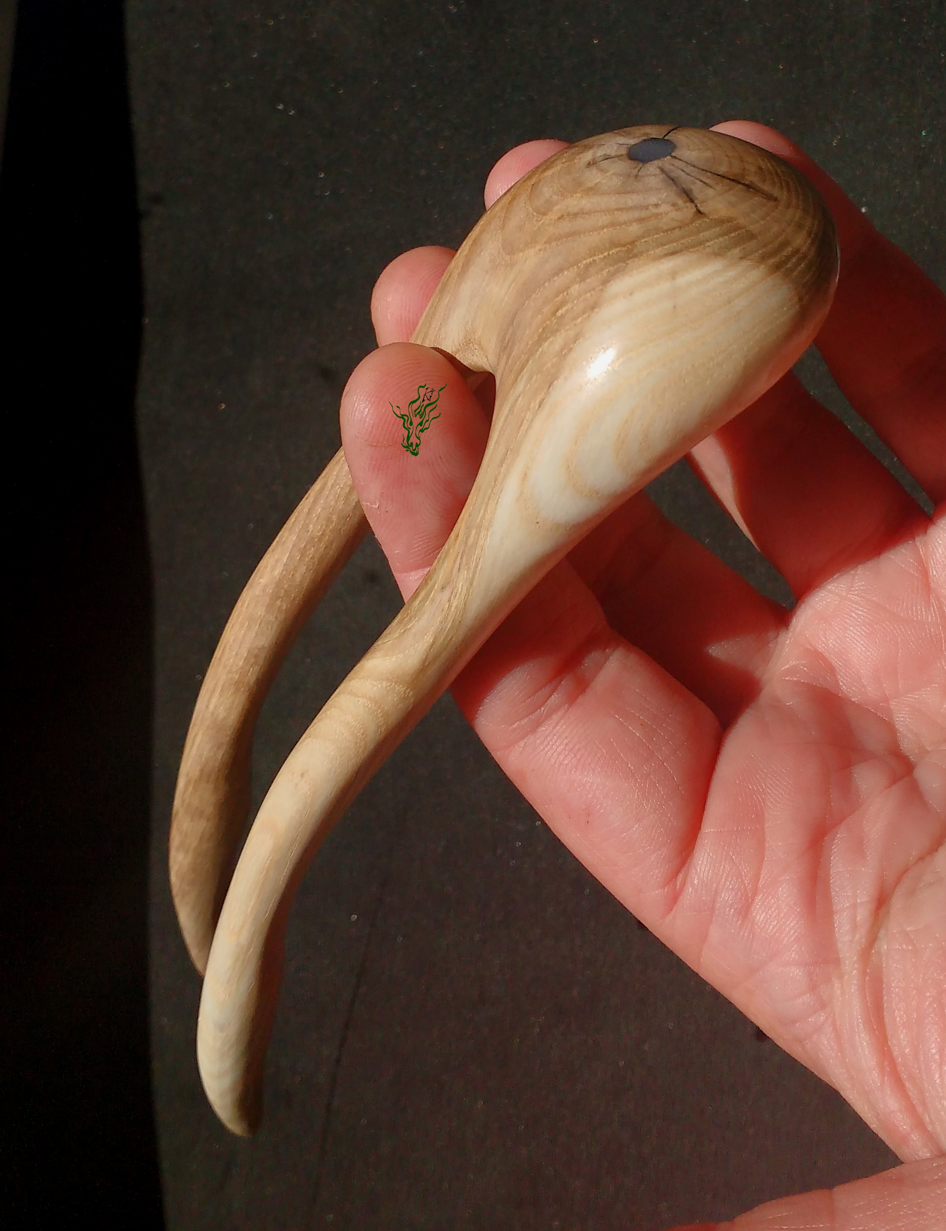 Typische Situation. Diesmal entdeckt der irre Holzblick vom Jadedrachen einen Ast, und ich weiß genau, dass es Esche ist. Und vor allem ist sofort zu erkennen, dass es sich um die seltene Ausprägung OlivEsche handelt, also OlivenHolz- ähnliche Maserung und dunkle Oliv- Farbe im Kern. Darauf freue ich mich schon seit 2 Jahren. Natürlich ist es nicht so einfach, eine Haarforke aus einem Ast zu schnitzen wie aus einem industriell gefertigten Brett zu sägen. Schicht für Schicht lege ich die Forke im Kern frei. Jede Schicht eröffnet neue Farben & Muster. Jippie, mein Herzchen klopft. Und ein verästeltes Loch habe ich mit dunkelblauem Epoxid aufgefüllt, einfach weils schön aussieht 🙂 Feinschliff & Polieren & der Jadedrache erfreut sich am Glanz. So liebe ich es!