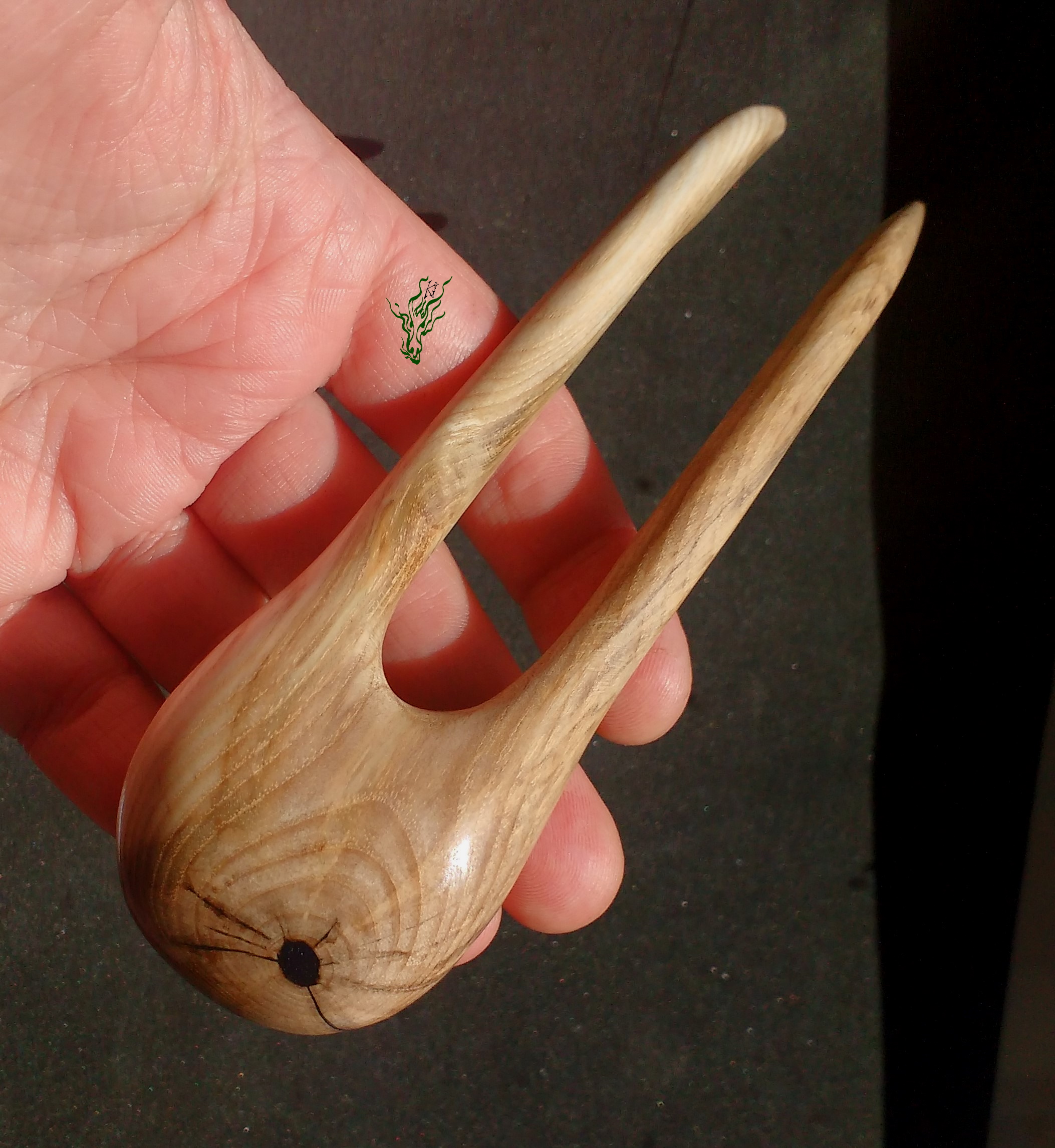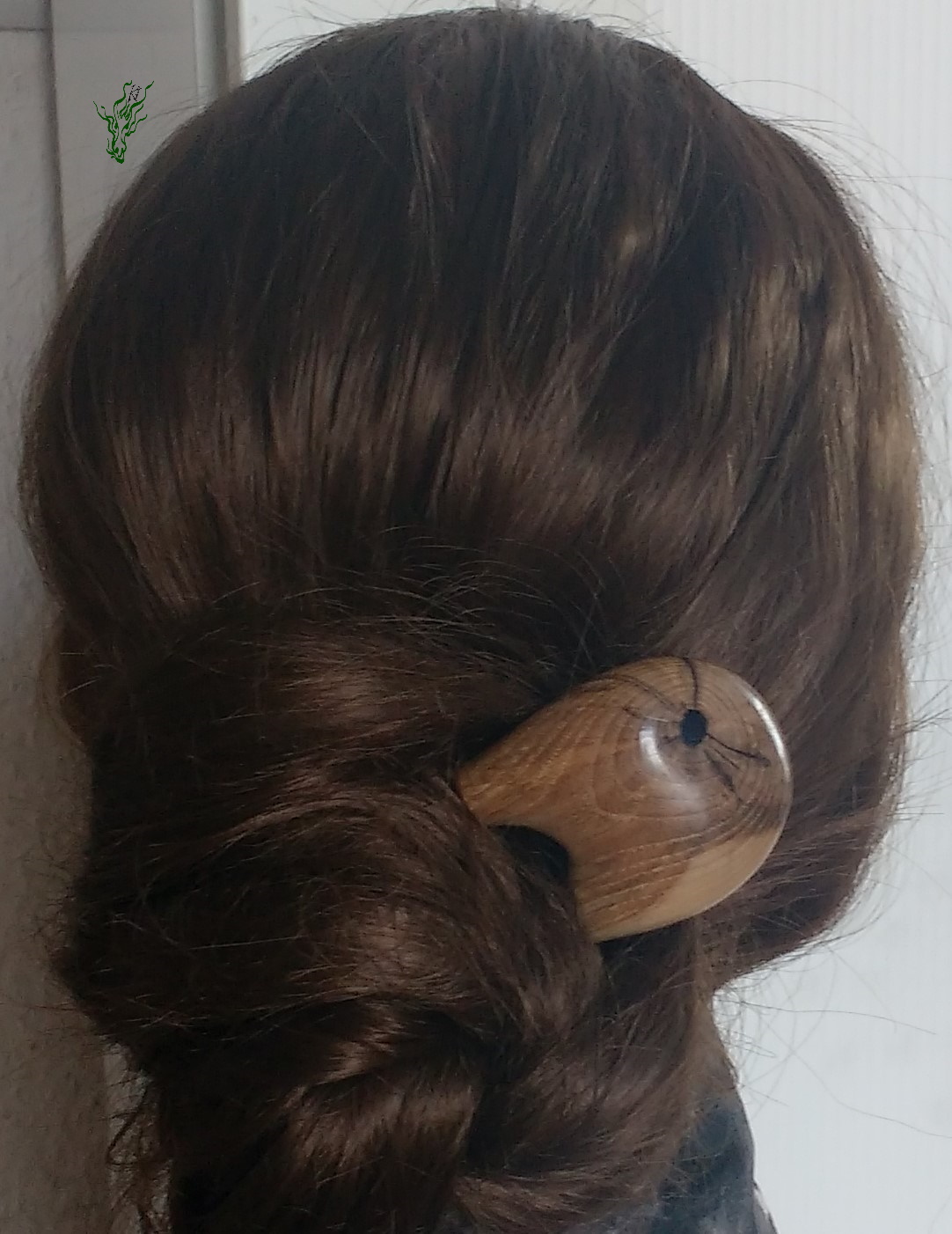 Schlichte Haarforke aus OlivEsche. Hier hat die Natur Vollkommenheit erschaffen. Die Forke folgt der Holzmaserung, als würdest du in einen Ast hinein gucken. Nur schöner. Und sanfter geschwungen. Und glänzender poliert ^^. Hier macht der Cut die Kunst aus.