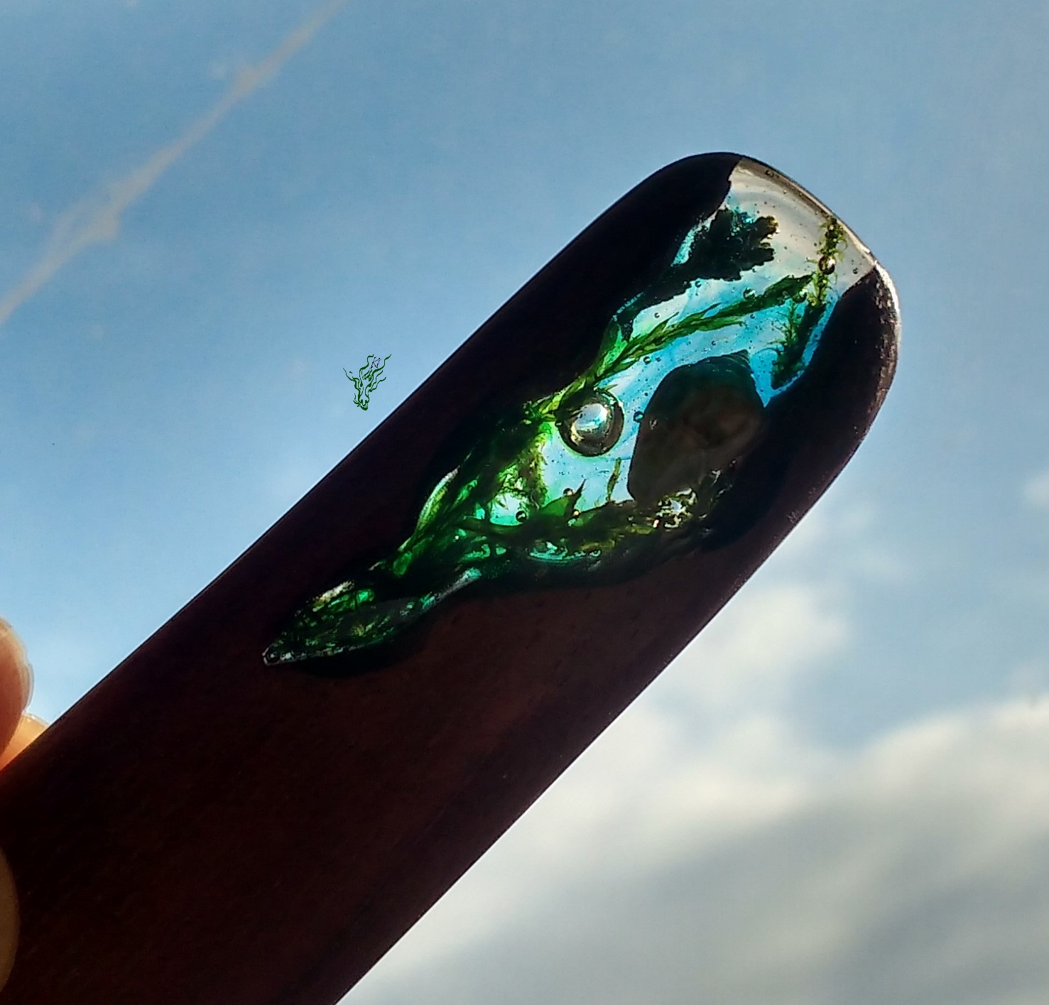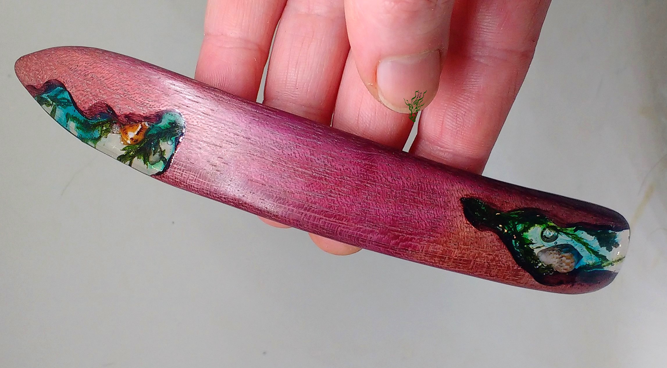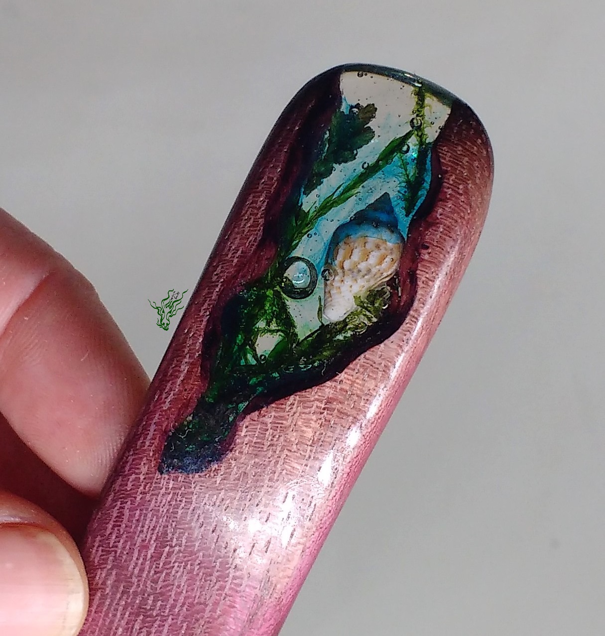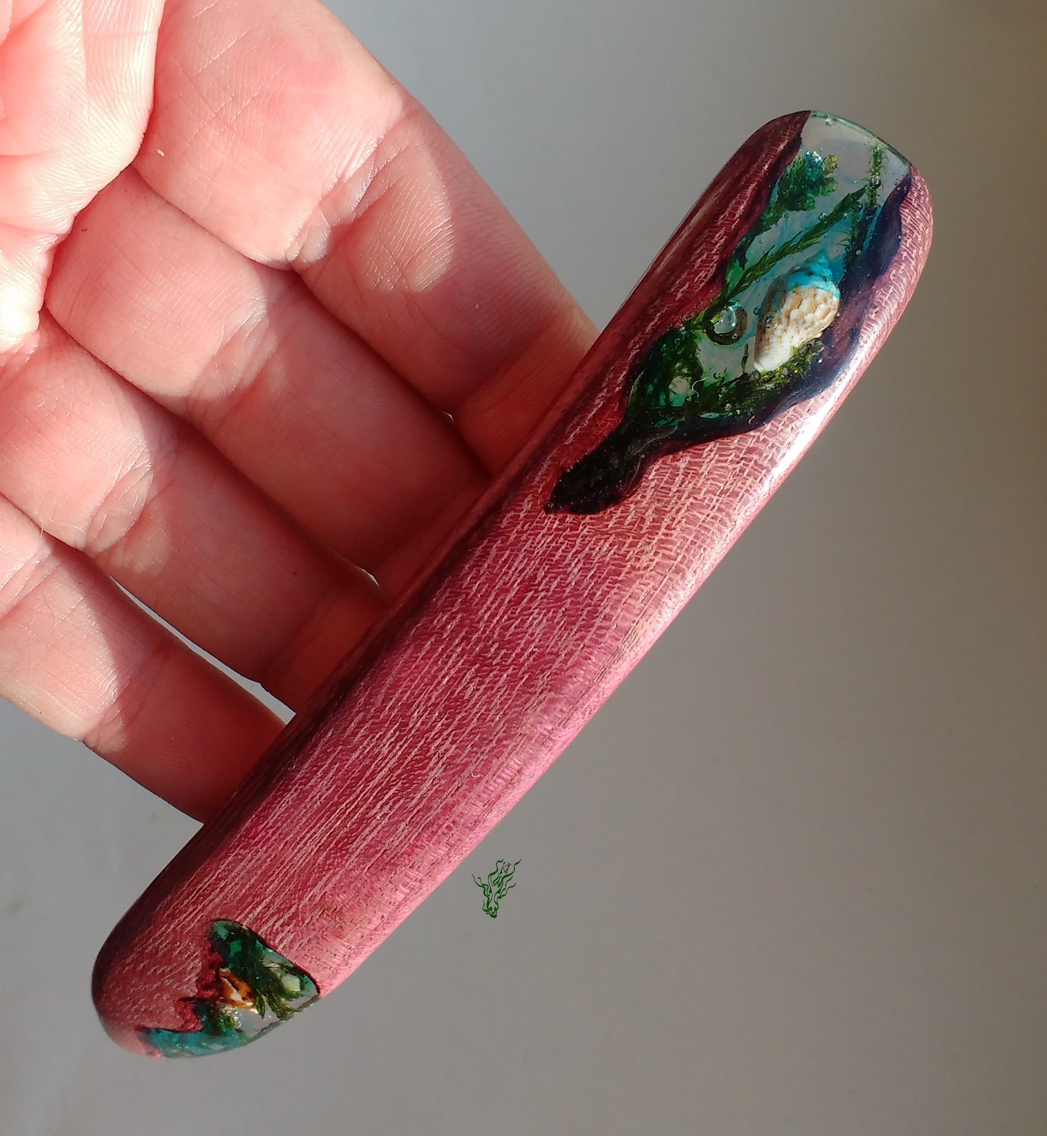 Breiter Gletscherstab , so bequem aus wunderbar lila Amaranth Holz. Mit eingebauten Ozeanen, Muscheln & Algen.