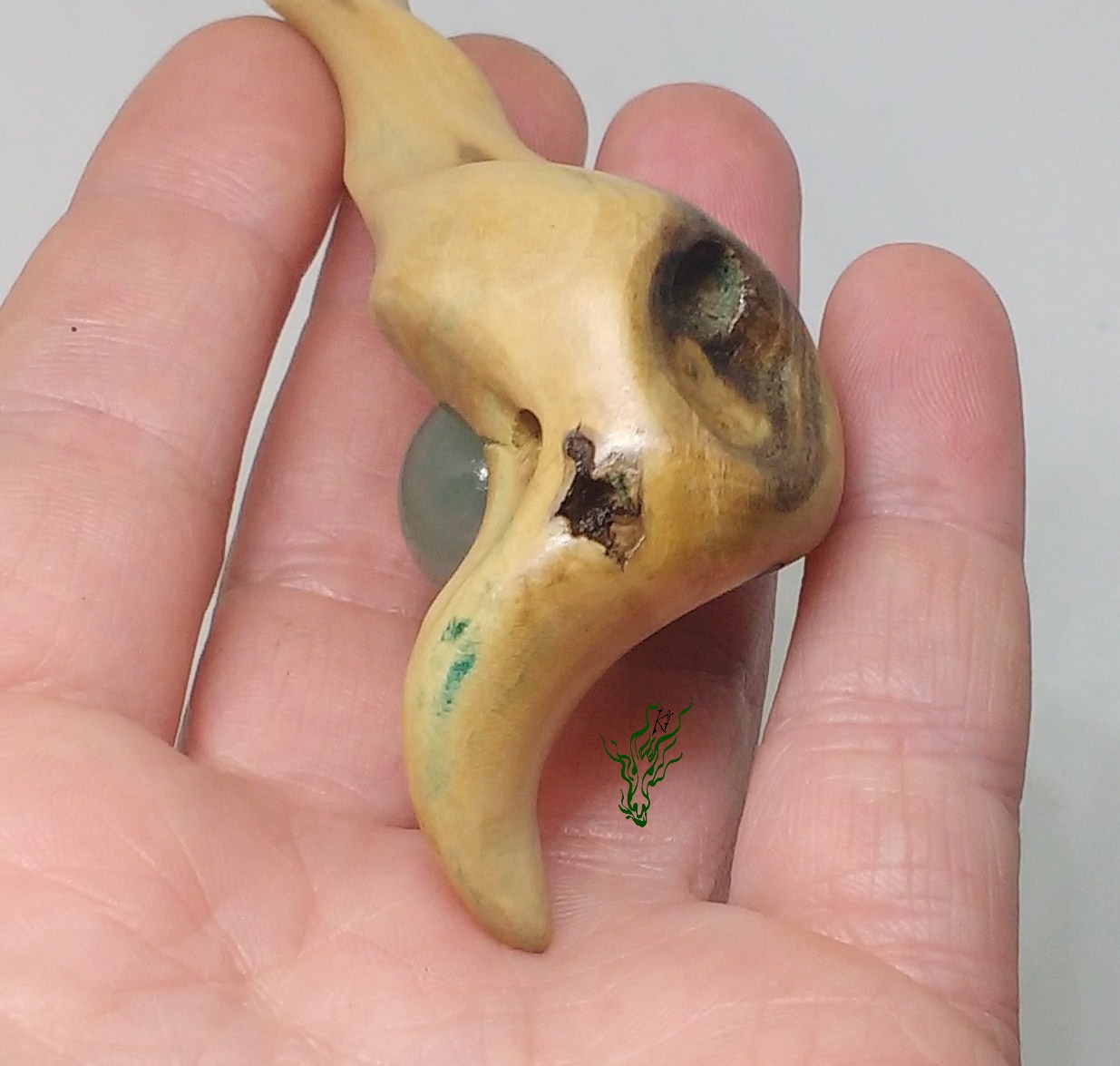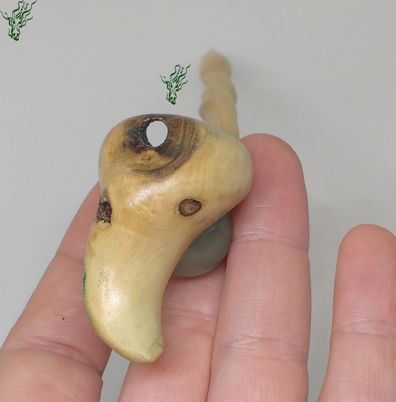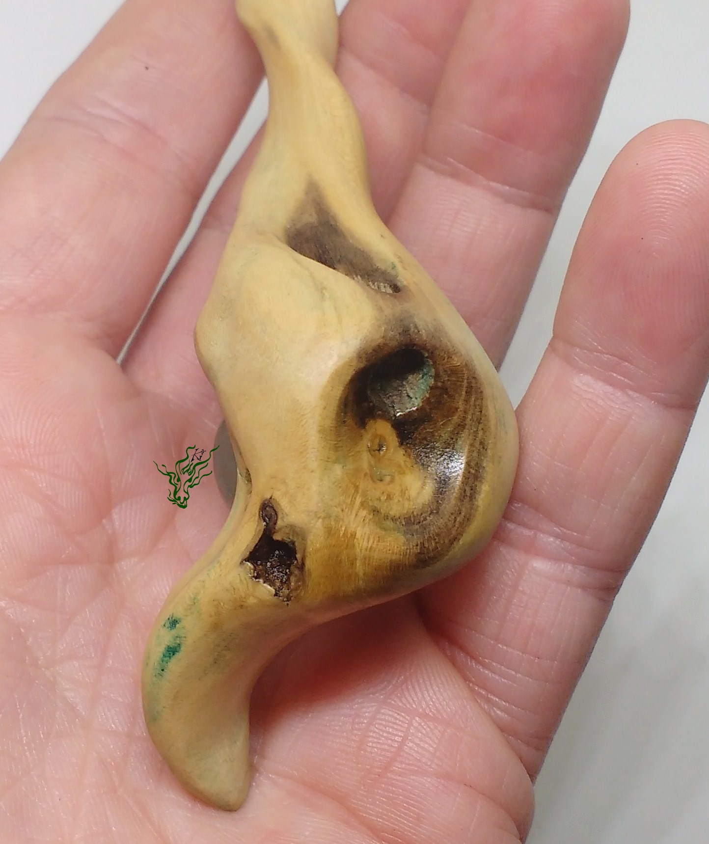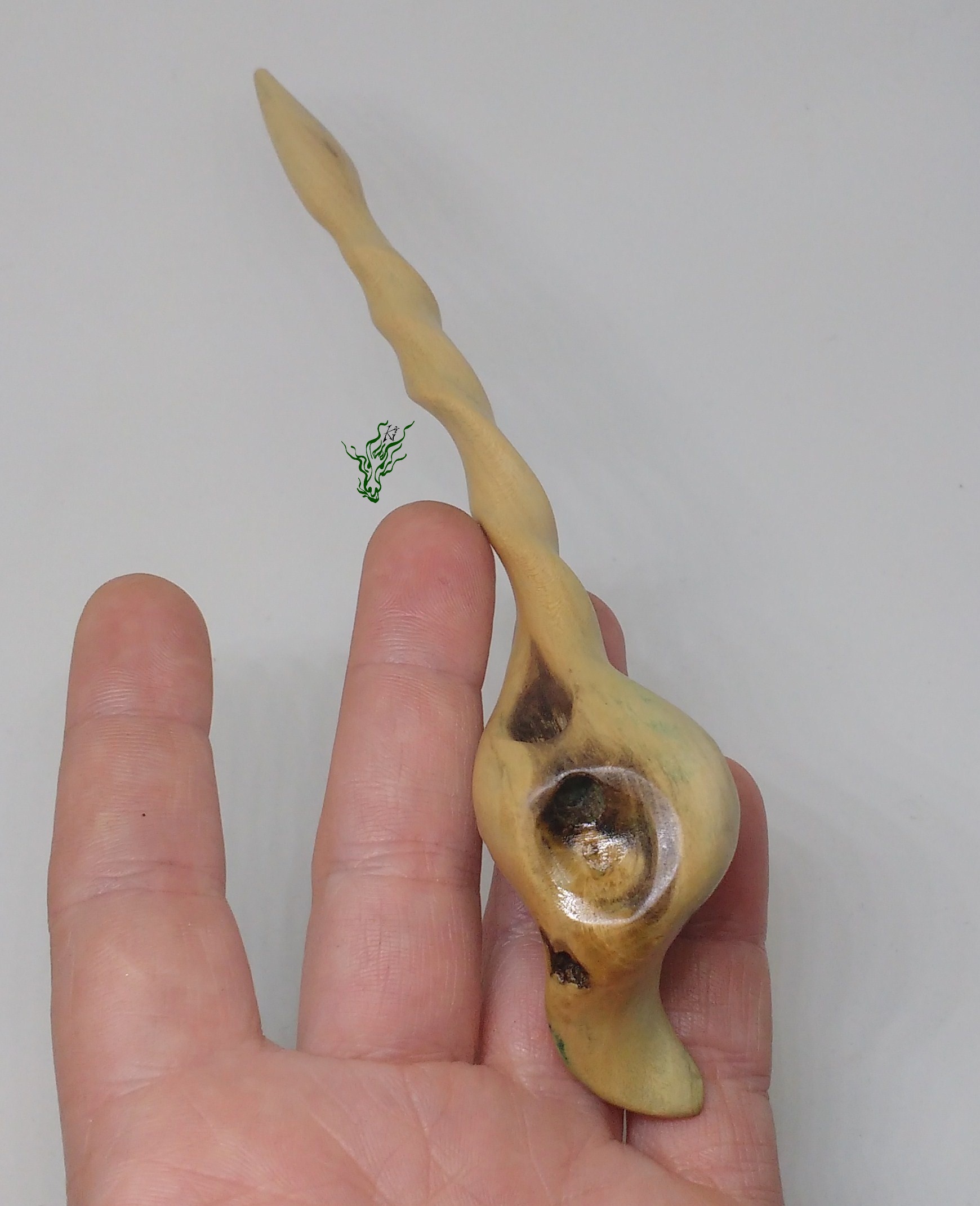 Ich ließ mich von ihm führen, zu der nach oben weisenden Blattform wie auch der Spirale des Lebens. Ich habe authenitsche druidische Zauberformeln gemurmelt beim Schnitzen, mir die Kraft der Natur verinnerlicht. In ihm stecken alle meine guten Gedanken, Wünsche & Hoffnungen.