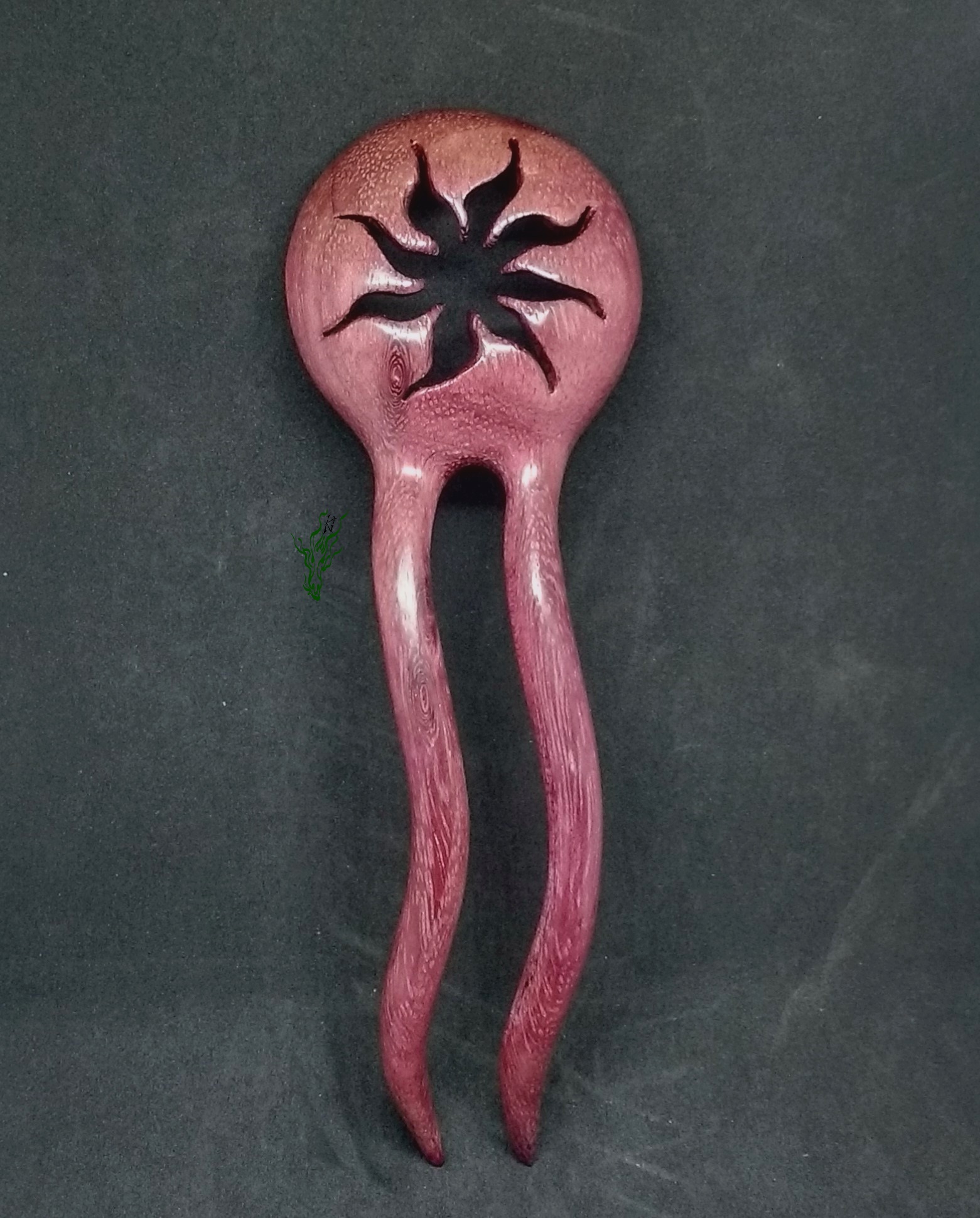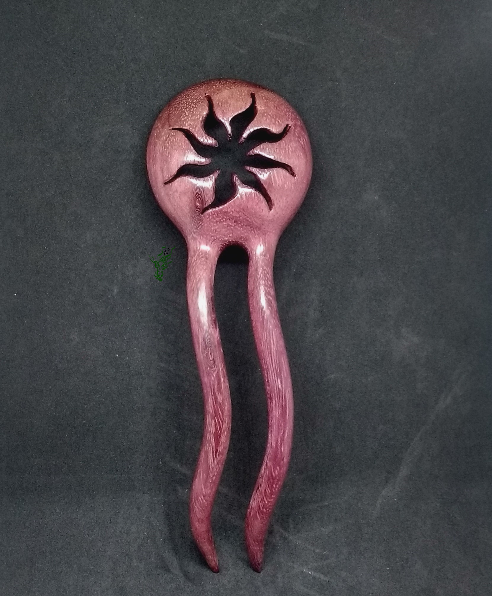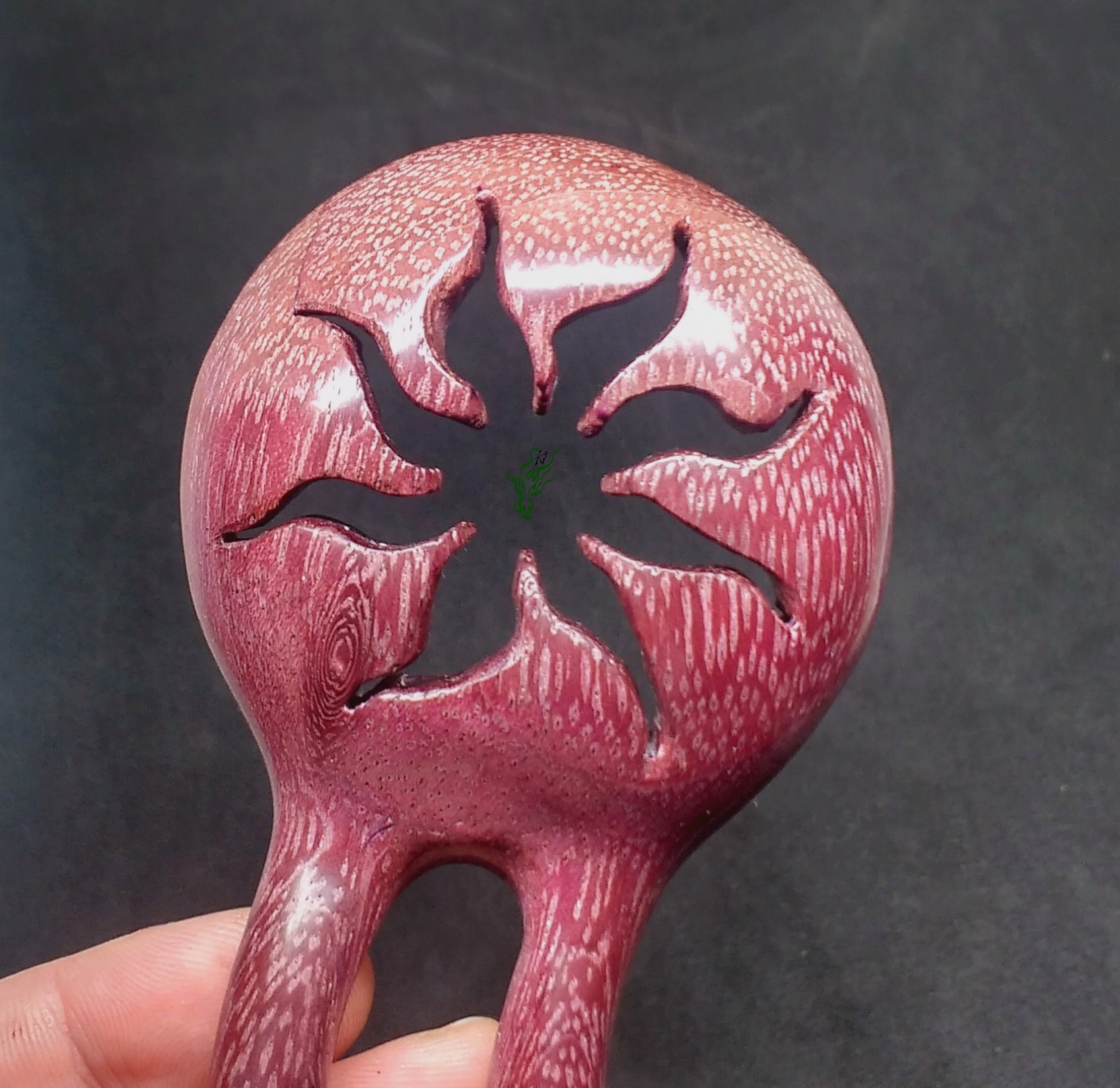 Und am Ende dann die Belohnung: Feinschliff & Polieren auf Hochglanz. Sie war endlich fertig, sie war wunderschön, ich war verliebt… Und dann ließ ich sie fallen 🙁 Und weil dieses Holz so spröde & hart ist: feiner Haarriss. Wenn ihr Rumpelstilzchen noch nie live gesehen habt, das wäre eure Chance gewesen. Ich heulte eine Stunde lang… Und dann, ja, raffte ich mich auf, stabilisierte den Riss, nochmals Schleifen & Polieren und zum Glück sieht man kaum was. Aber deshalb wird dieses Ausnahmestück (denn ganz sicher schnitze ich nie wieder irgendwas Filigranes aus Amaranth 😛 ) wohl der Glanzpunkt meiner Privatsammlung werden.