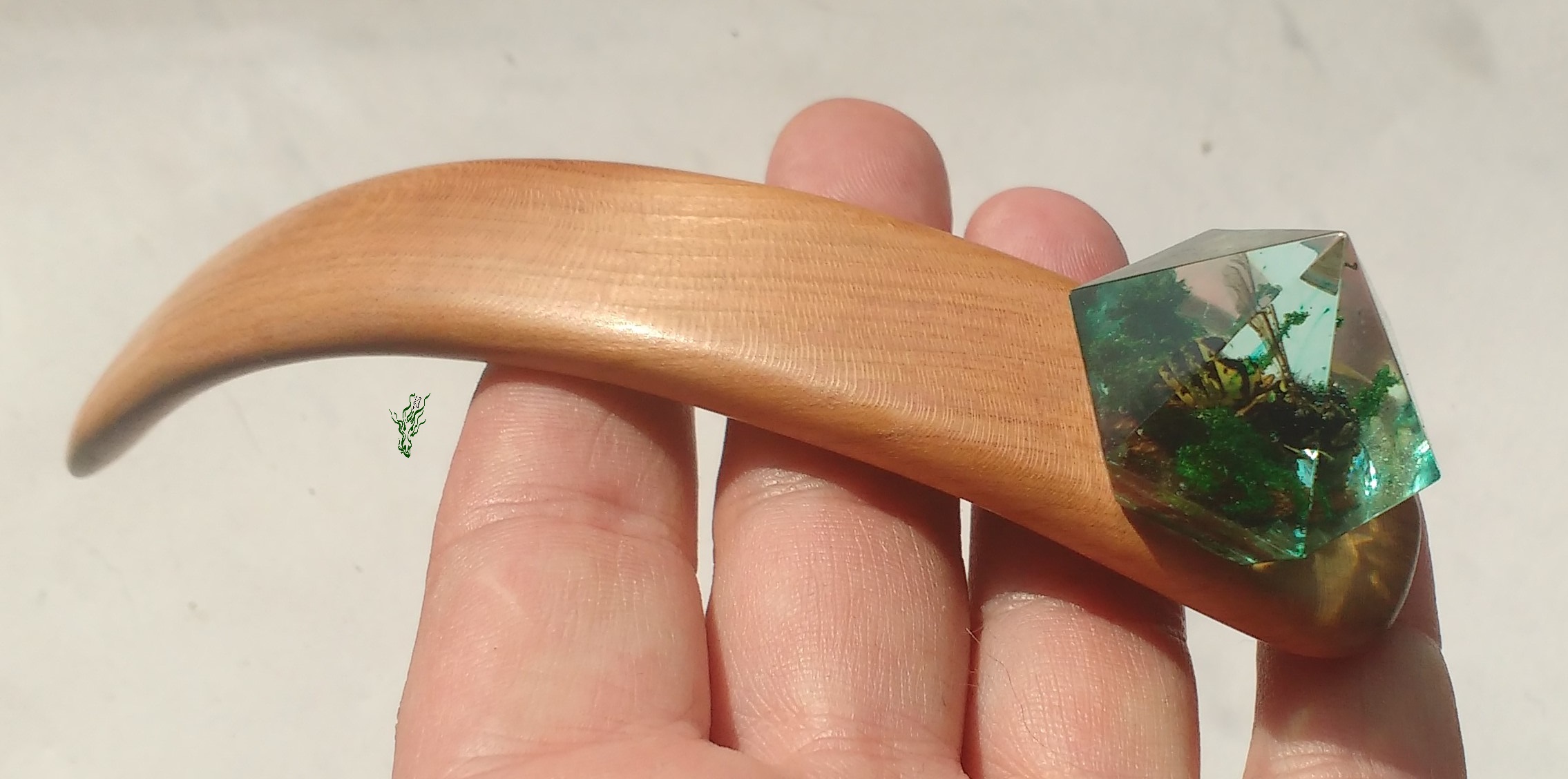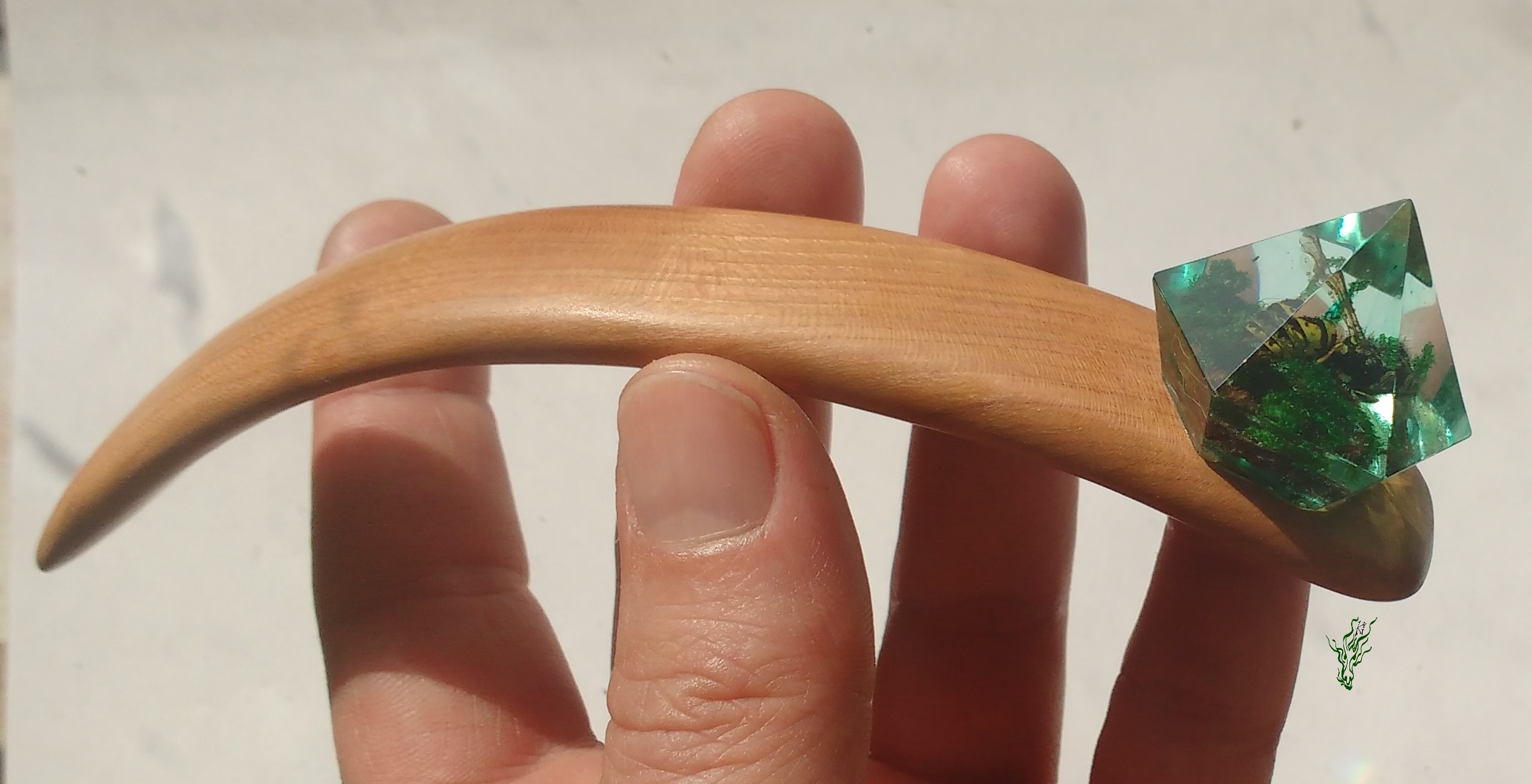 Breiter Gletscherstab , so bequem aus wunderbar gemasertem Pflaumenholz, mit Mustern zart wie Spitze. Eine Wespe, die ich natürlich tot gefunden habe, würde auf einem Bett aus Moos für die Ewigkeit konserviert, in einer grünen Kuppel in Diamantform.