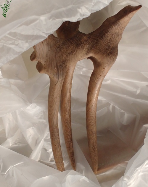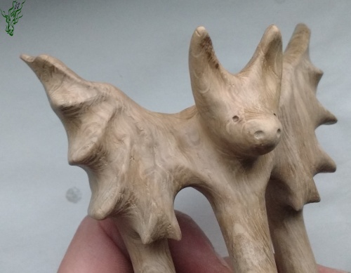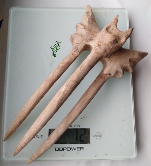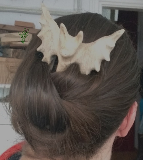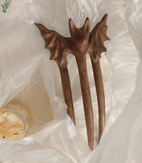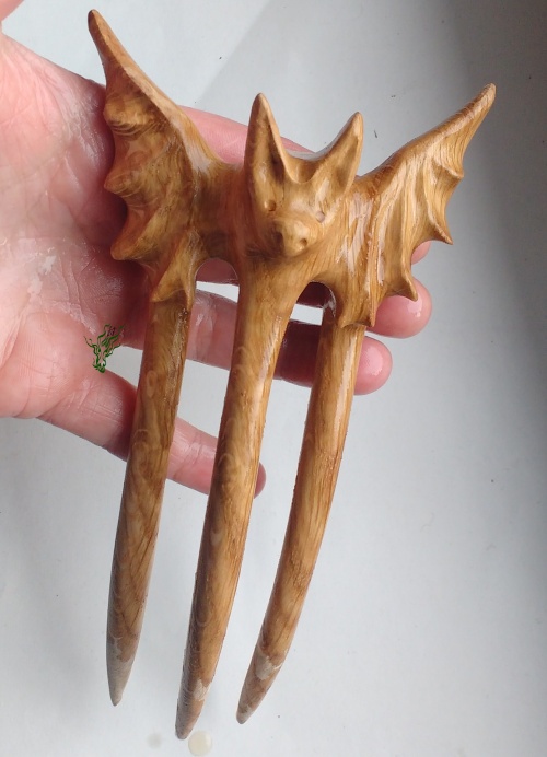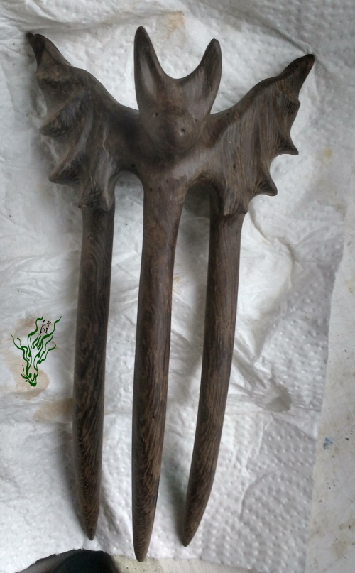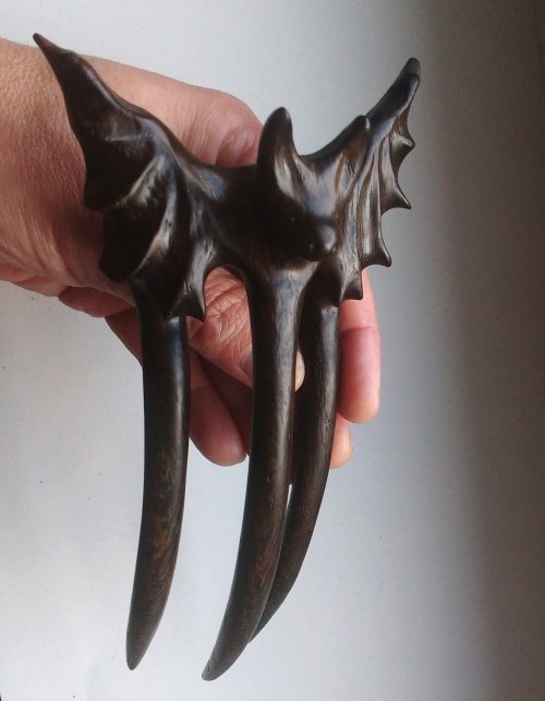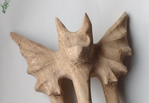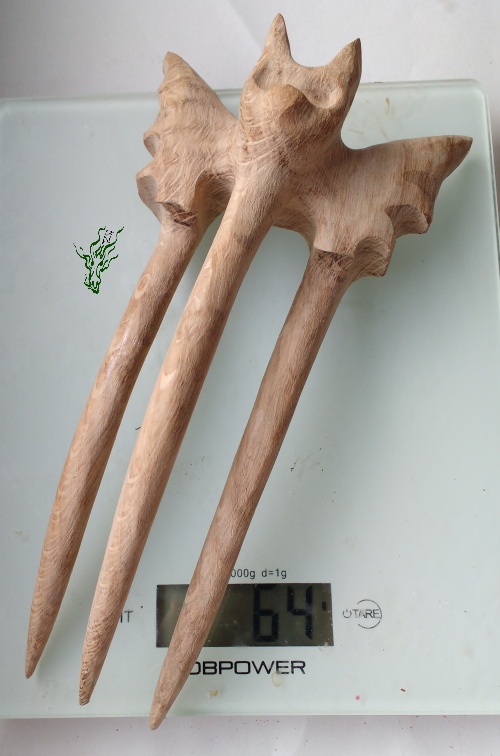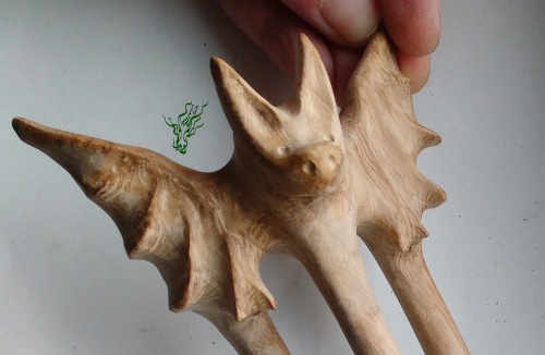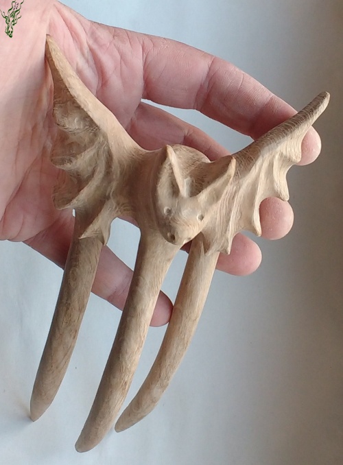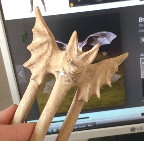 Nach 2 Tagen grobem Schnitzen und Feilen ist eine Fledermaus Haarforke zu erkennen.