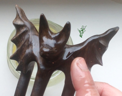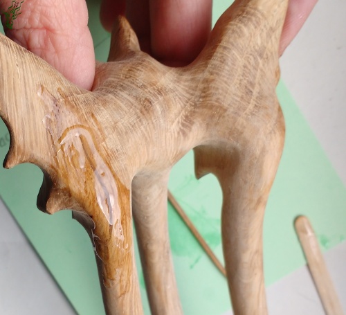 Fledermausi ist bis 400 Körnung sauber geschliffen, nun darf sie ein Bad nehmen, bei dem sich die Holzfasern aufstellen. Diese glätte ich wiederum mit 280 und 400er Körnung.
