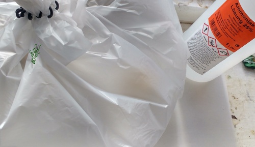 Aber stop- es heißt „dunkel“ – da fehlt noch ein wesentlicher Schritt. Dank des Gerbsäureanteils kann Eiche „geräuchert“ werden. Eine klassische Holzveredelungsmethode. Früher wurden Eichenholzmöbel dafür in den Pferdestall gestellt – ich habe keinen Platz für Pferde – zu viel Holz… Daher behelfe ich mir mit einem Räucherzelt, in das ich ein Schälchen Ammoniak stelle..