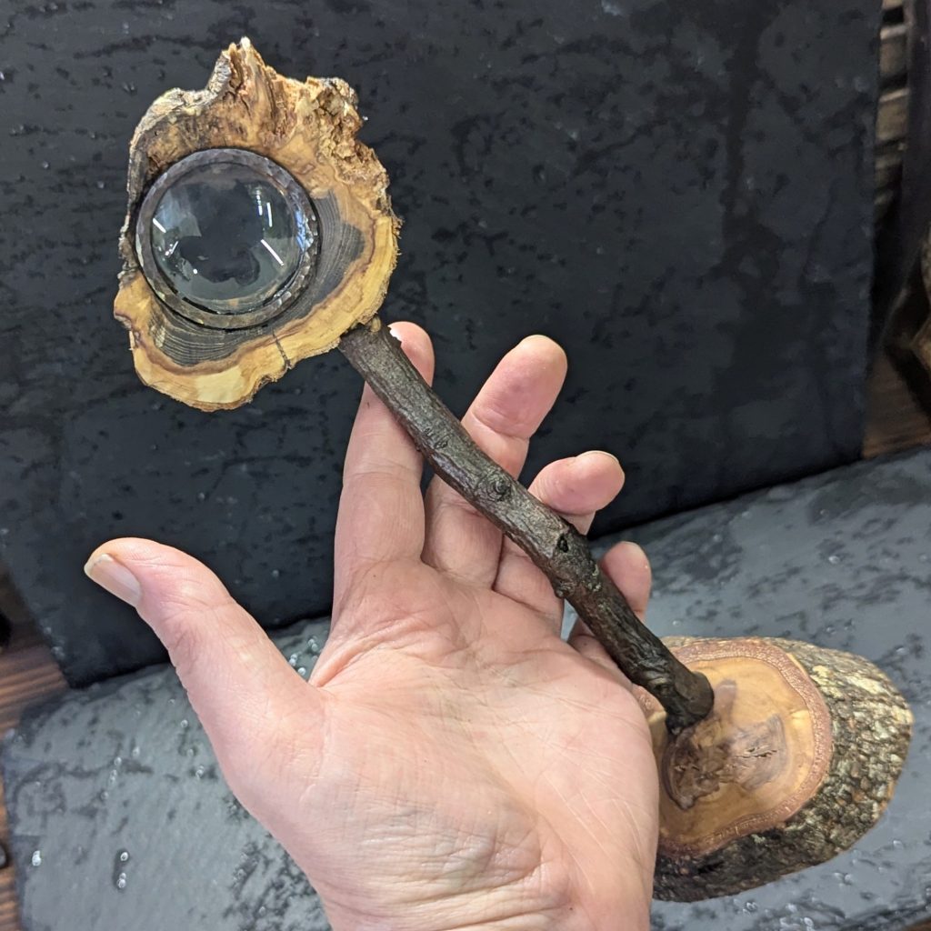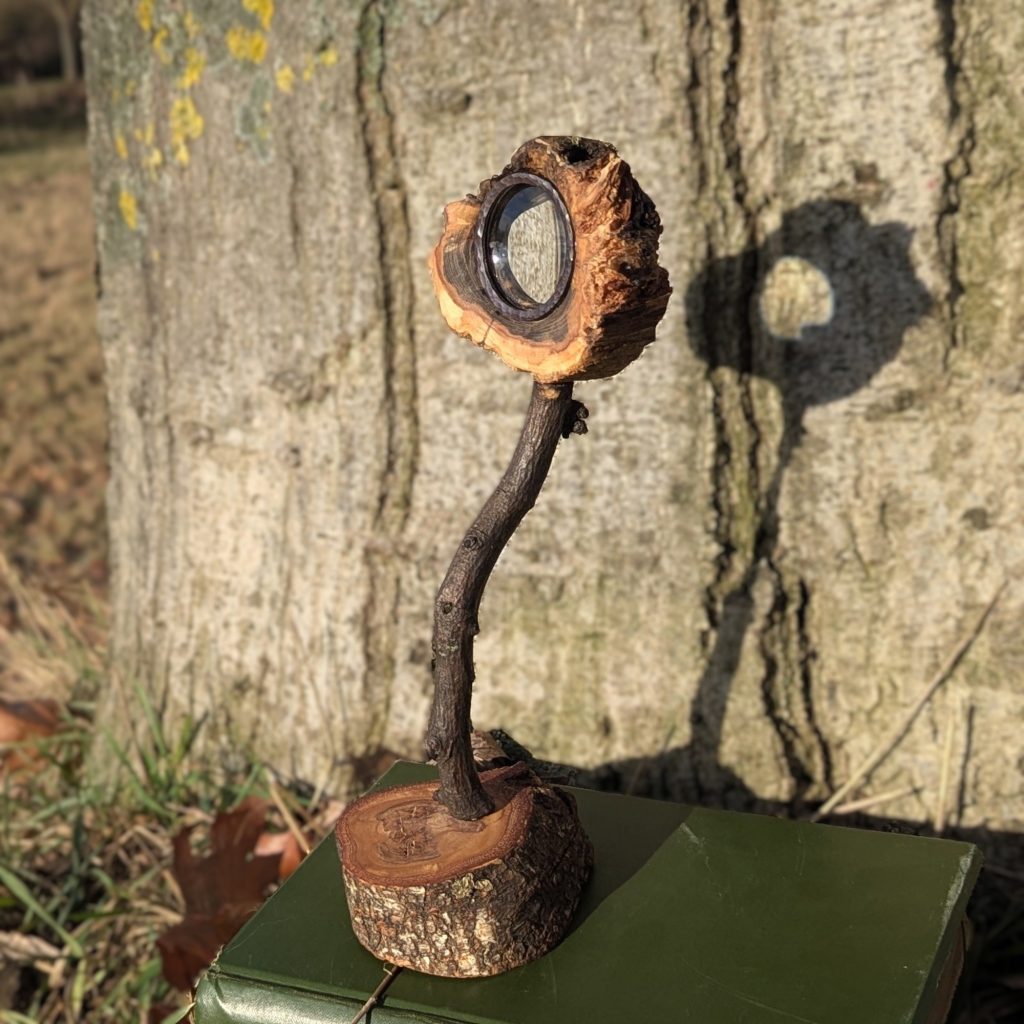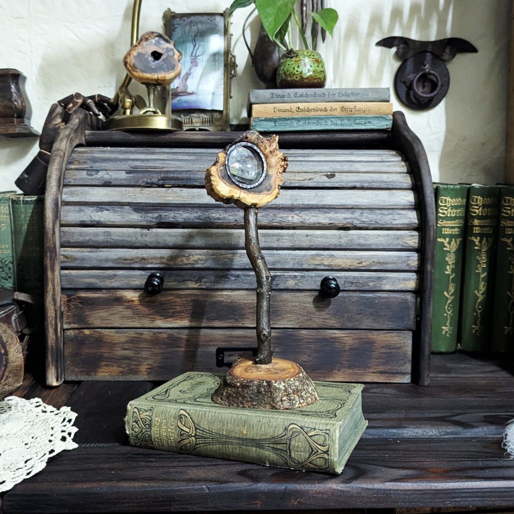 Dieses handgefertigte Objekt wirkt wie eine Vintage Lupe, ein Fenster in die verborgenen Details der Natur. In seiner Ästhetik schlägt es die Brücke zwischen einem staubigen Forschungslabor des 19. Jahrhunderts und dem erdigen, gemütlichen Heim eines Hobbits.