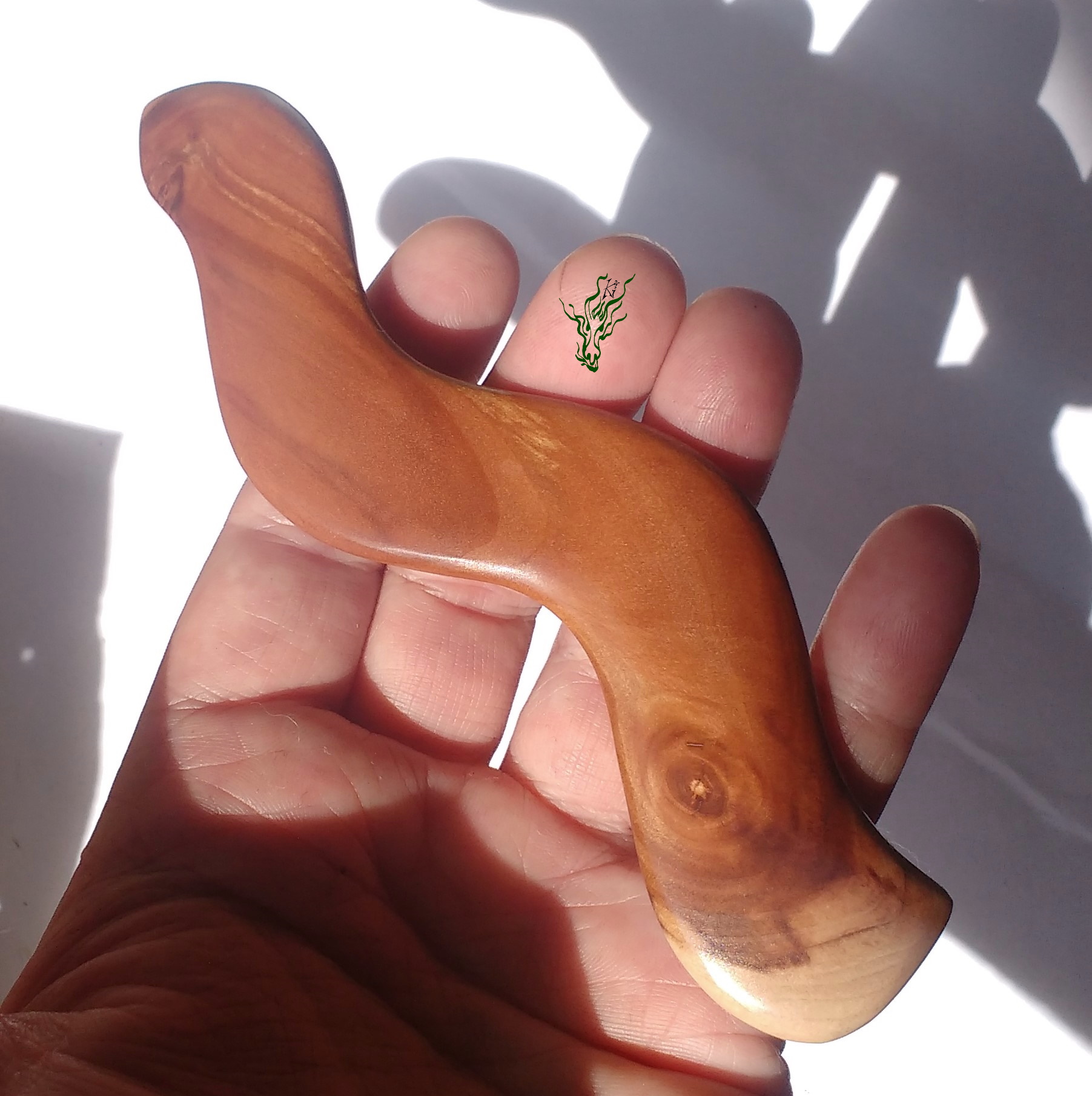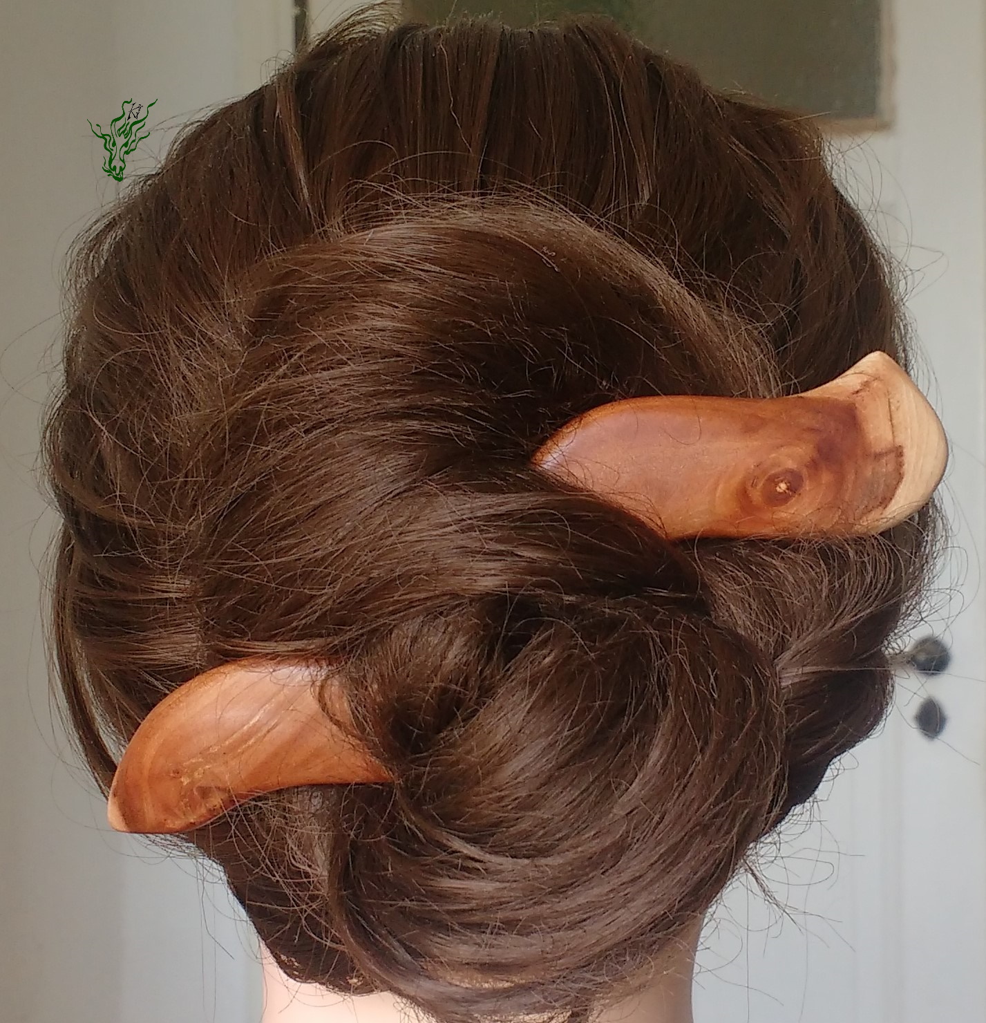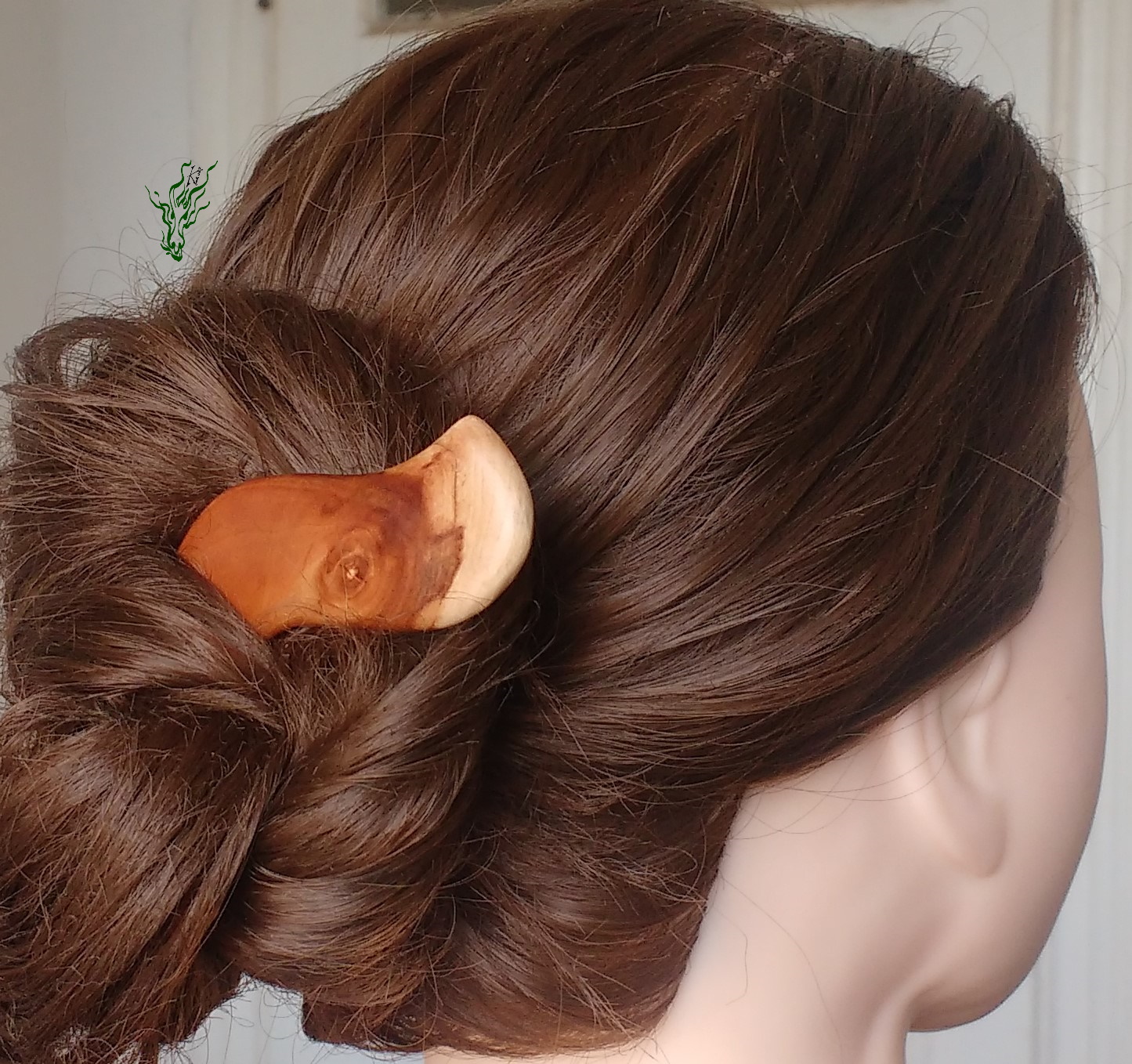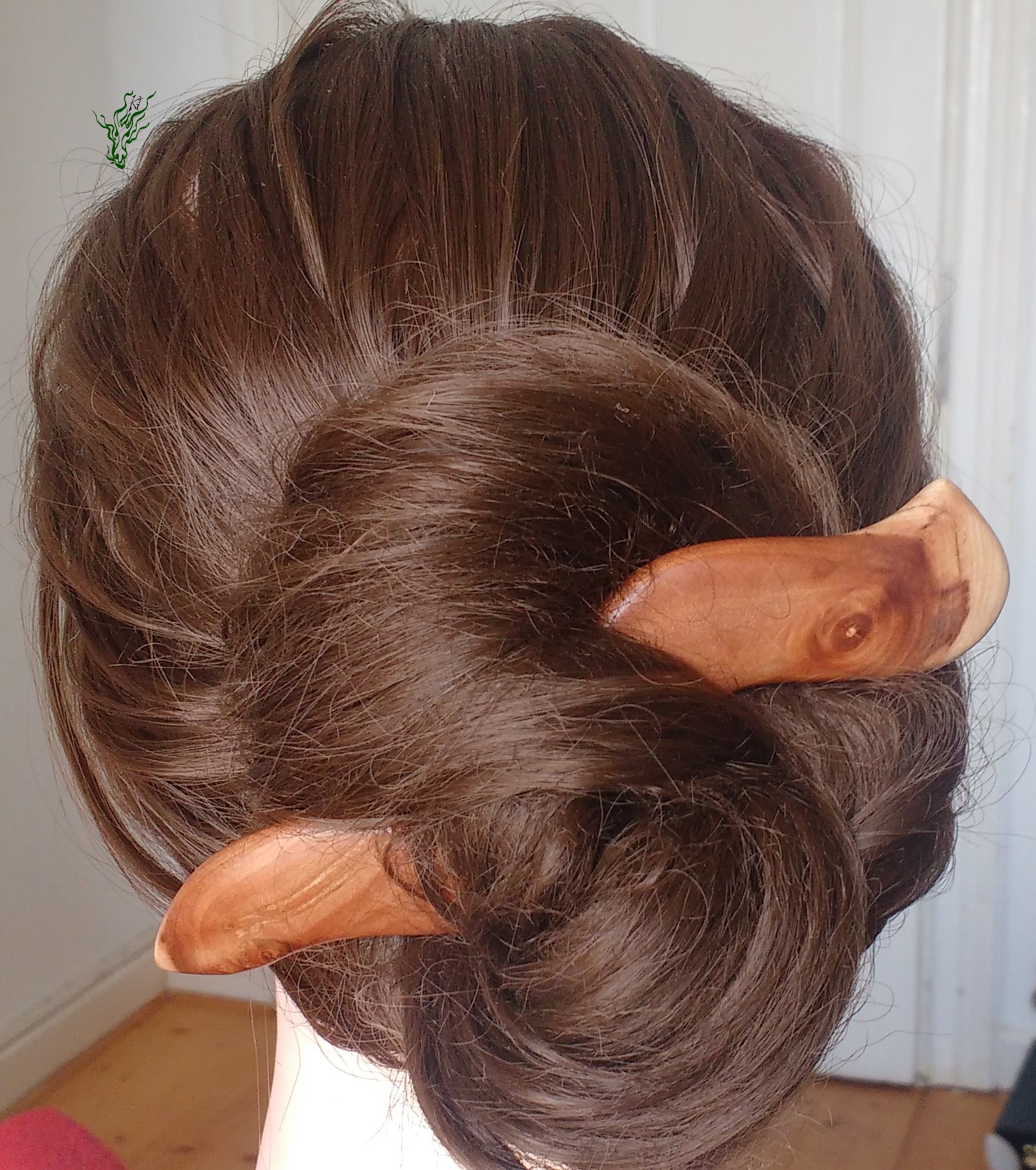 Ich wollte eine neue Optik & hab mal wieder rumexperimentiert, um einen Haarschmuck zu kreieren, der auch bei flutschigsten Haaren nicht raus rutscht. Entstanden ist ein eigenwillig aussehender Haarstab, der eine witzige optische Täuschung hervor ruft. Dieser breite Stab ist leicht, bequem und hält durch die Biegung in Kopfform sicher & dabei nicht komisch vom Kopf abstehen. Das herrlich gemaserte Apfelholz ließ mich beim Polieren jubeln. Natürlich wie all meine Holz Haarschmückers vor Feuchtigkeit geschützt von einem Öl- Wachs – Finish