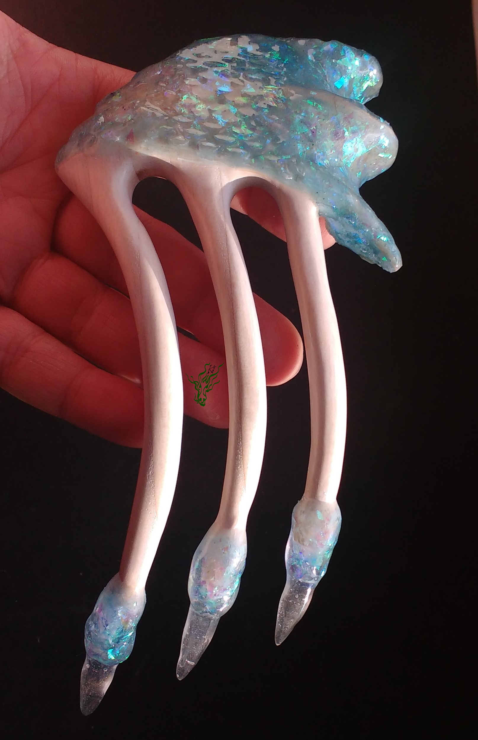 Neue Idee! Ein flacher, spiral Haarstab geschnitzt zum Weidenblatt aus klarem grünem Resin. Gekrönt von einem weißen Mondstein. Obwohl ich Helix-Formen im Allgemeinen liebe, war ich überrascht, wie bequem er funktioniert. Du schraubst ihn einfach in deine Frisur.