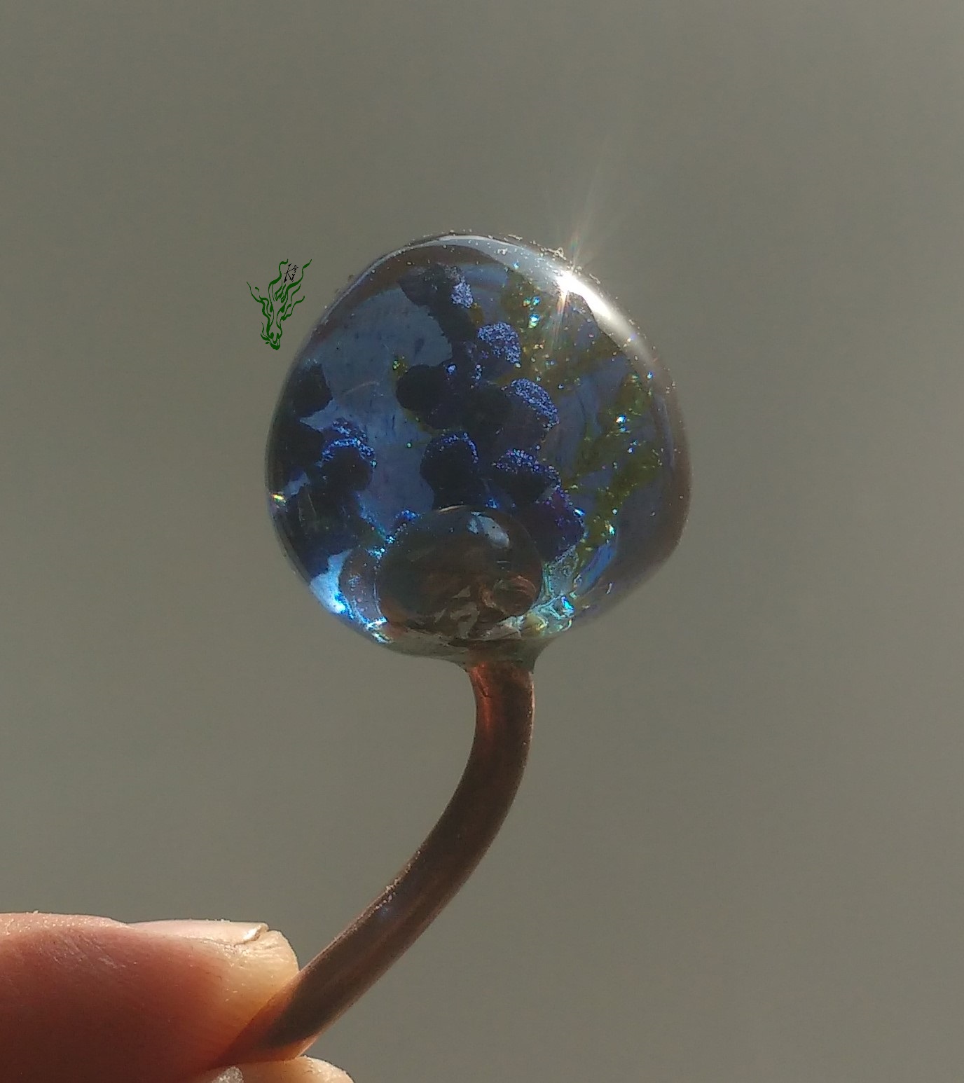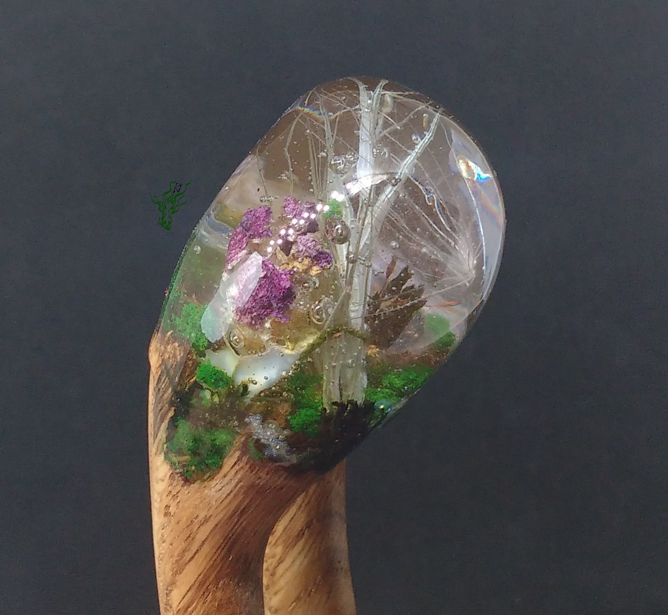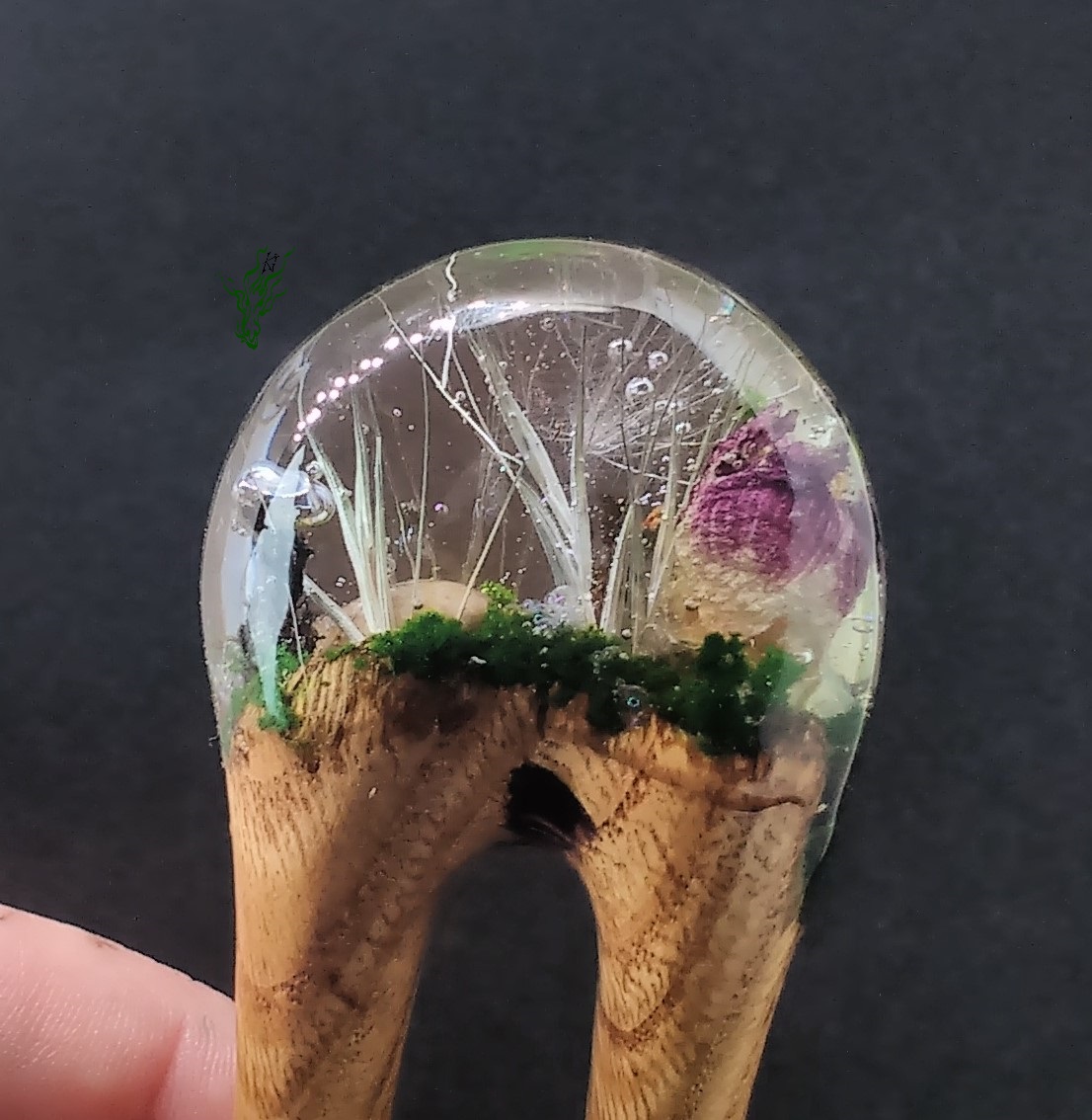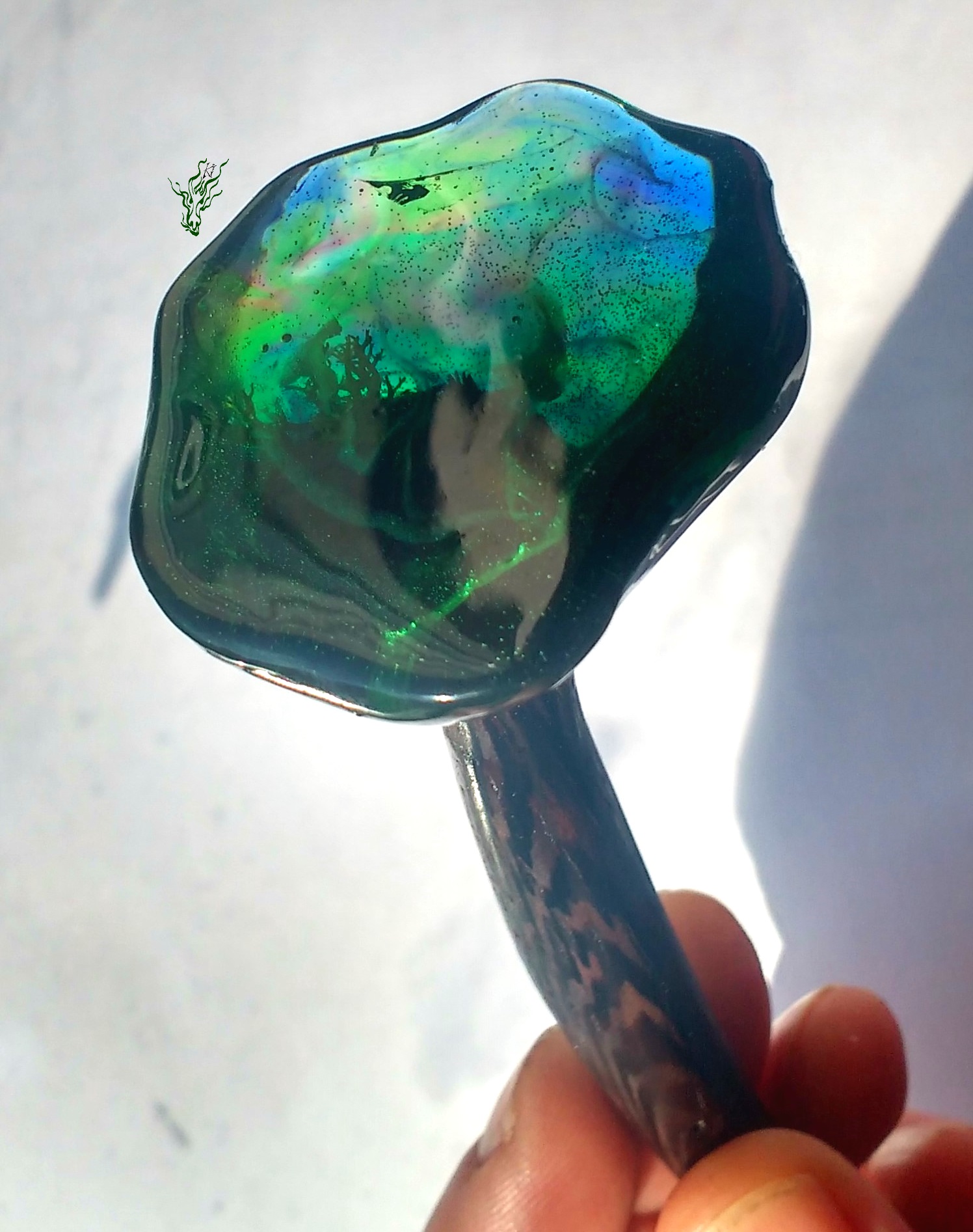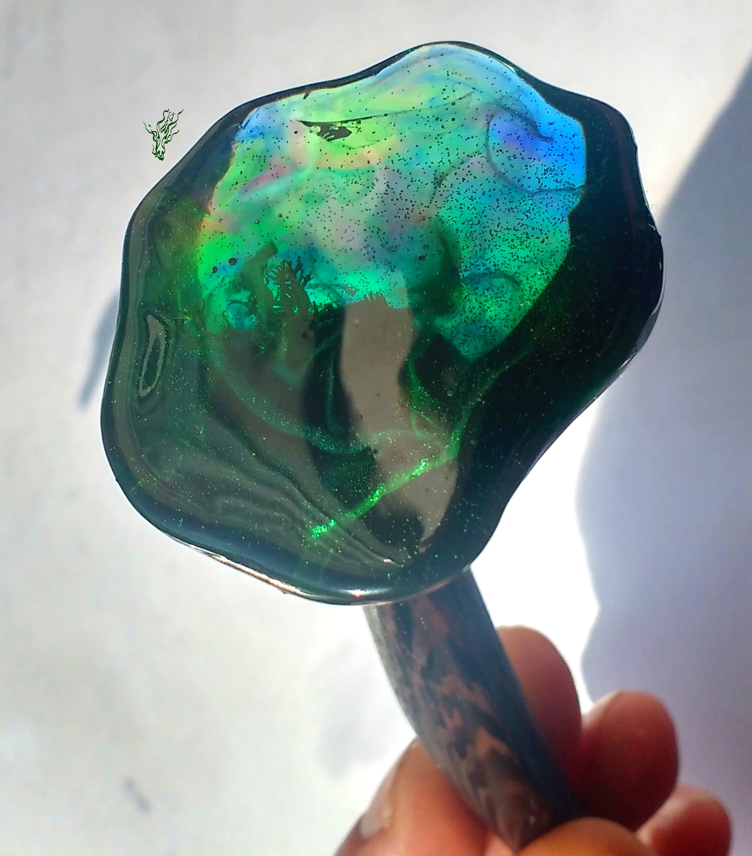 Vom Gesamteindruck eher grünlich dunkel, entfaltet dieser Gletscher erst im Sonnenlicht seine ganze Farbpalette. Auf den ersten Blick blau & grün, doch dann erkennst du, dass er in allen Regenbogenfarben schillert & eine moosig- dunkle Landschaft einschließt. Auf einem Haarstab aus in Kopfform gebogener Wenge, mit kleinem Nöpsie für optimalen Halt.