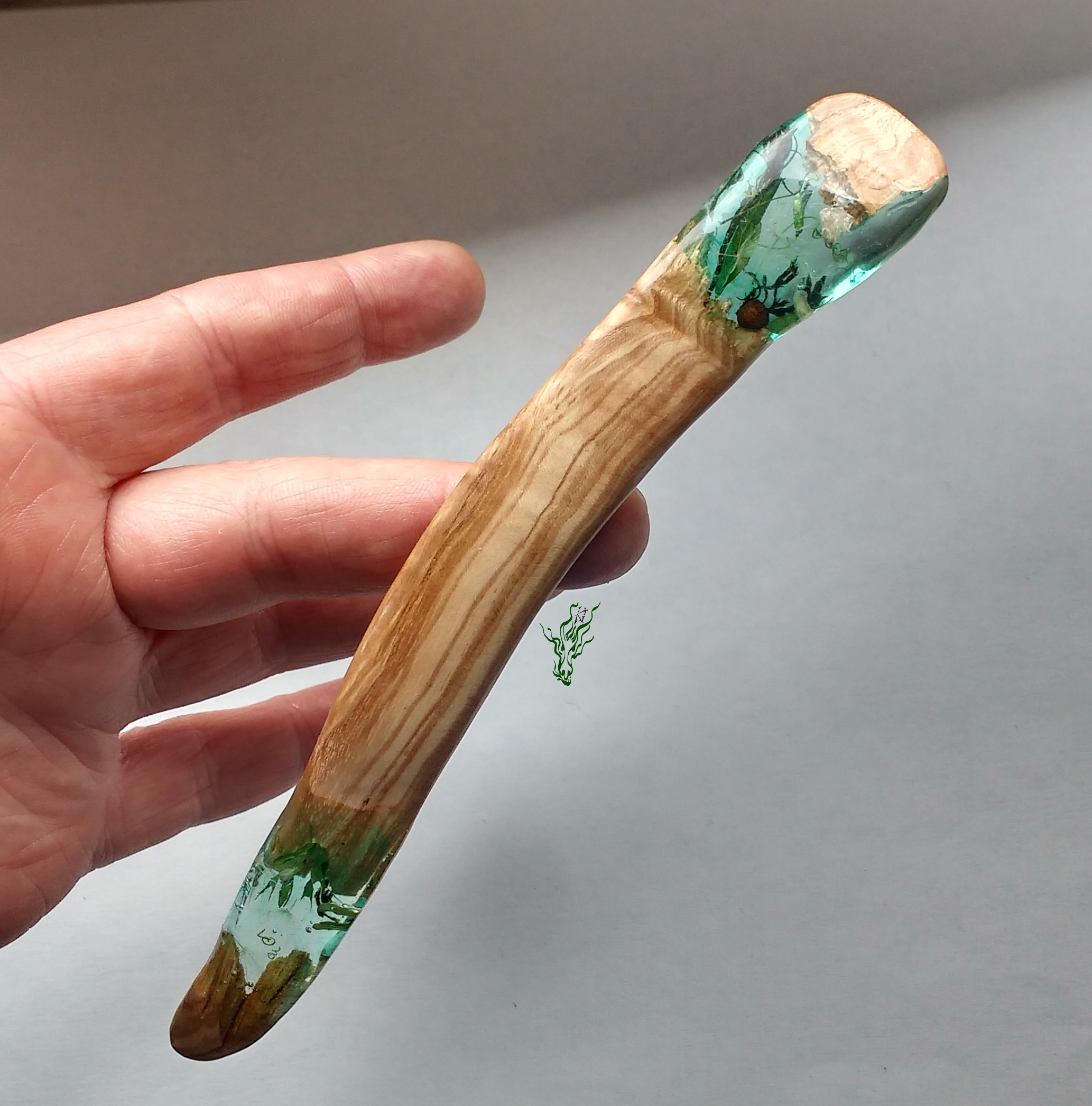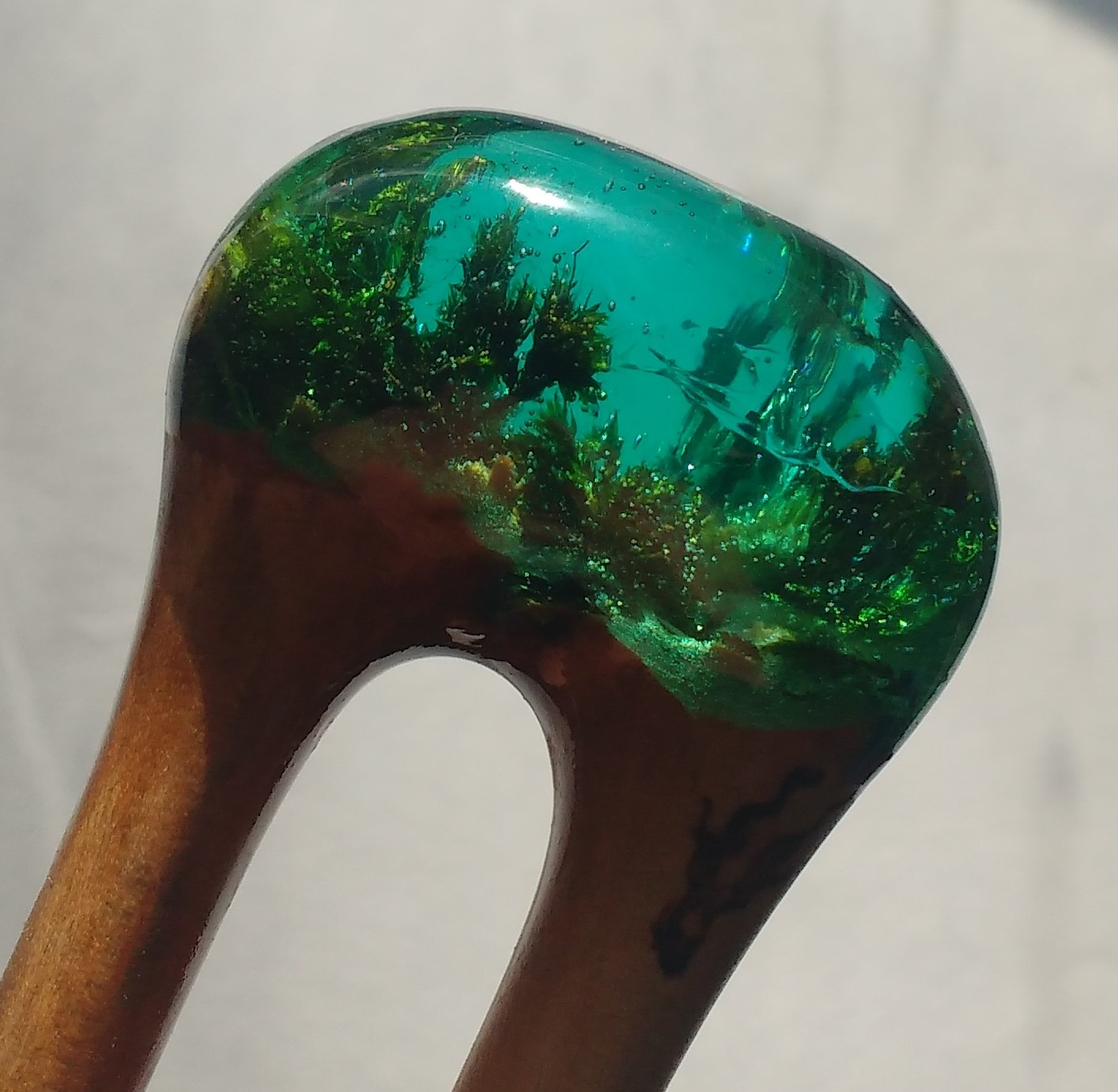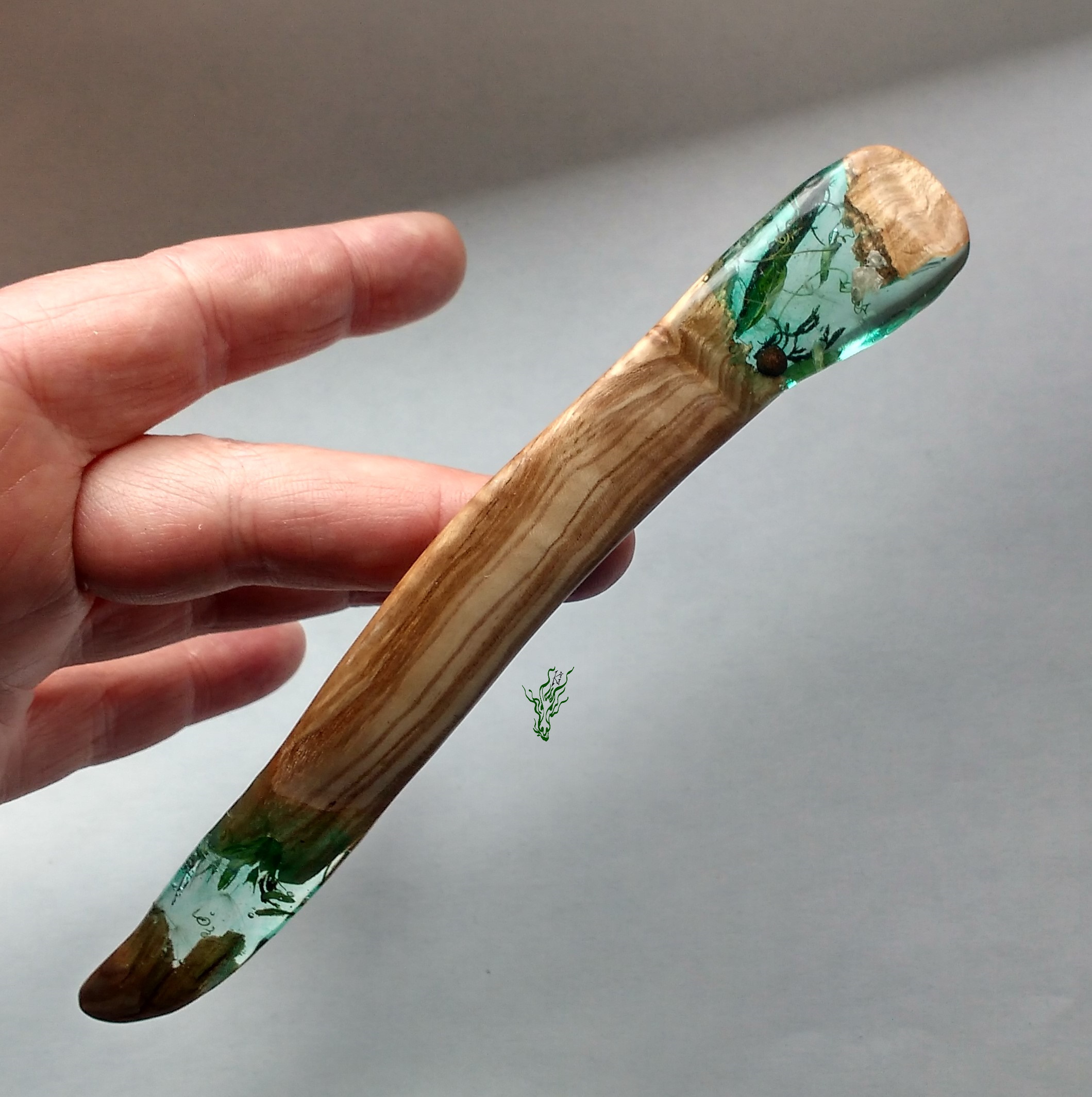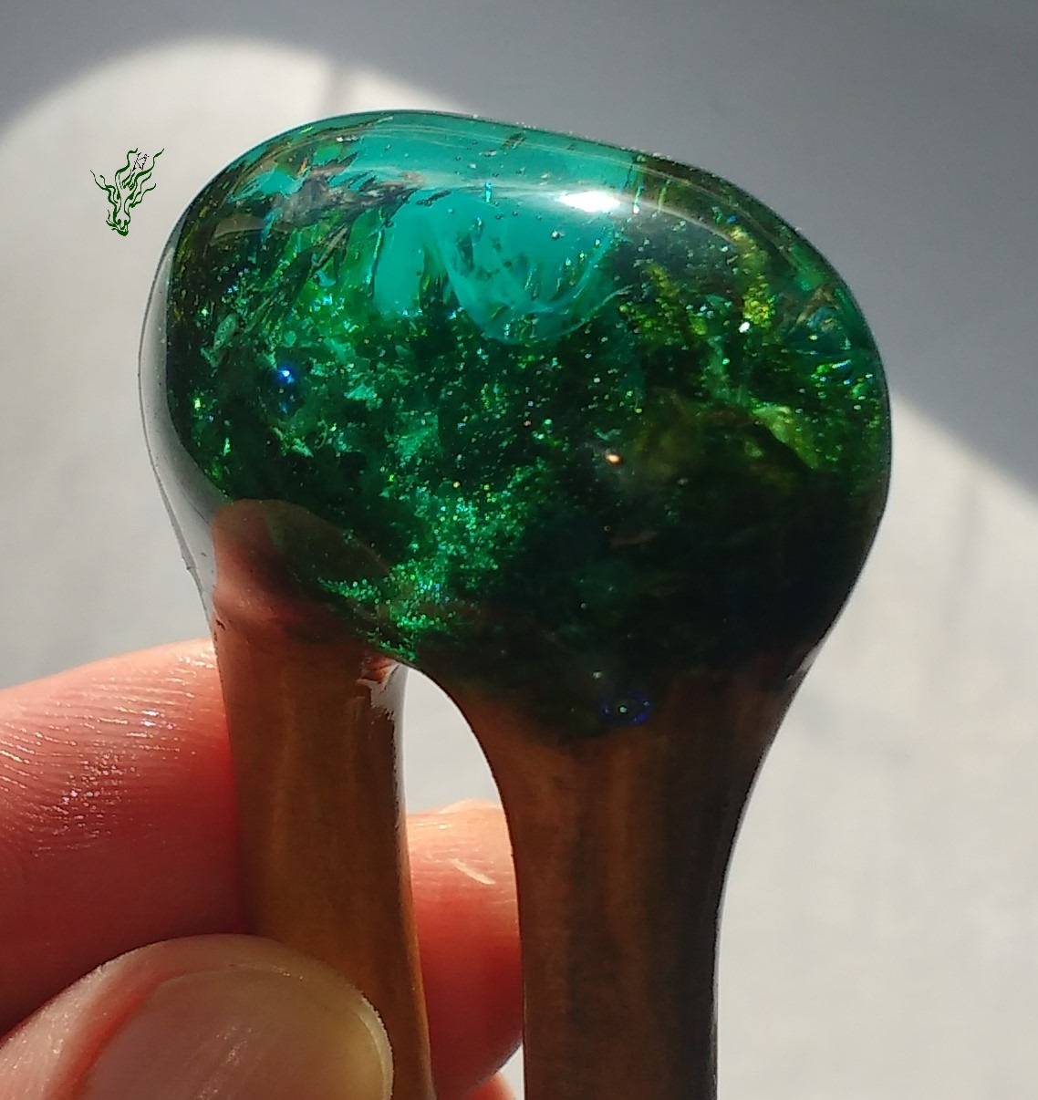 Viele verschiedene Grüntöne & Schimmerwolken haben sich in klarem Resin getroffen & zu aufregenden Mustern verswirlt. Daraus habe ich einen Haarstab in eleganter Spiralform geschnitzt – für excellenten Halt. Als Topper gibt es eine 1,5 carätige Jadeperle.