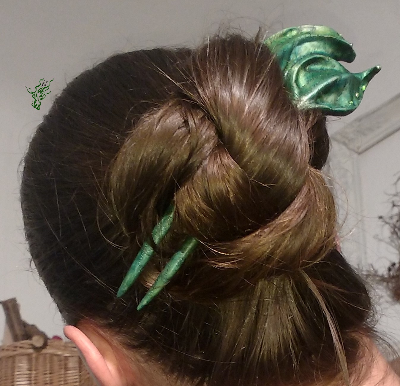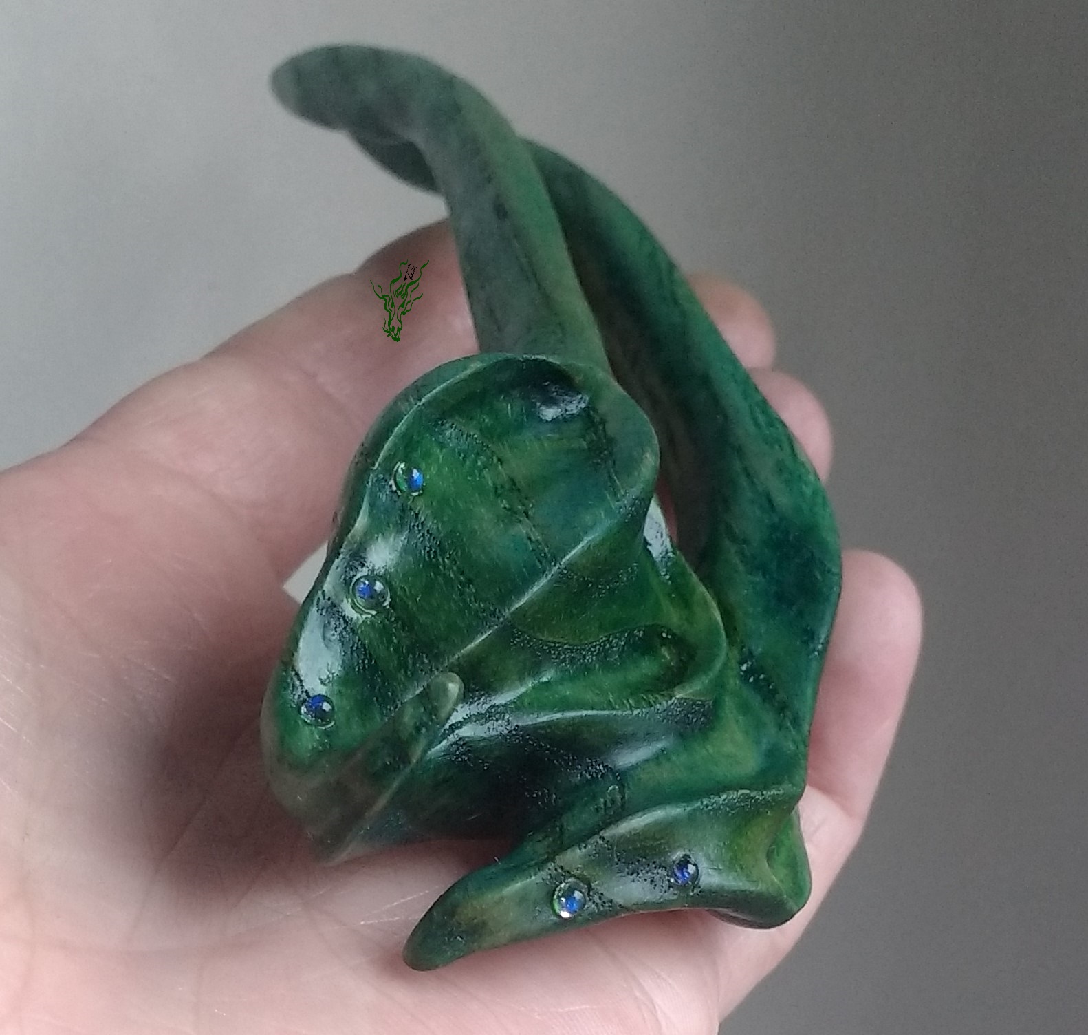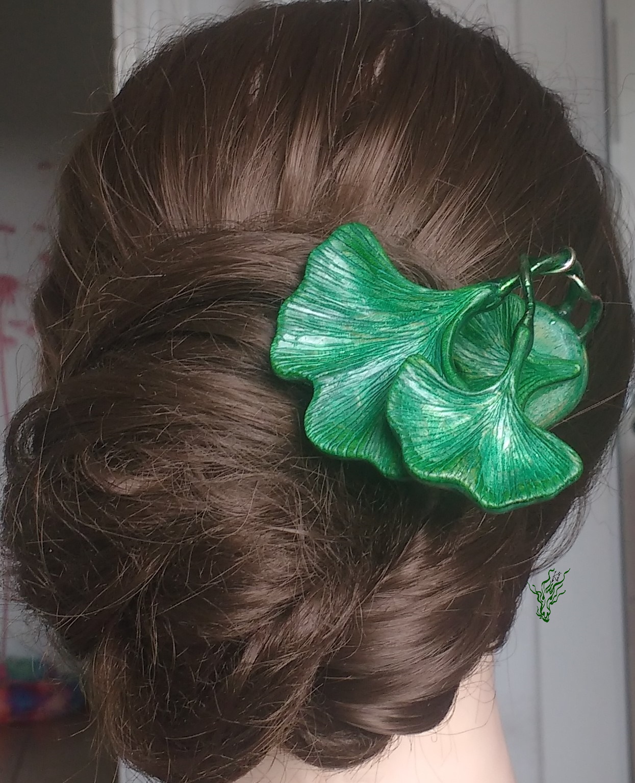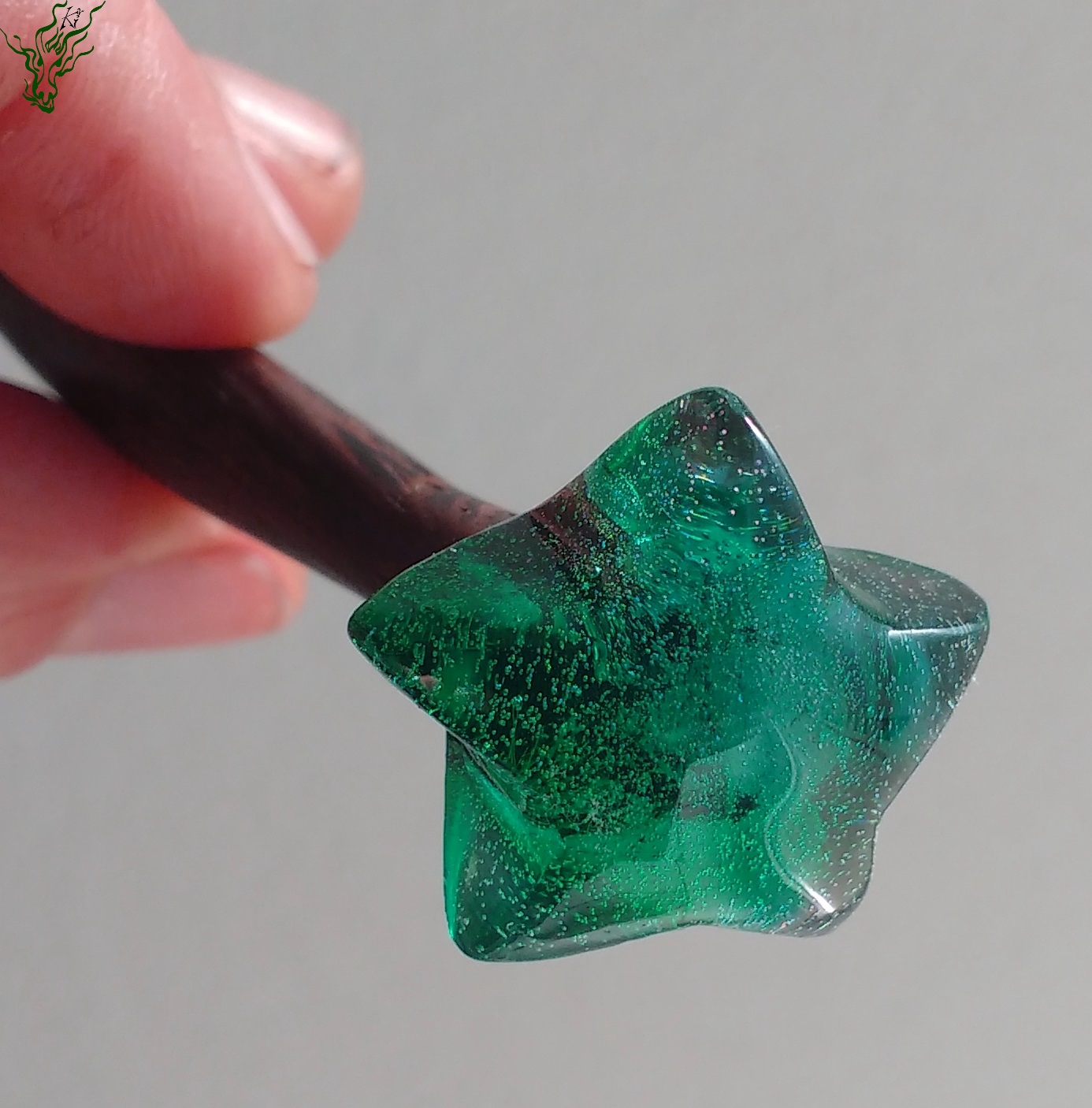 Viele verschiedene Grüntöne & Schimmerwolken haben sich in klarem Resin getroffen & zu aufregenden Mustern verswirlt. Daraus habe ich einen Haarstab in eleganter Spiralform geschnitzt – für excellenten Halt. Als Topper gibt es eine 1,5 carätige Jadeperle.